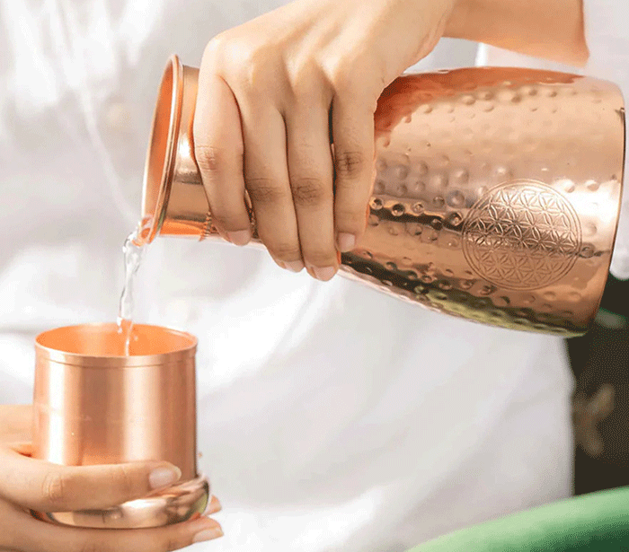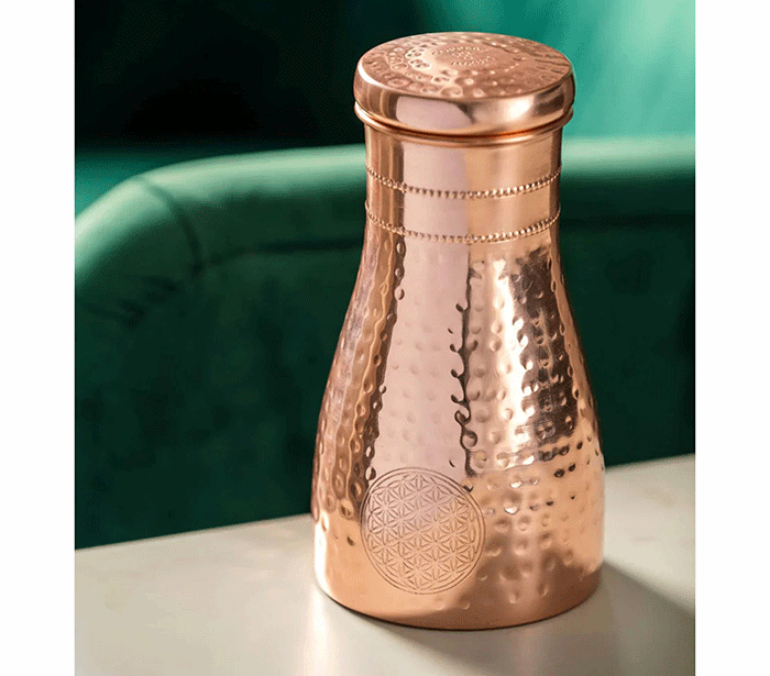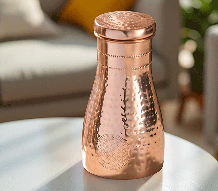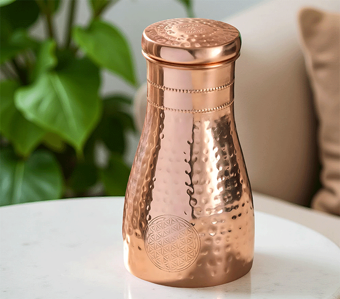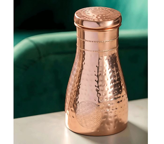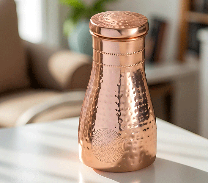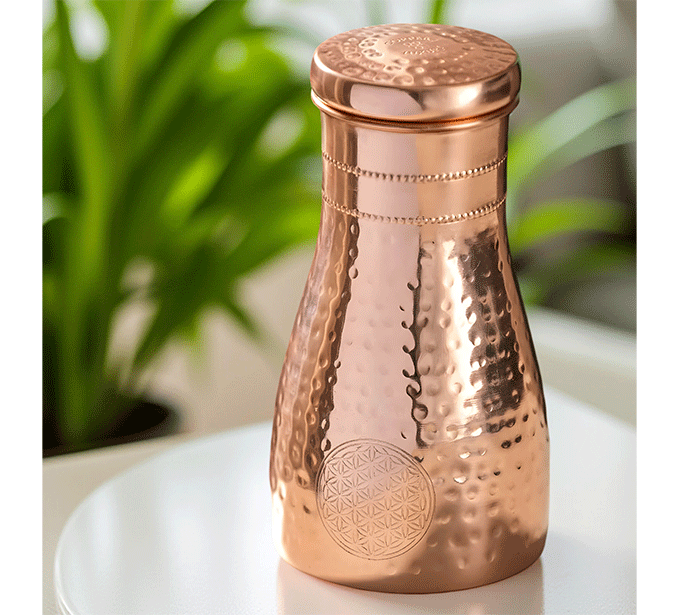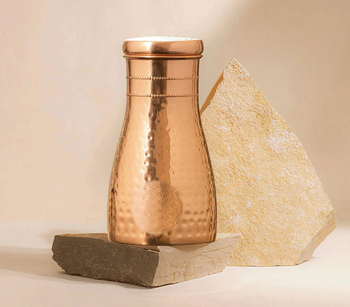 Po ajurvedi pitje vode, shranjene v bakreni posodi, pomaga uravnotežiti tri glavne energije (doše) v telesu – Vata (zrak), Pitta (ogenj) in Kapha (voda). Ko v steklenici pustimo vodo stati nekaj ur (najbolje čez noč), baker odda sledove mineralov, ki naravno prečistijo vodo in ji spremenijo vibracijo.