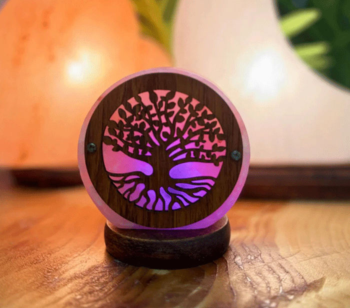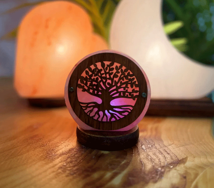 Drevo življenja, vgravirano na kovinskem ohišju, simbolizira povezanost med zemljo, nebom in notranjo močjo. Združuje naravno moč soli in duhovni pomen simbola, kar ustvarja močan energetski dodatek vašemu domu.