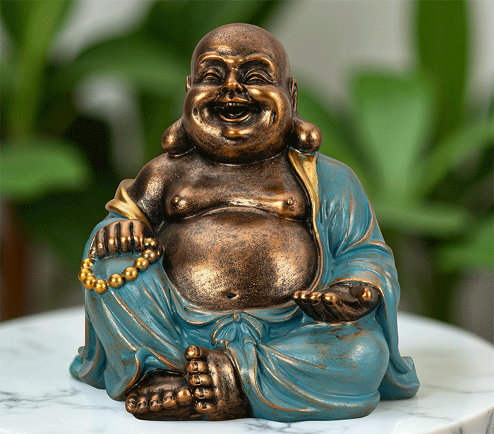 Sreča in radost: Nasmejani Buda je splošen simbol radosti, lahkotnosti in smeha, kar vpliva na prostor, kjer je postavljen, da postane bolj prijeten in optimističen.