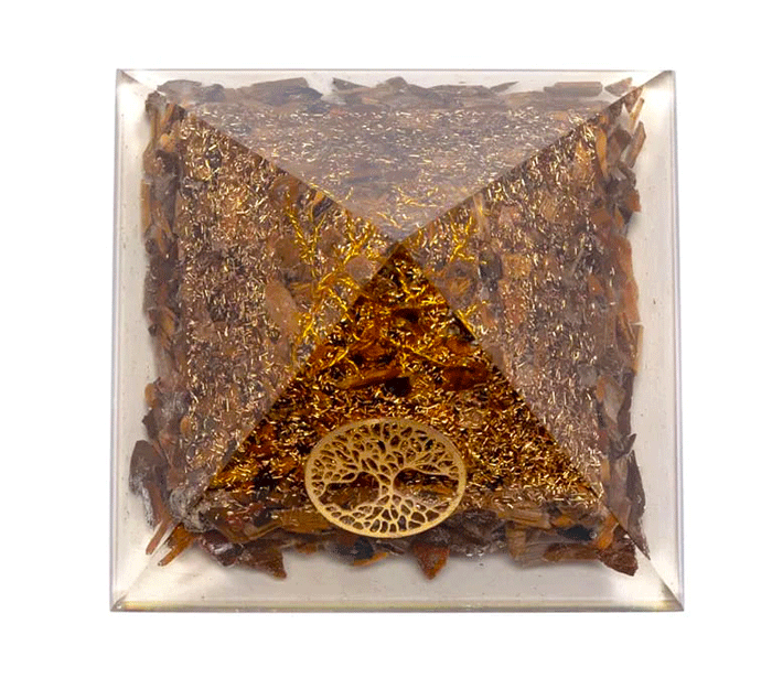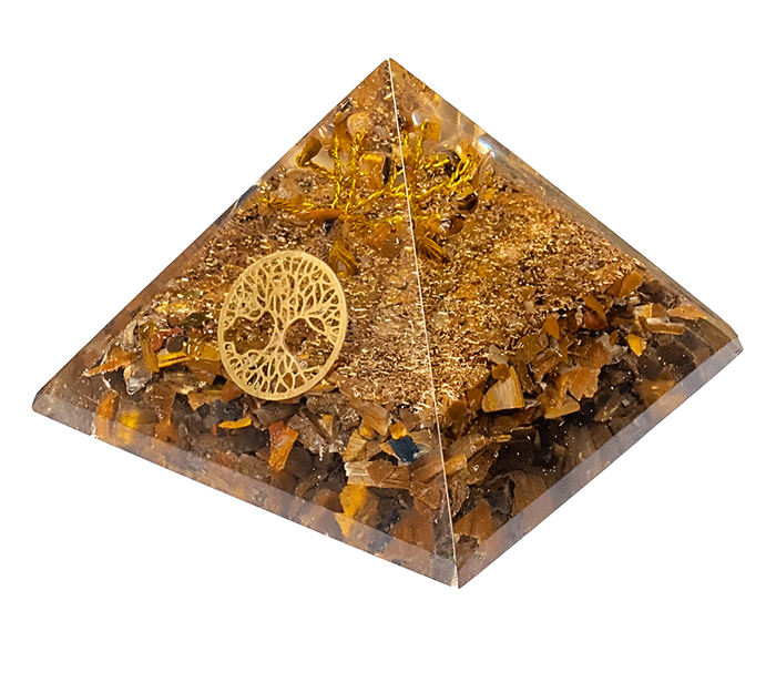 V orgonit piramidi Tigrovo oko deluje kot energijski ščit, ki pomaga zmanjševati vplive elektromagnetnega sevanja ter hkrati spodbuja občutek varnosti in ravnovesja.