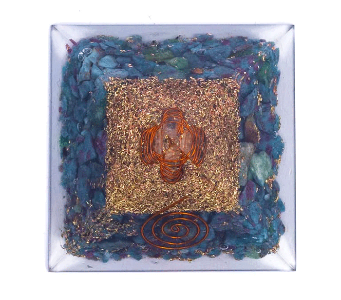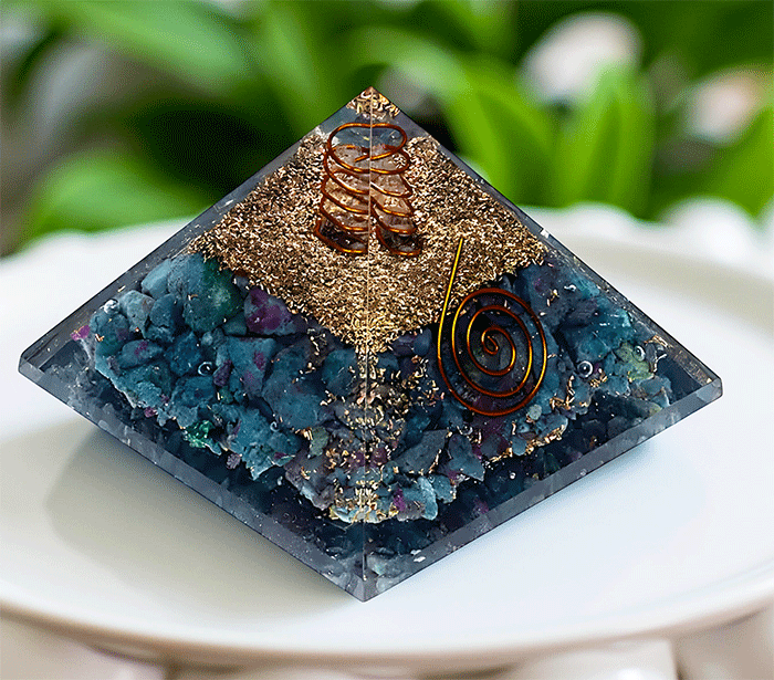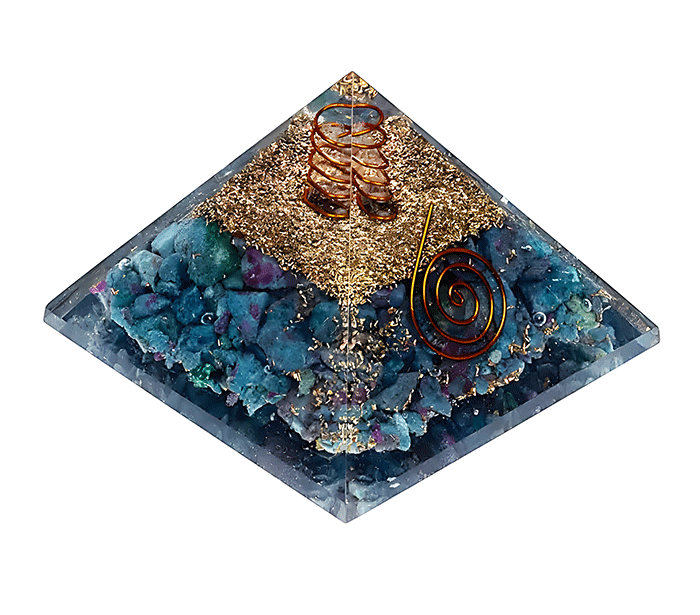 Ta edinstvena orgonit piramida proti elektromagnetnemu sevanju je izdelana iz naravnega kristala Rubina in Kianita, kakovostne smole, kovinskih delcev ter bakrene spirale, ki omogoča usmerjanje in ojačanje energije.