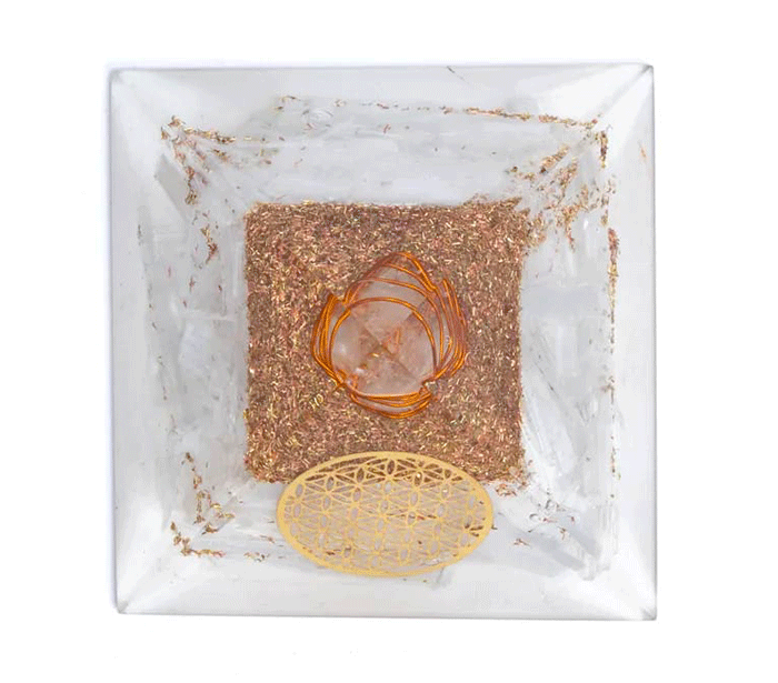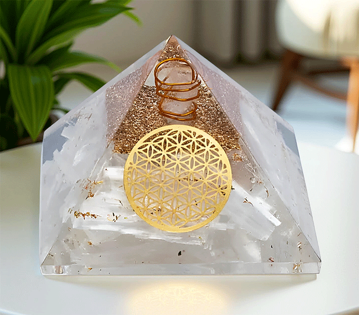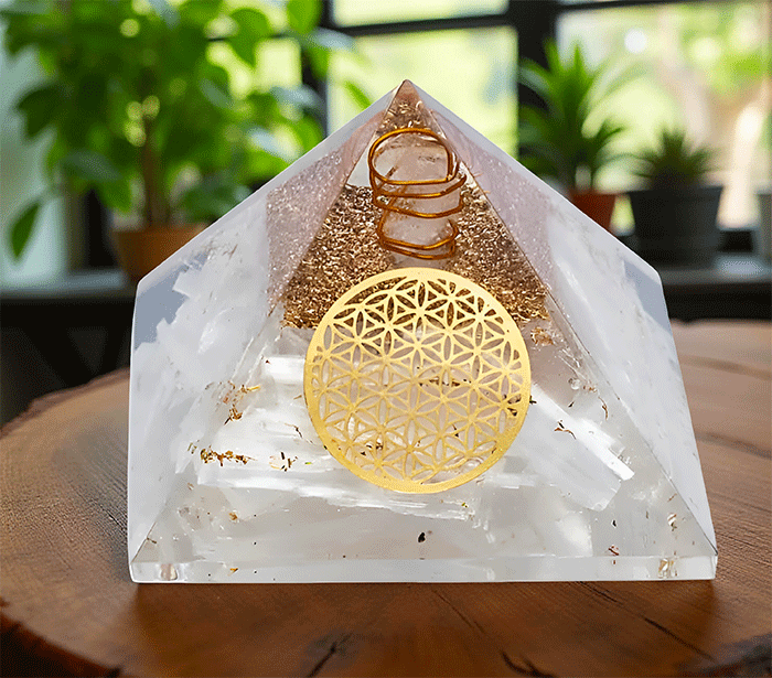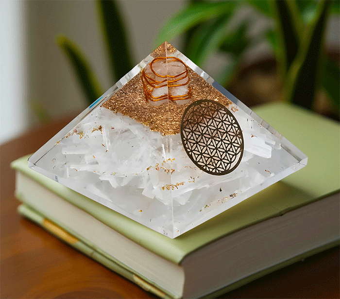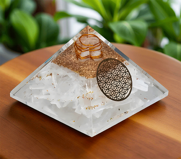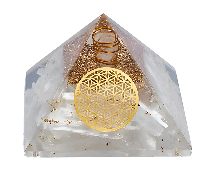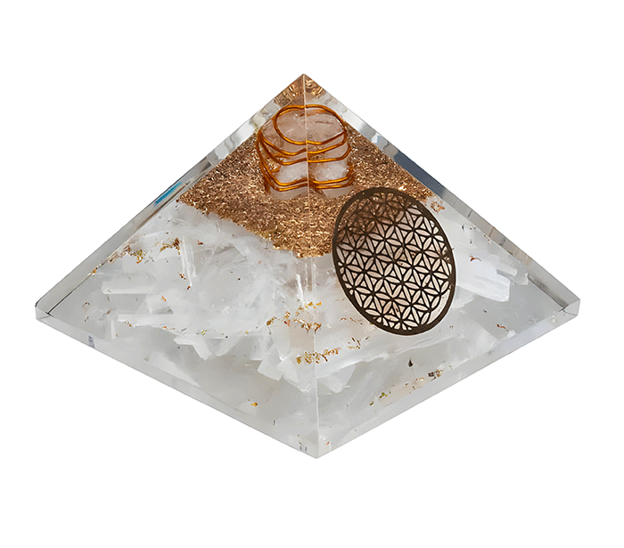V središču piramide je simbol Rože življenja, enega najstarejših svetih simbolov, ki predstavlja popolno harmonijo, ravnovesje in povezavo vsega obstoječega. Kombinacija orgonita, selenita in svetega simbola deluje kot energijski filter, ki pomaga pretvarjati negativne vplive v pozitivno energijo.
