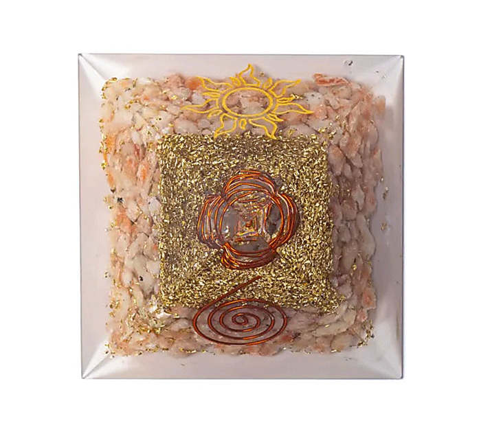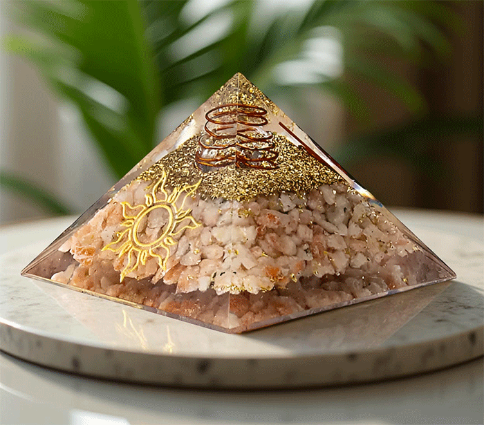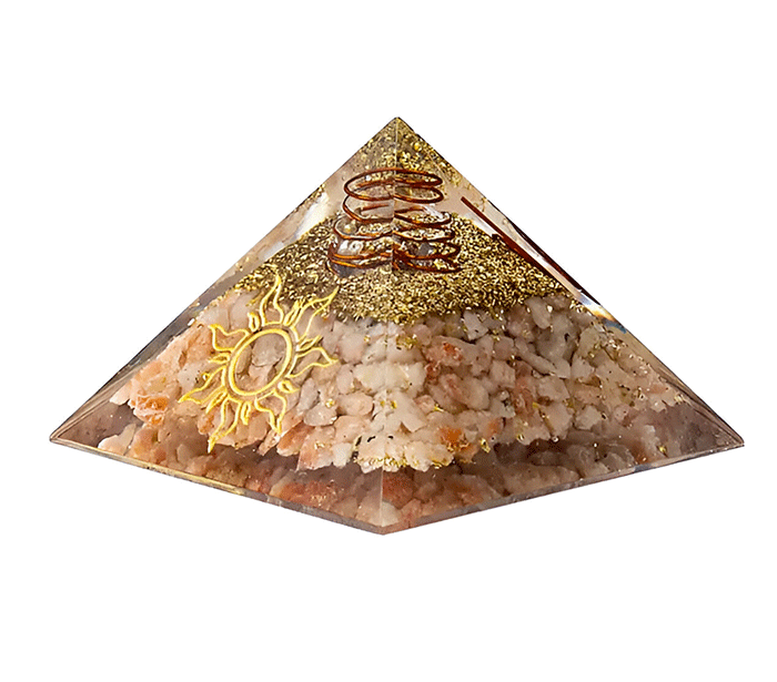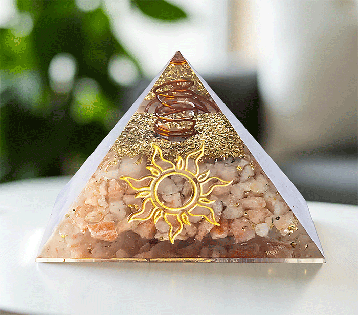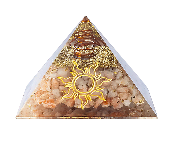 Sončev kamen je kristal vitalnosti, optimizma in notranje moči. Povezuje se z energijo sonca, prinaša toplino, samozavest in dobro razpoloženje ter pomaga razpršiti negativne energije. V orgonit piramidi dodatno okrepi zaščitno in harmonizacijsko delovanje.