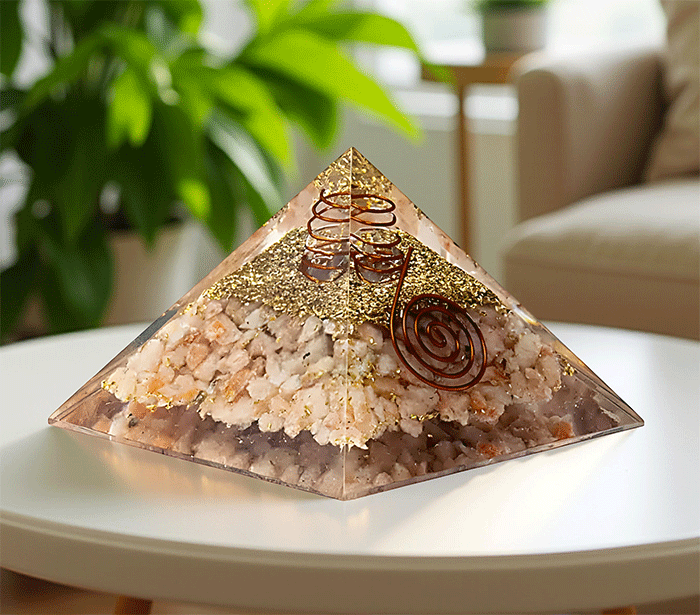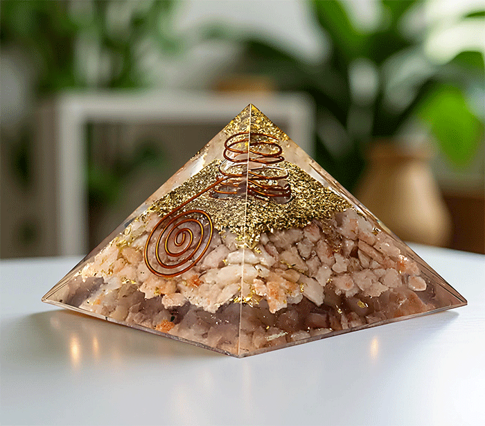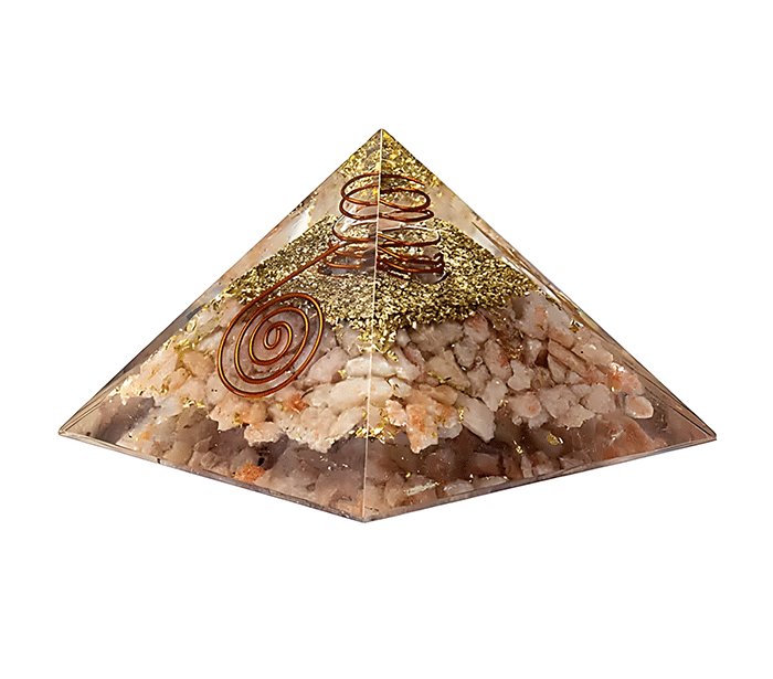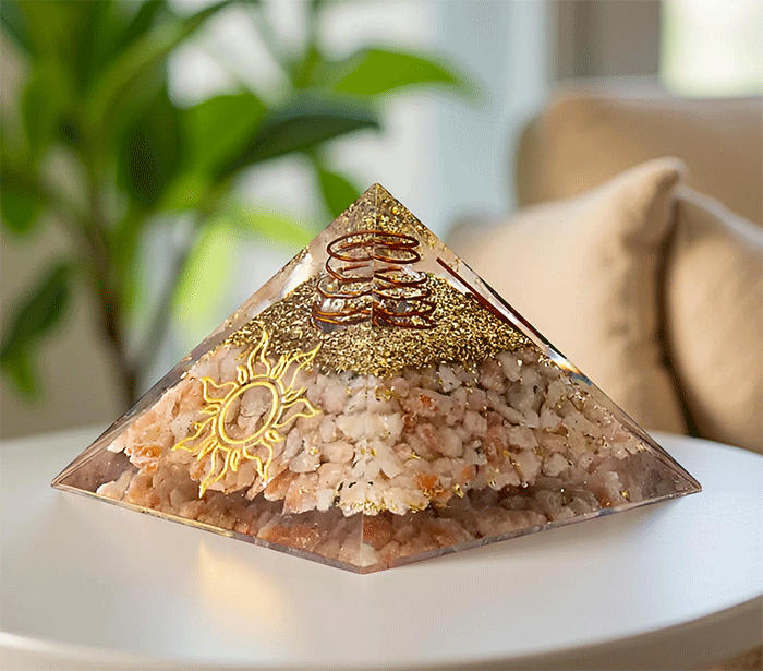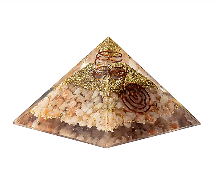 Ta edinstvena orgonit piramida proti sevanju vsebuje naravni kristal Sončev kamen, smolo, kovinske delce in bakreno spiralo, ki delujejo sinergijsko ter pomagajo pretvarjati negativno energijo v pozitivno. Primerna je za dom, pisarno, spalnico ali meditacijski prostor.