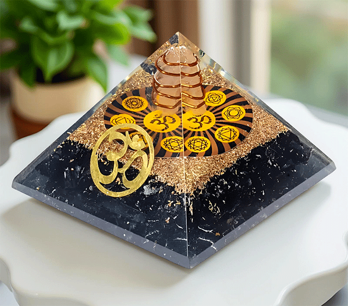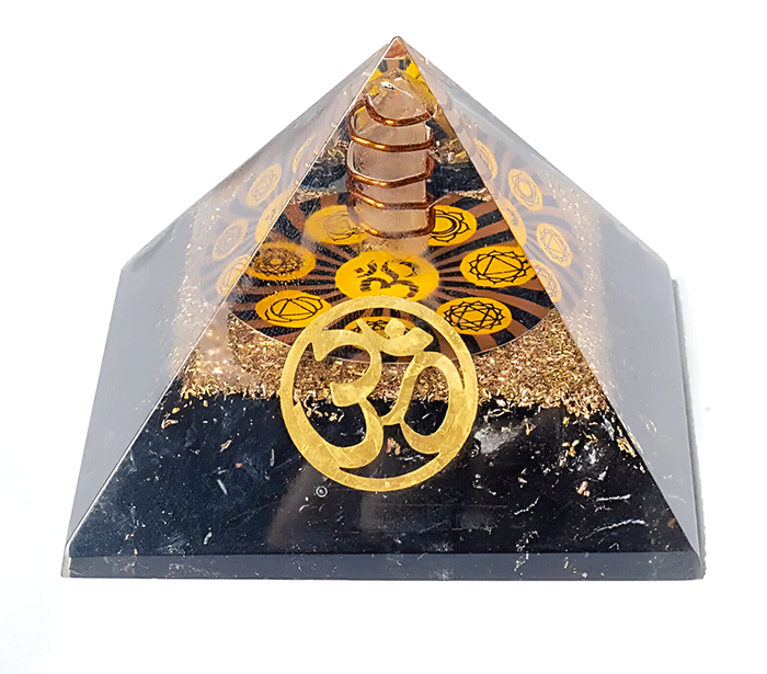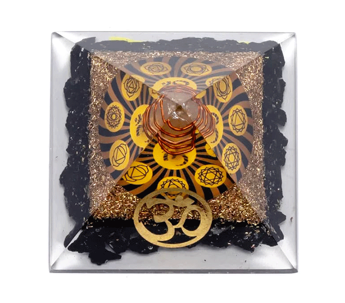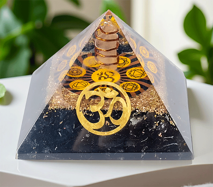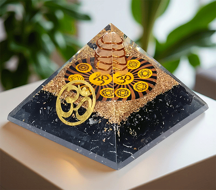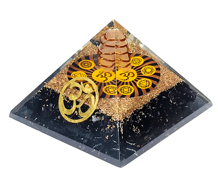 Orgonit piramida s črnim Turmalinom, simboli čaker in AUM združuje moč naravnih kristalov, svete geometrije in simbolike ter prinaša zaščito, ravnovesje in pozitivno energijo v vsak prostor.
