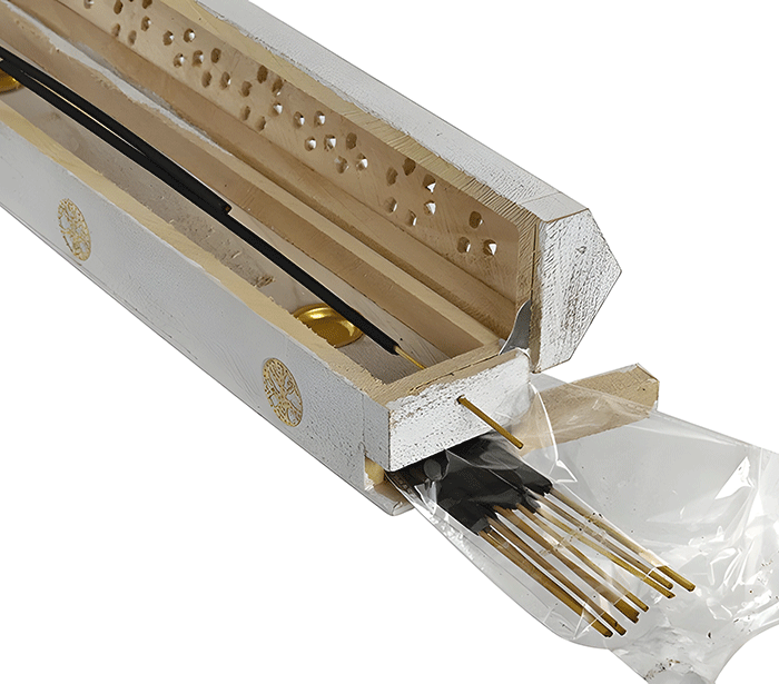 Uporaba: Dišečo palčko preprosto namestimo na zgornjo površino podstavka in jo prižgemo. Med gorenjem pepel nežno pada na podolgovat podstavek, kar zagotavlja čisto uporabo. Preostale palčke lahko priročno shranite v notranjosti škatle, da ostanejo varno pospravljene in zaščitene.