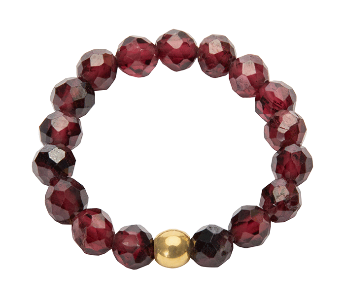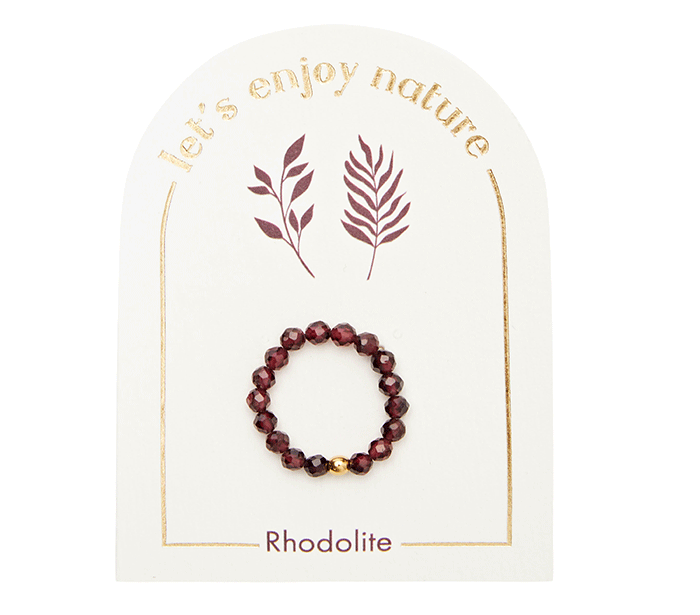 Naravni kristali rodolita so nanizani na elastičen laks in dopolnjeni z majhno kroglico iz nerjavečega jekla, ki prstanu doda eleganten in sodoben videz.