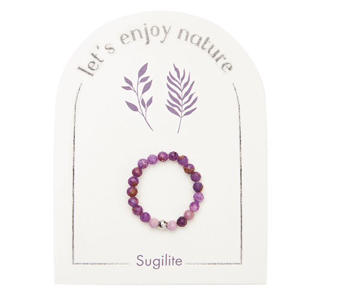 Zaradi elastične zasnove se prstan iz Sugilita udobno prilega prstu, kombinacija naravnih kristalov in nerjavečega jekla pa zagotavlja dolgo življenjsko dobo in sodoben videz.