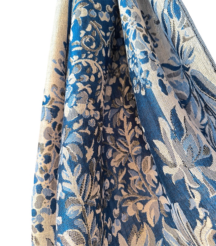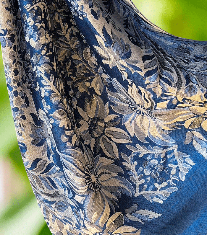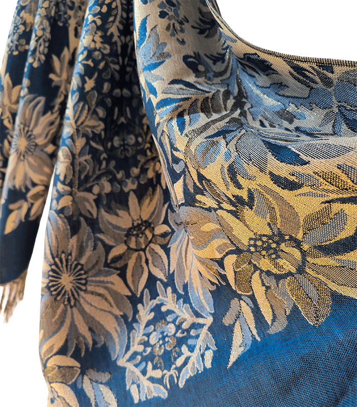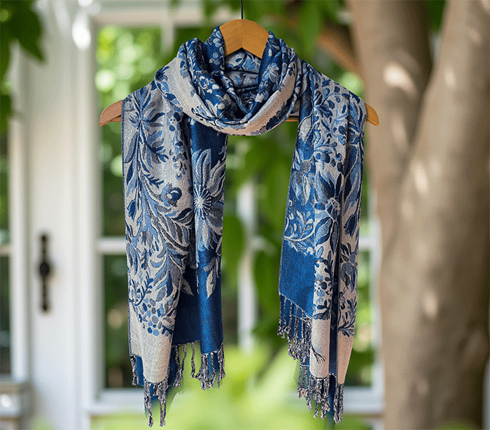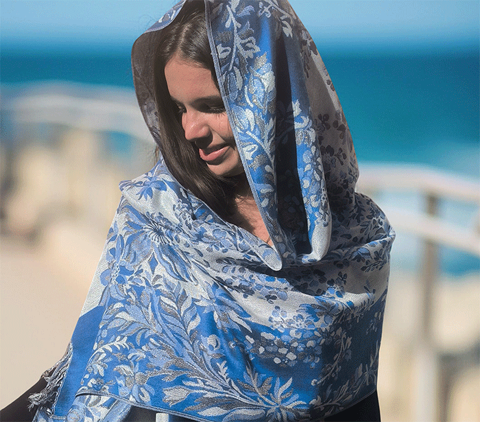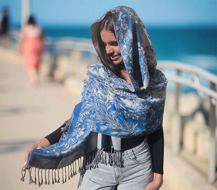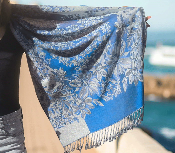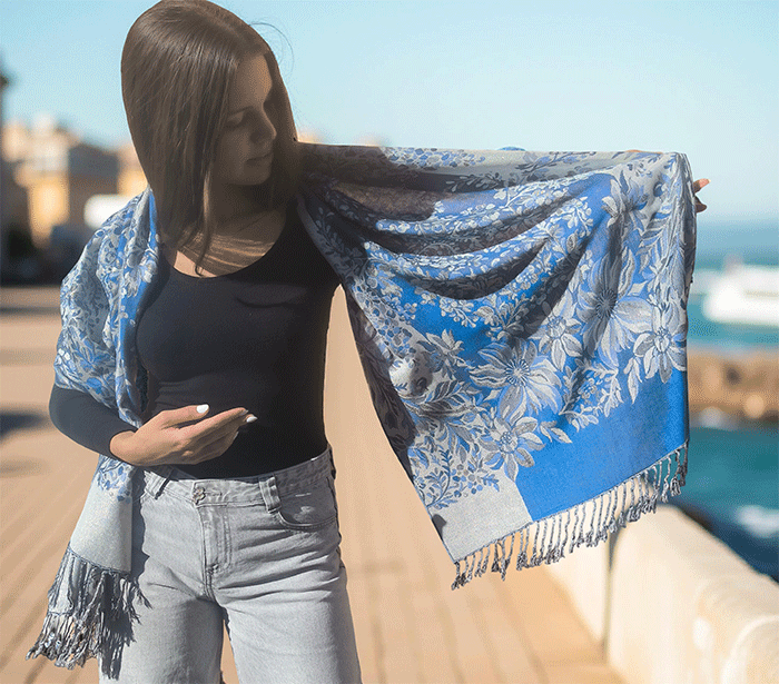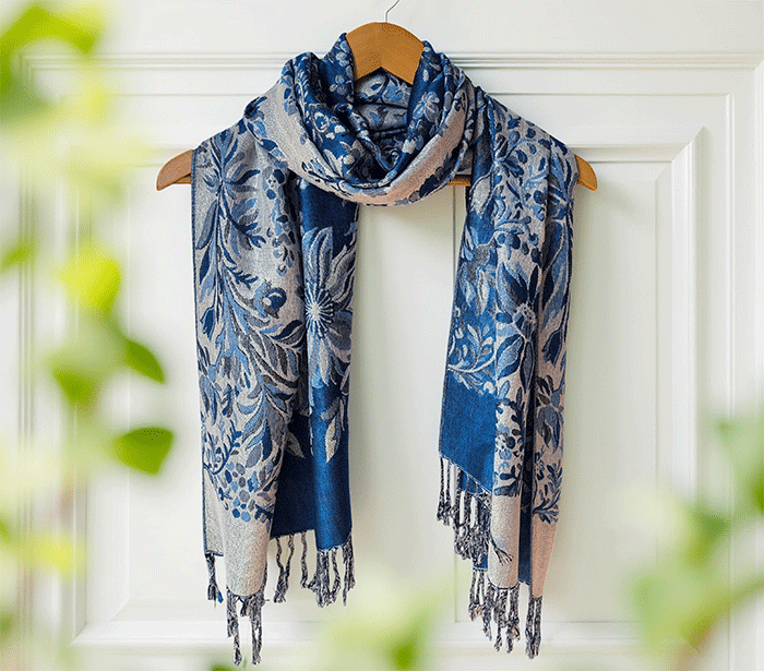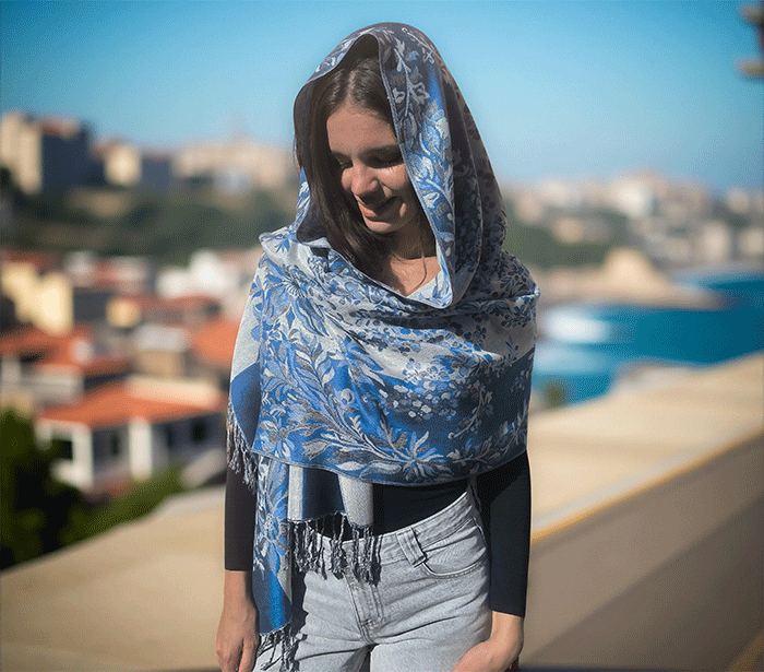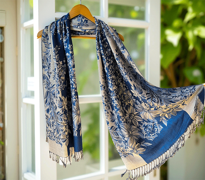 Ta pašmina šal združuje toplino in lahkotnost, zato ga lahko nosite kot zimski šal ali prehodni šal v hladnejših dneh. Njegov nežen cvetlični vzorec in rahlo svetlikajoča površina ustvarjata čudovit videz, ki poudari ženstvenost in občutek prazničnega razkošja – popoln spremljevalec ob vsaki priložnosti.