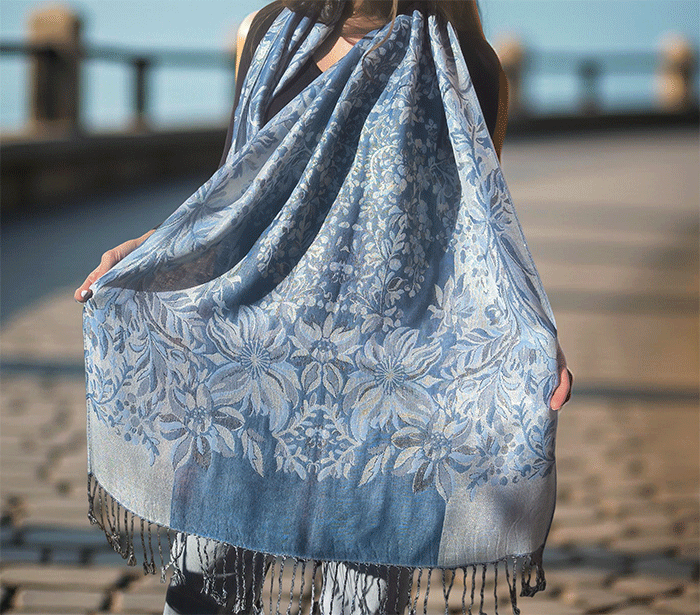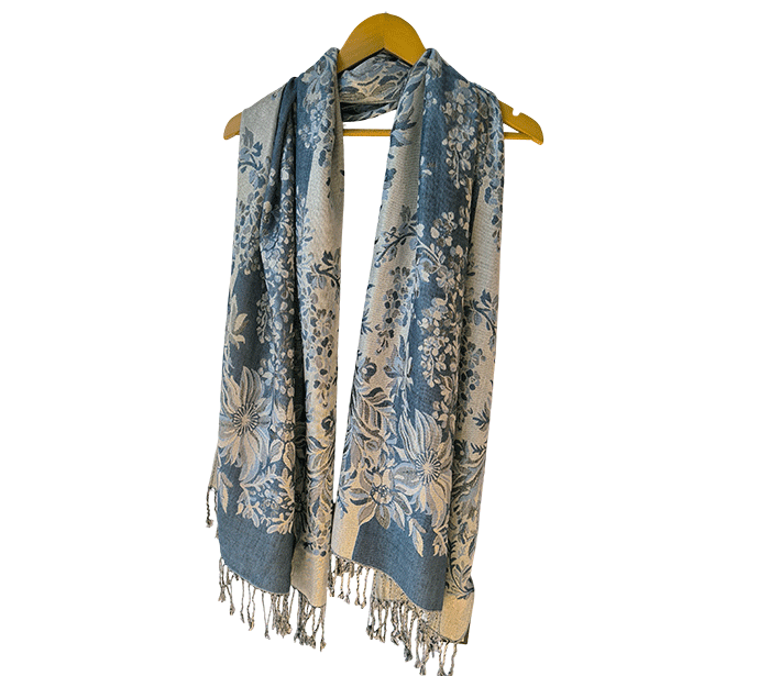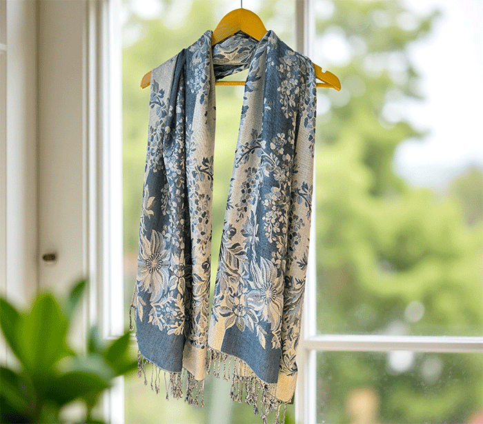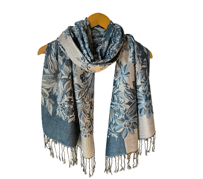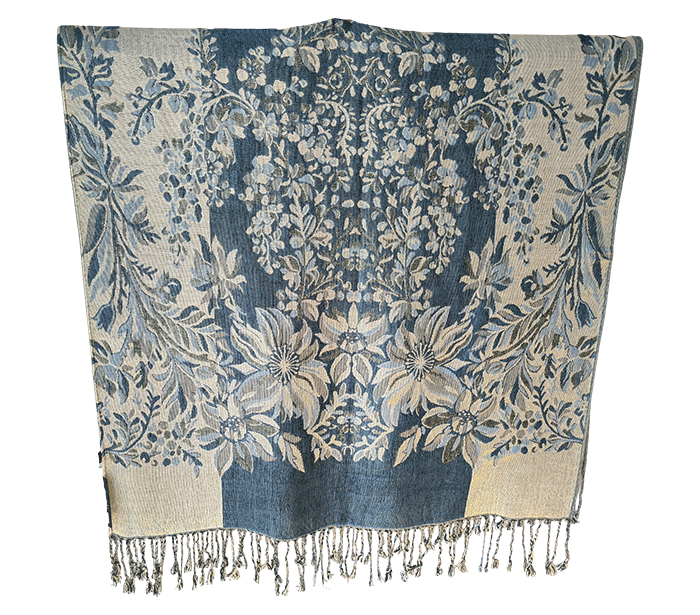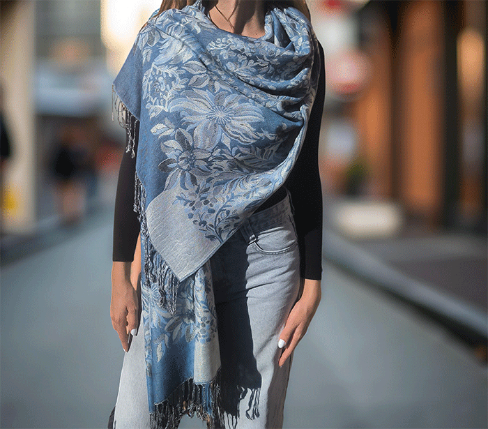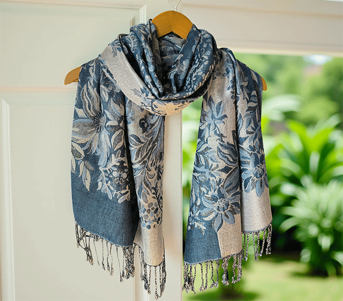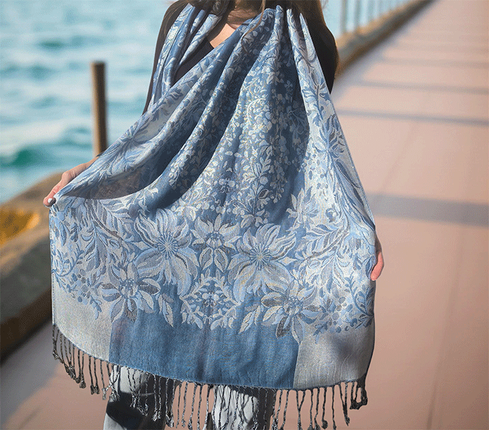 Ta pašmina šal združuje toplino in lahkotnost, zato ga lahko nosite kot zimski šal ali prehodni šal v hladnejših dneh. Njegov nežen cvetlični vzorec in rahlo svetlikajoča površina ustvarjata čudovit videz, ki poudari ženstvenost in občutek prazničnega razkošja – popoln spremljevalec ob vsaki priložnosti.