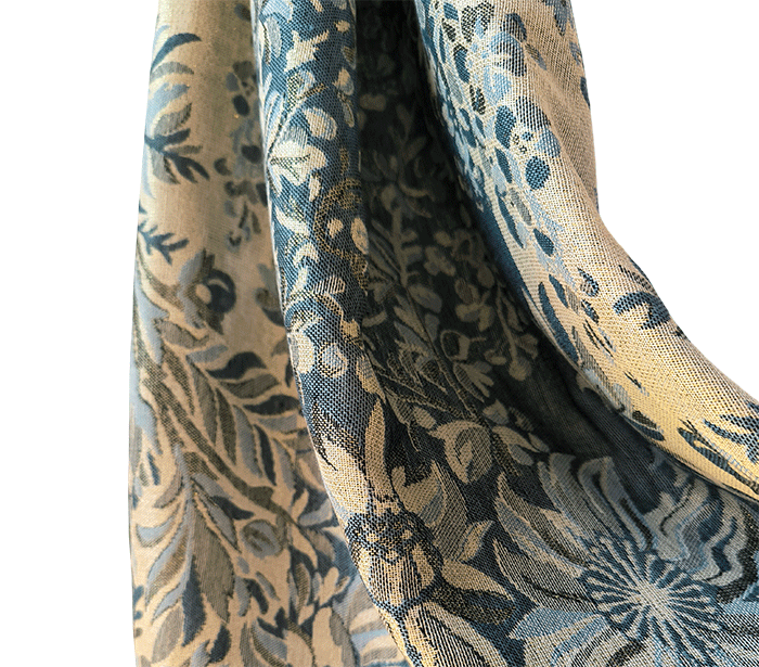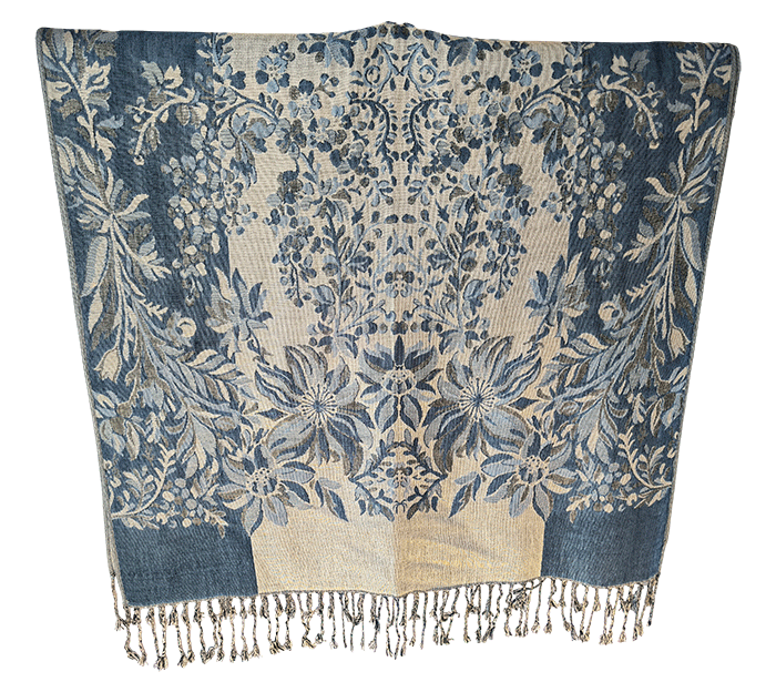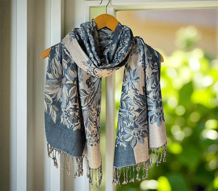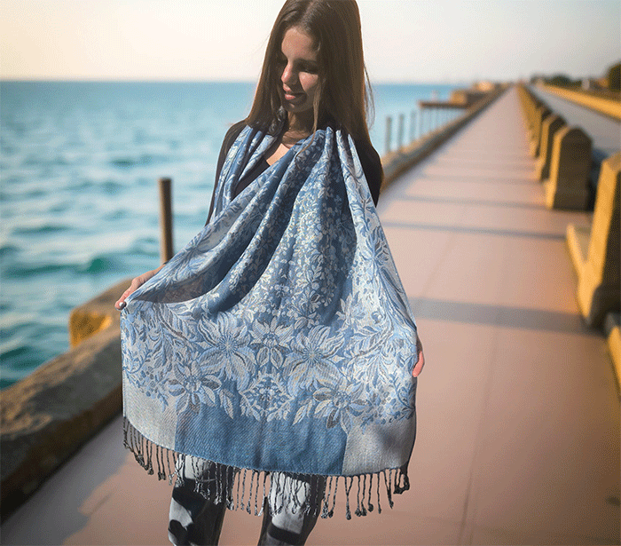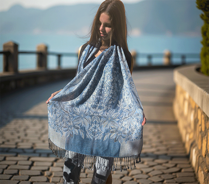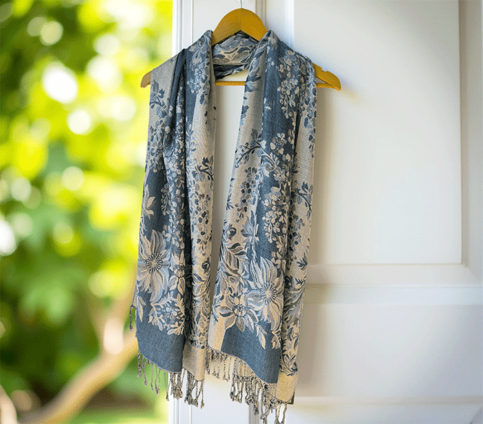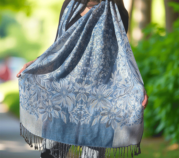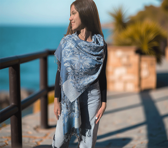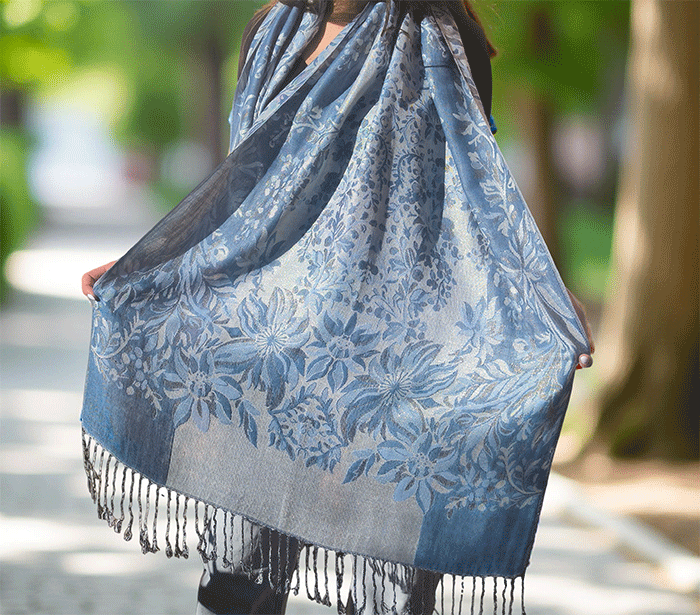 Ta pašmina šal združuje toplino in lahkotnost, zato ga lahko nosite kot zimski šal ali prehodni šal v hladnejših dneh. Njegov nežen cvetlični vzorec in rahlo svetlikajoča površina ustvarjata čudovit videz, ki poudari ženstvenost in občutek prazničnega razkošja – popoln spremljevalec ob vsaki priložnosti.