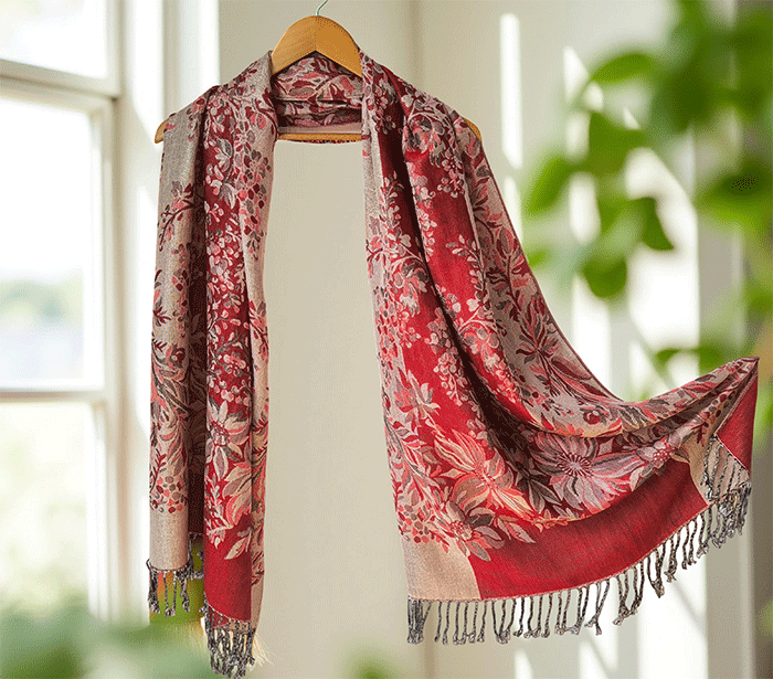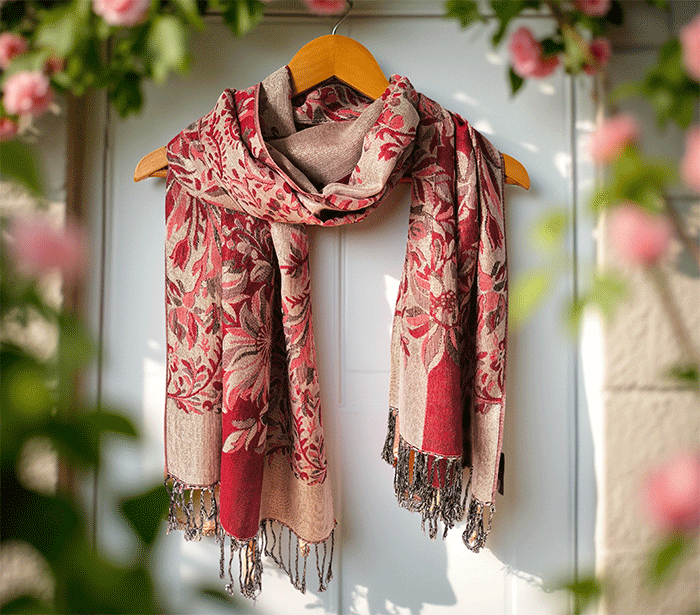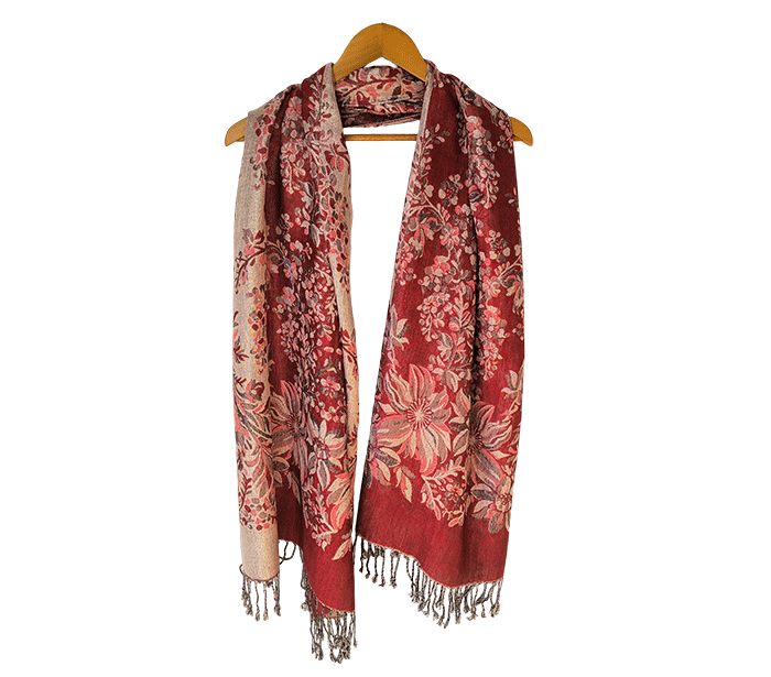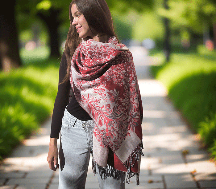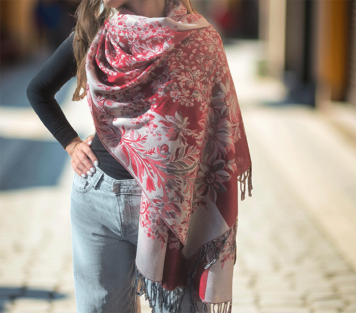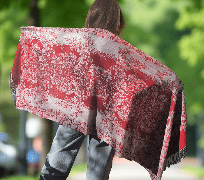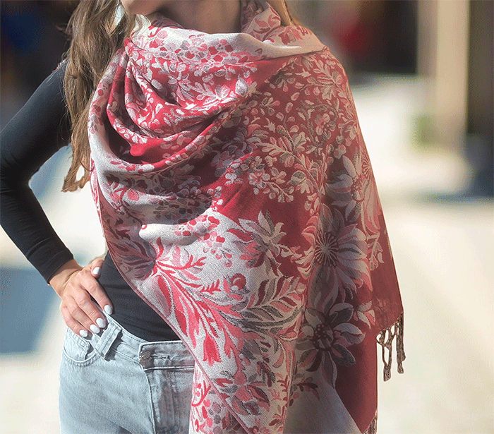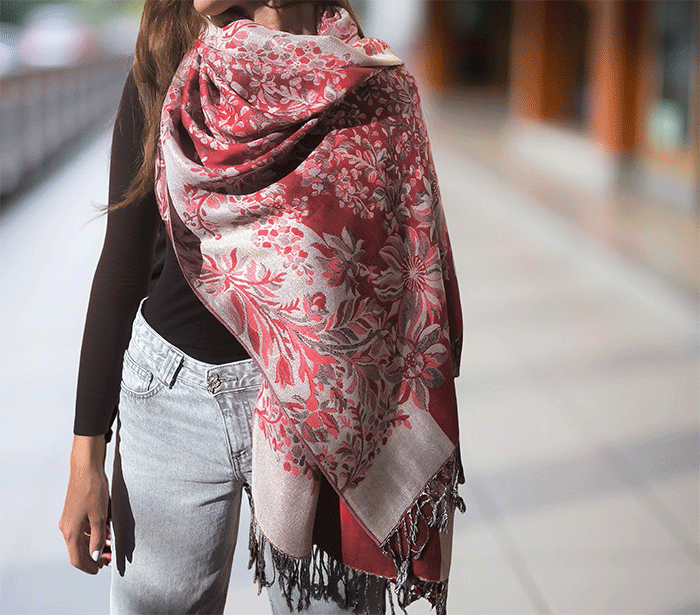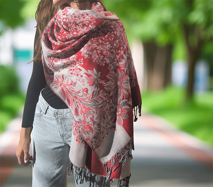 Ta pašmina šal združuje toplino in lahkotnost, zato ga lahko nosite kot zimski šal ali prehodni šal v hladnejših dneh. Njegov nežen cvetlični vzorec in rahlo svetlikajoča površina ustvarjata čudovit videz, ki poudari ženstvenost in občutek prazničnega razkošja – popoln spremljevalec ob vsaki priložnosti.