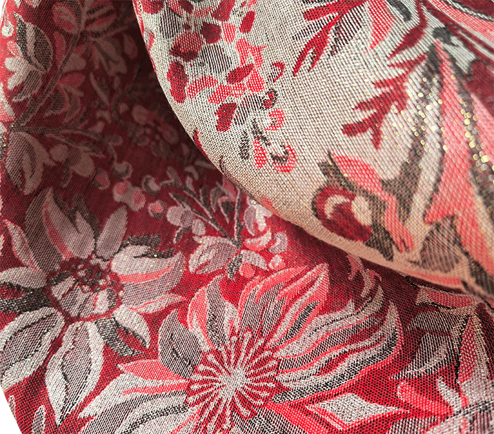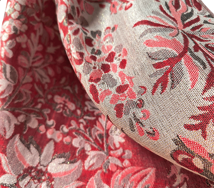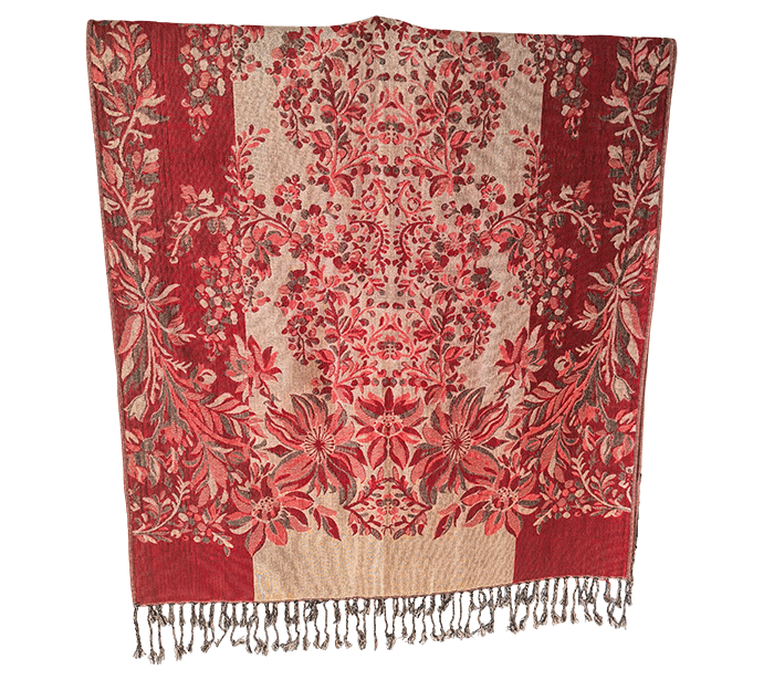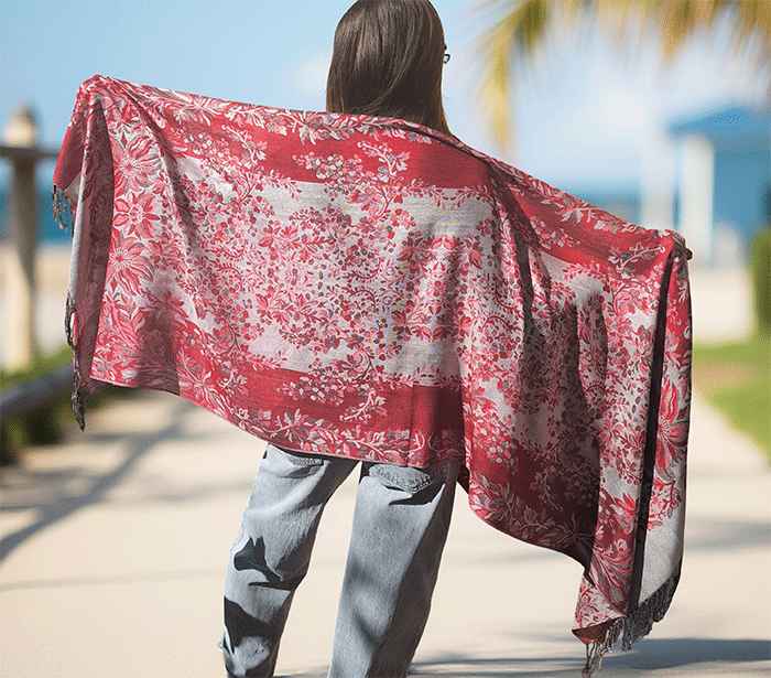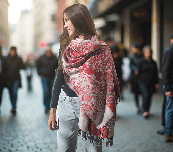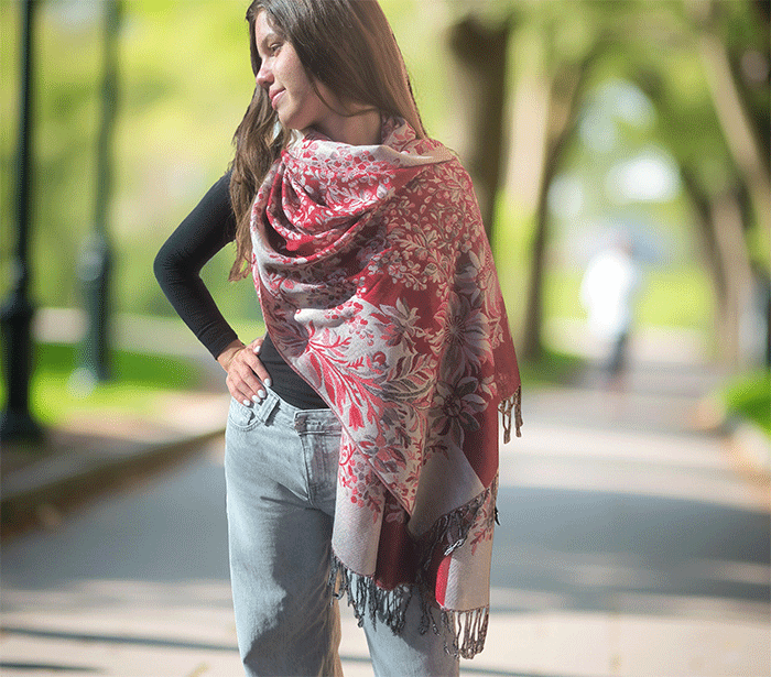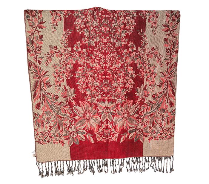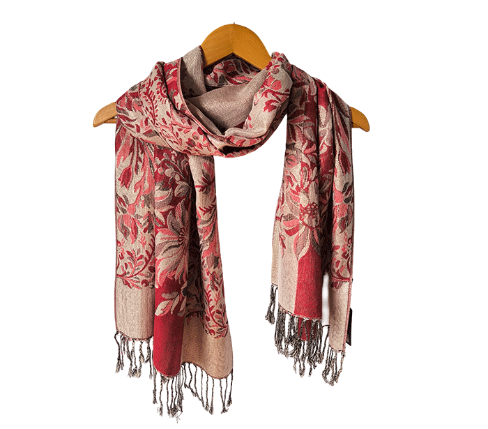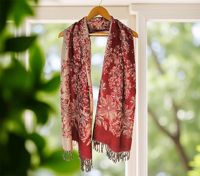 Ta pašmina šal združuje toplino in lahkotnost, zato ga lahko nosite kot zimski šal ali prehodni šal v hladnejših dneh. Njegov nežen cvetlični vzorec in rahlo svetlikajoča površina ustvarjata čudovit videz, ki poudari ženstvenost in občutek prazničnega razkošja – popoln spremljevalec ob vsaki priložnosti.