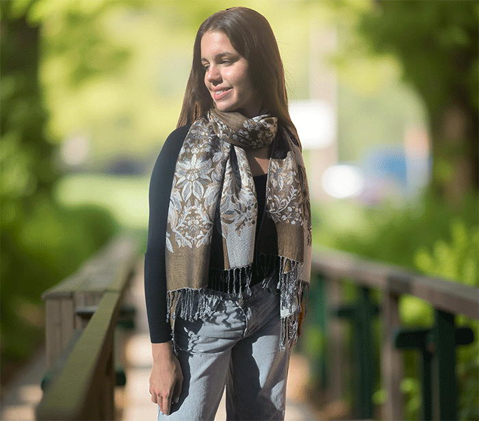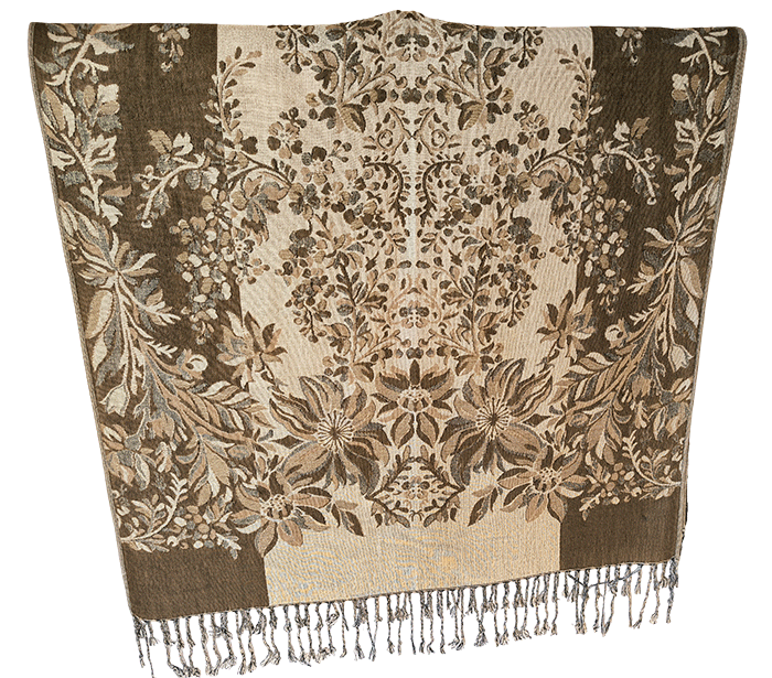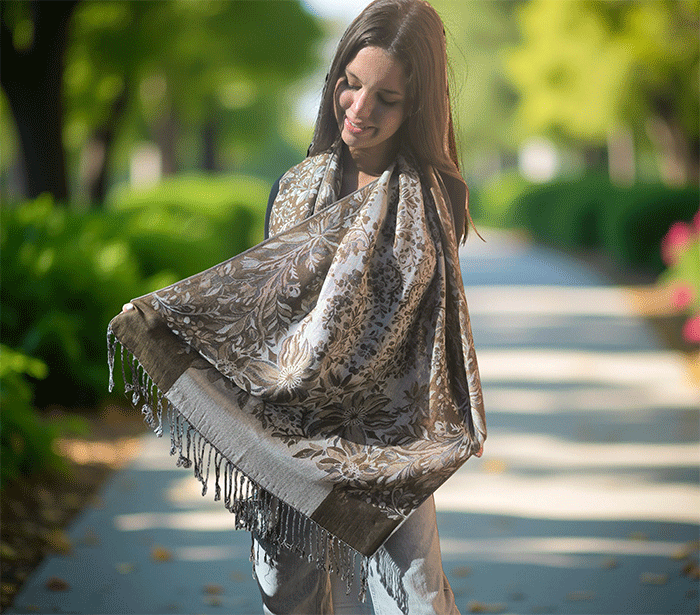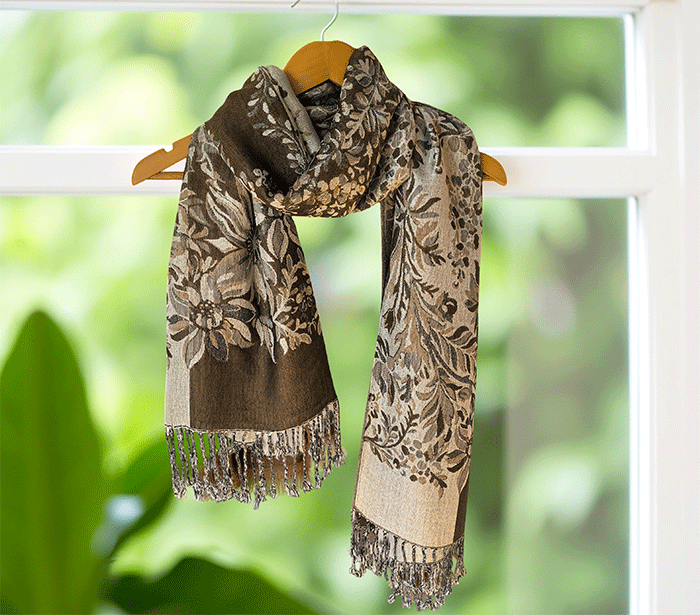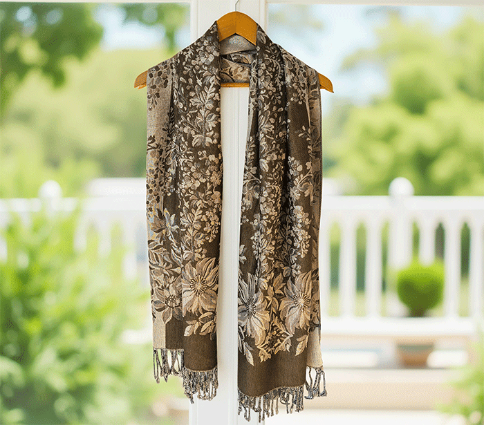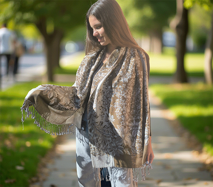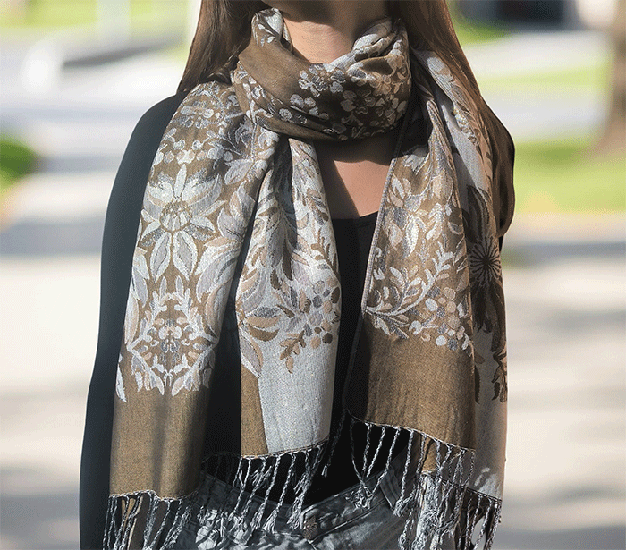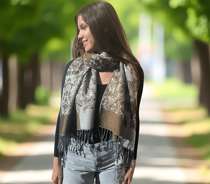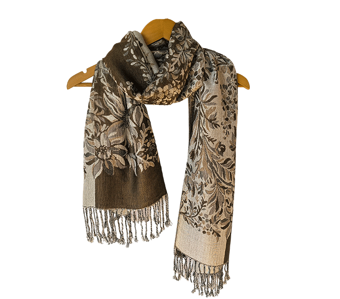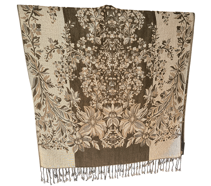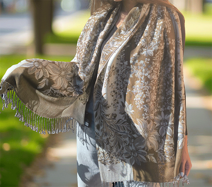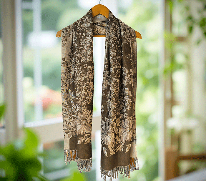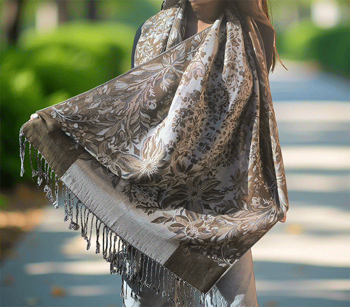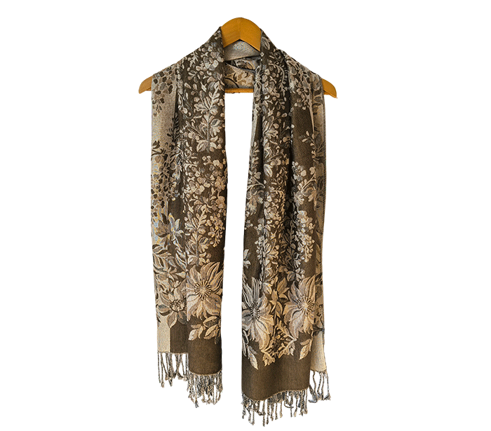 Ta pašmina šal združuje toplino in lahkotnost, zato ga lahko nosite kot zimski šal ali prehodni šal v hladnejših dneh. Njegov nežen cvetlični vzorec in rahlo svetlikajoča površina ustvarjata čudovit videz, ki poudari ženstvenost in občutek prazničnega razkošja – popoln spremljevalec ob vsaki priložnosti.