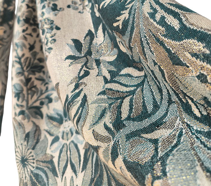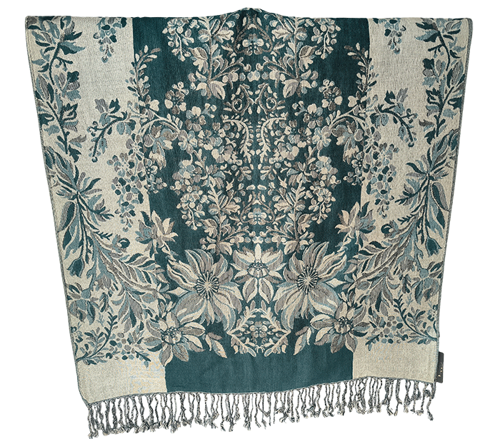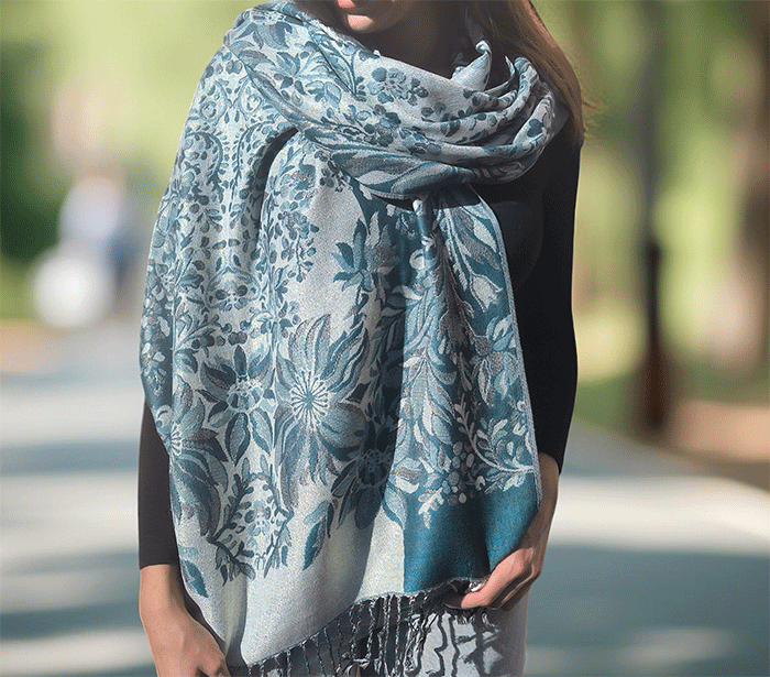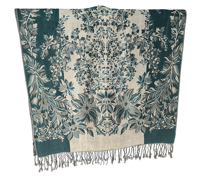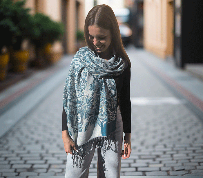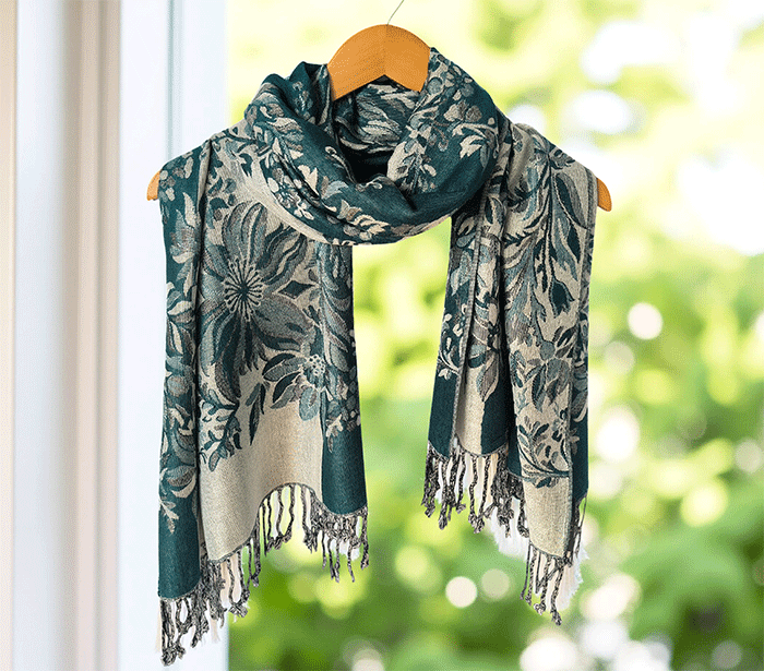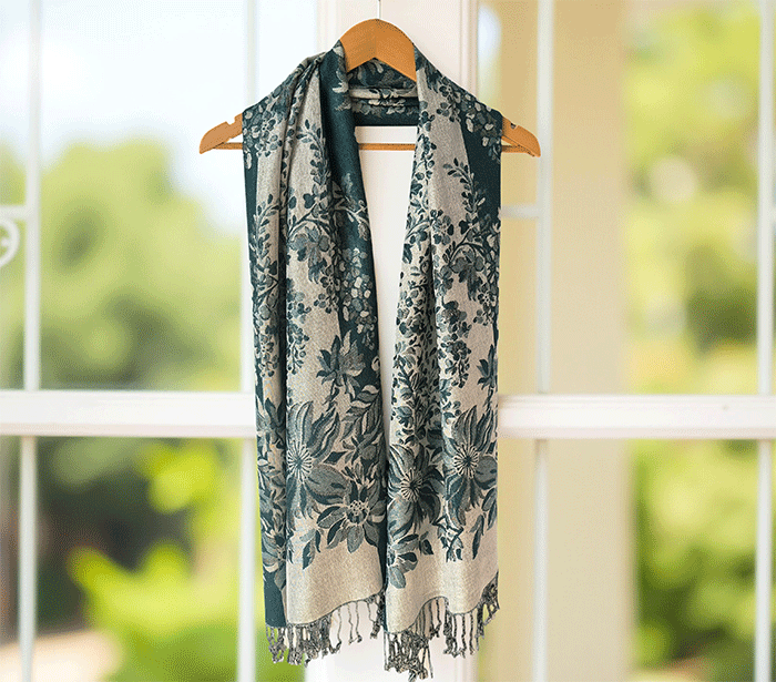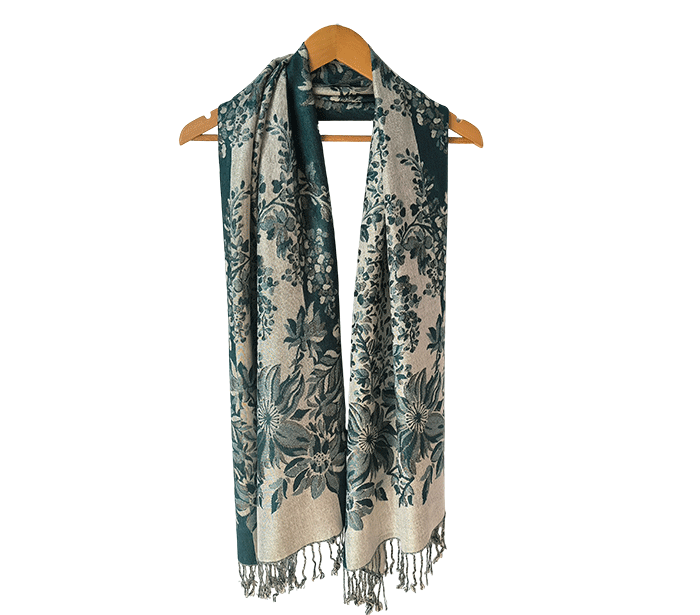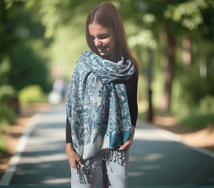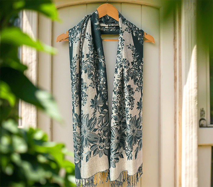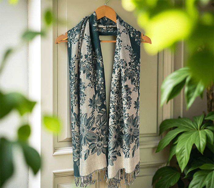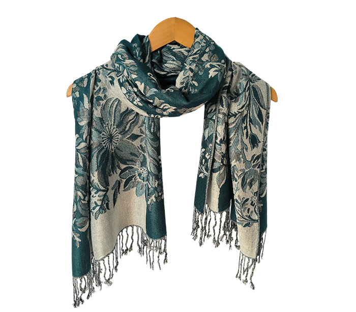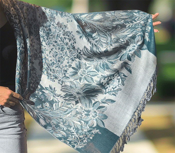 Ta pašmina šal združuje toplino in lahkotnost, zato ga lahko nosite kot zimski šal ali prehodni šal v hladnejših dneh. Njegov nežen cvetlični vzorec in rahlo svetlikajoča površina ustvarjata čudovit videz, ki poudari ženstvenost in občutek prazničnega razkošja – popoln spremljevalec ob vsaki priložnosti.