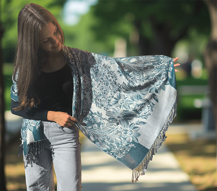 Ovijte se v toplino in lepoto – šal Celebrate prinaša občutek lahkotnosti, ravnovesja in praznovanja življenja.