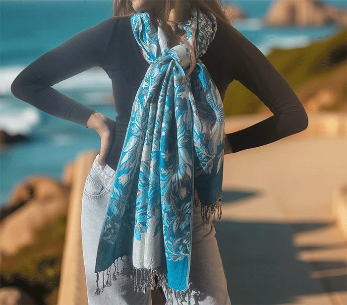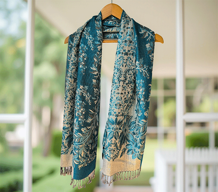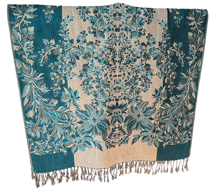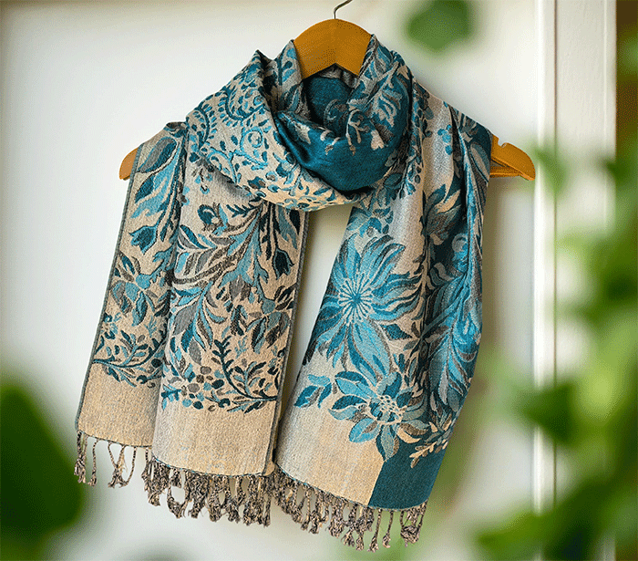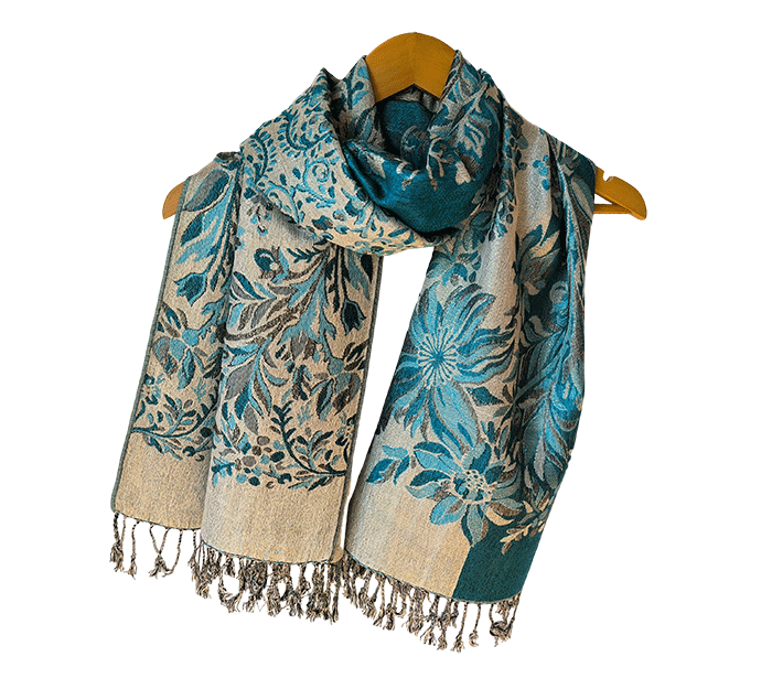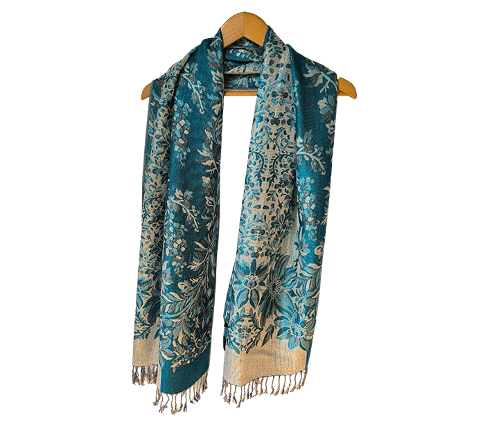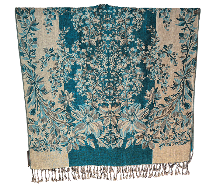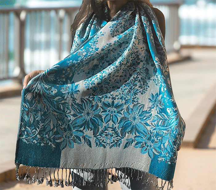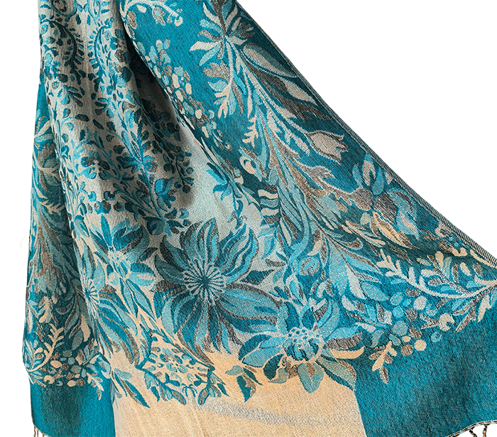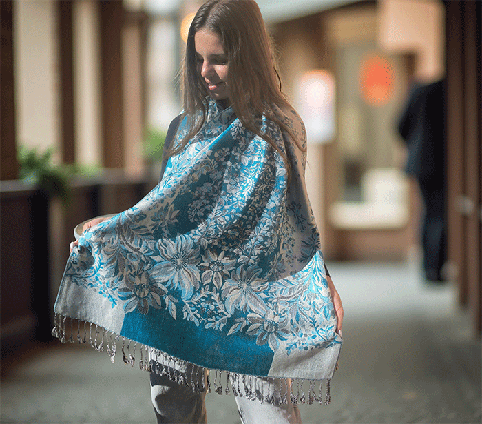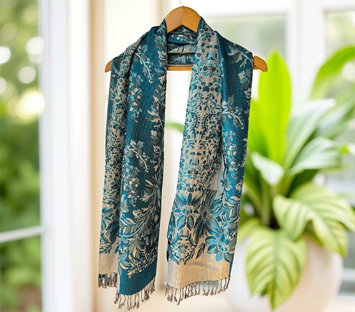 Ta pašmina šal združuje toplino in lahkotnost, zato ga lahko nosite kot zimski šal ali prehodni šal v hladnejših dneh. Njegov nežen cvetlični vzorec in rahlo svetlikajoča površina ustvarjata čudovit videz, ki poudari ženstvenost in občutek prazničnega razkošja – popoln spremljevalec ob vsaki priložnosti.