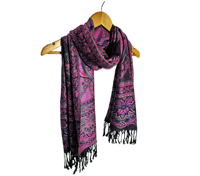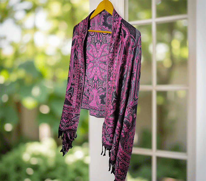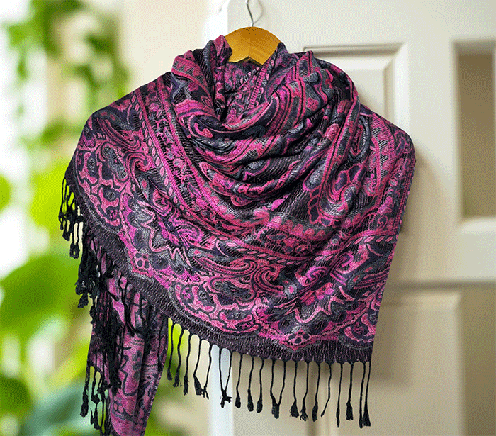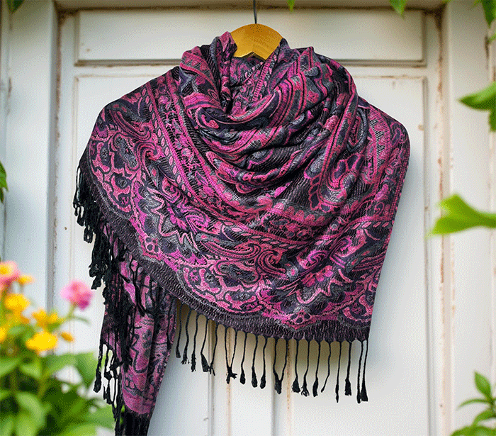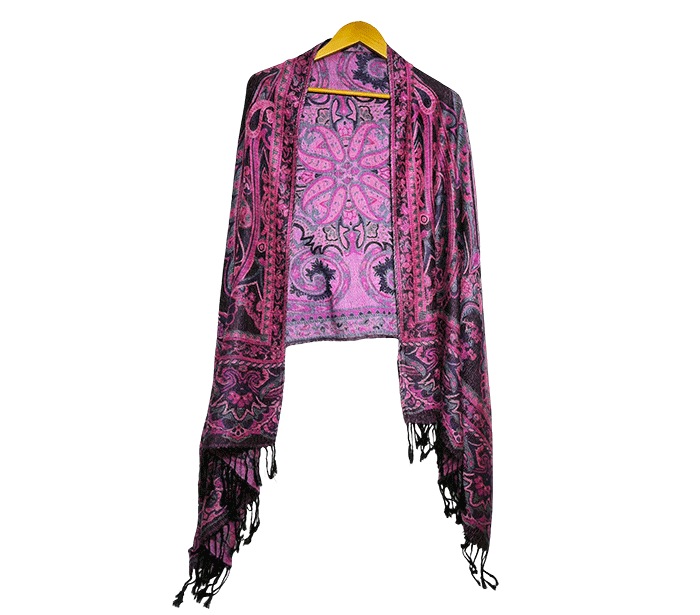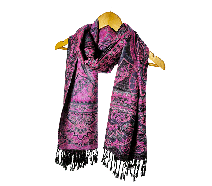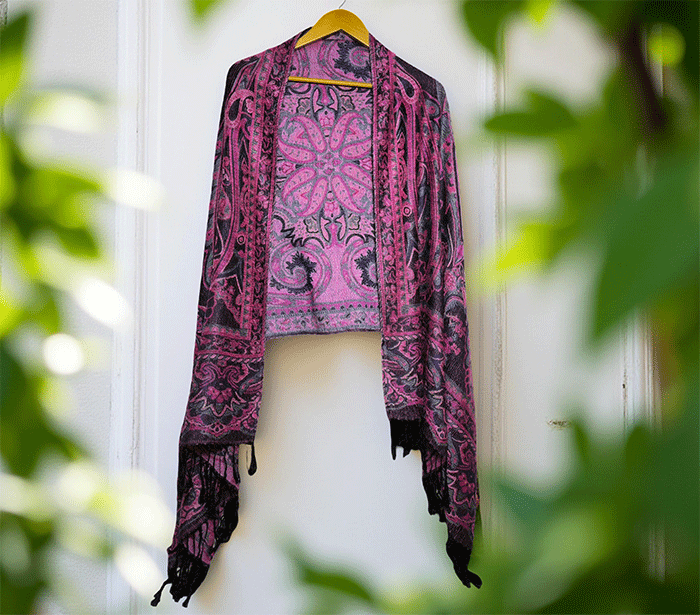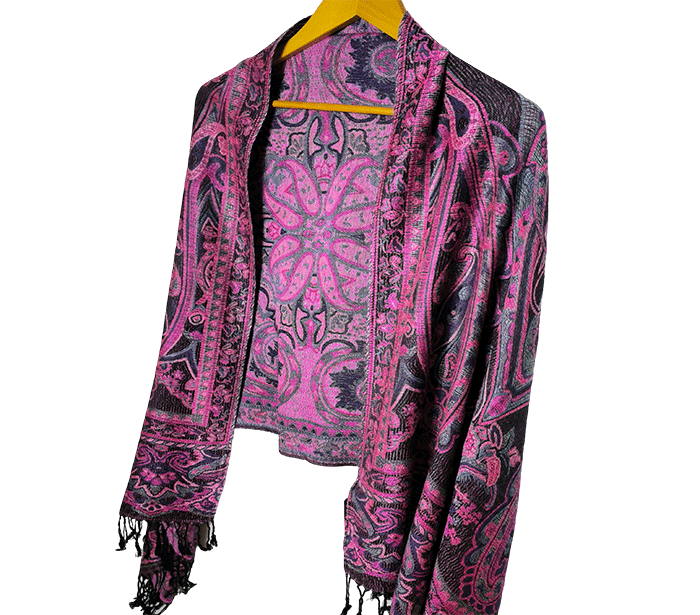 Šal Crazy v stilu pašmina iz naravnih materialov je mehak, topel in prijeten za nošenje, še posebej primeren za občutljive osebe, ki imajo občutljivo kožo. Njegova živahna kombinacija črne in roza barve, z različnimi rožnatimi odtenki, izžareva energijo, živahnost in sproščenost, kar prispeva k boljšemu počutju in optimizmu.