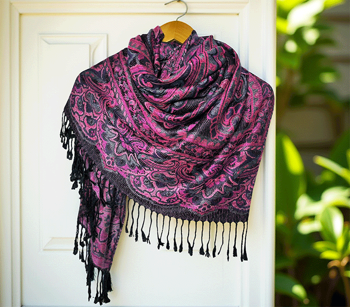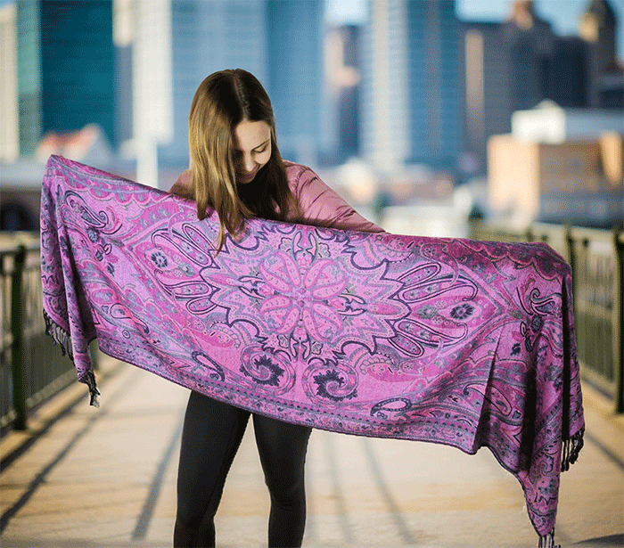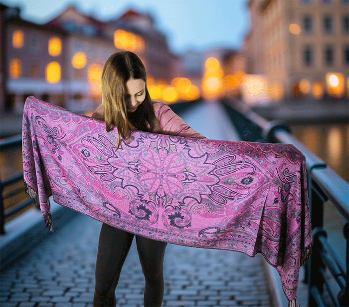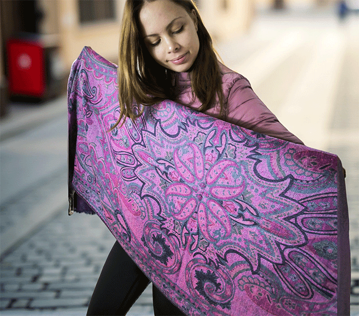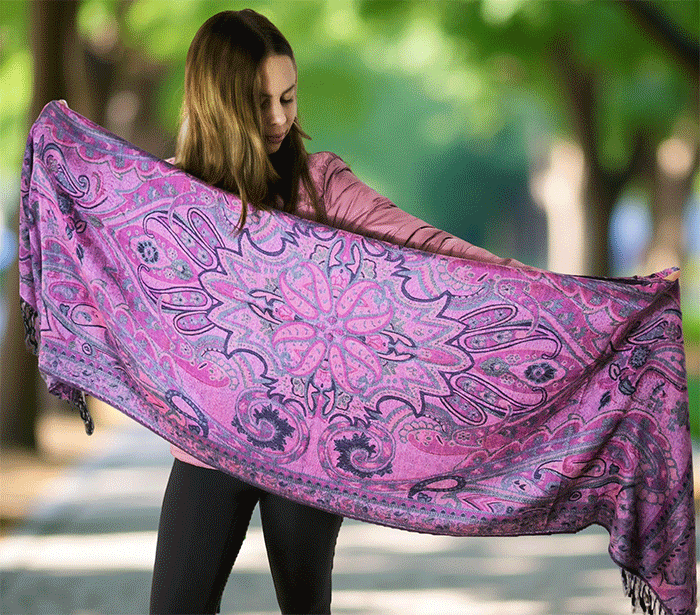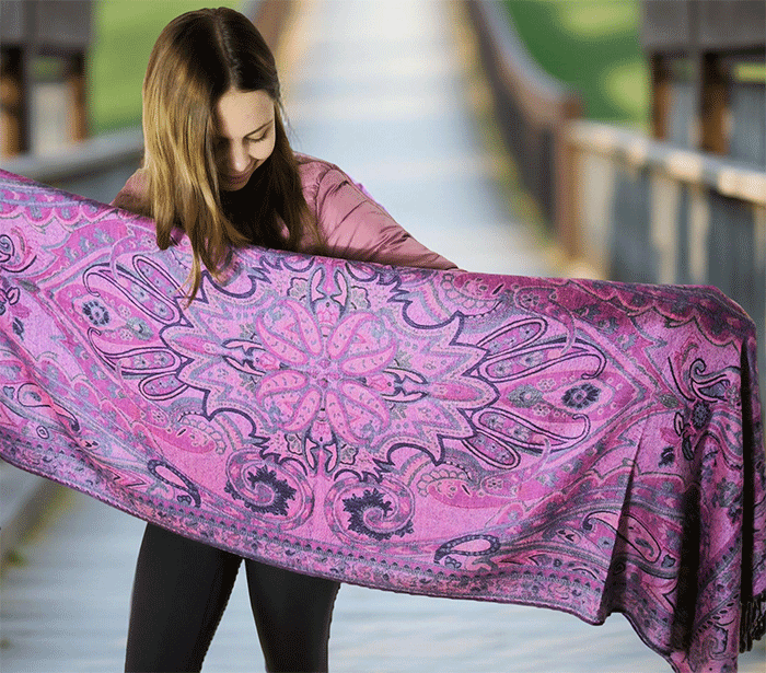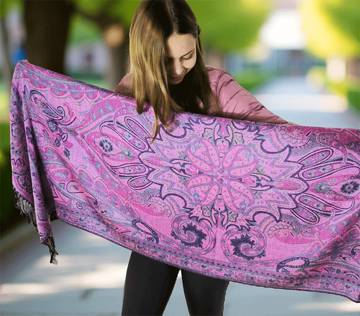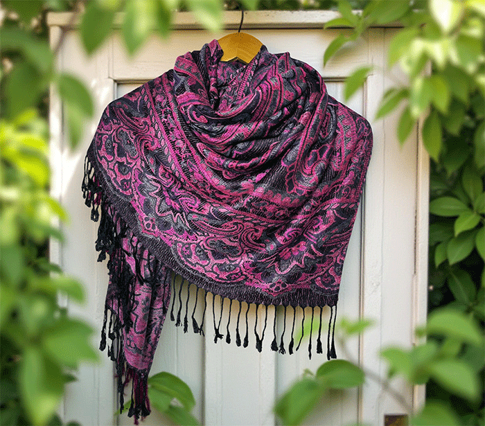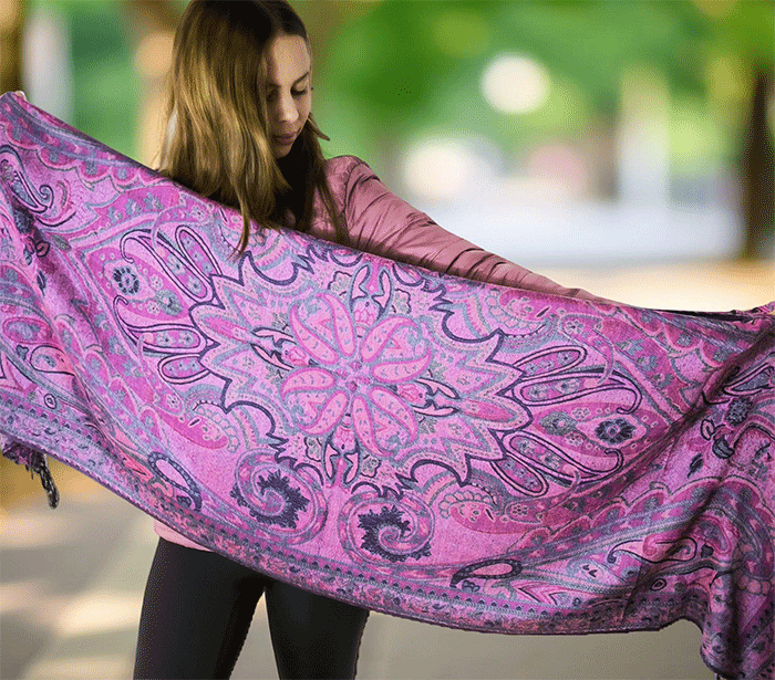 Šal Crazy v stilu pašmina iz naravnih materialov je mehak, topel in prijeten za nošenje, še posebej primeren za občutljive osebe, ki imajo občutljivo kožo. Njegova živahna kombinacija črne in roza barve, z različnimi rožnatimi odtenki, izžareva energijo, živahnost in sproščenost, kar prispeva k boljšemu počutju in optimizmu.