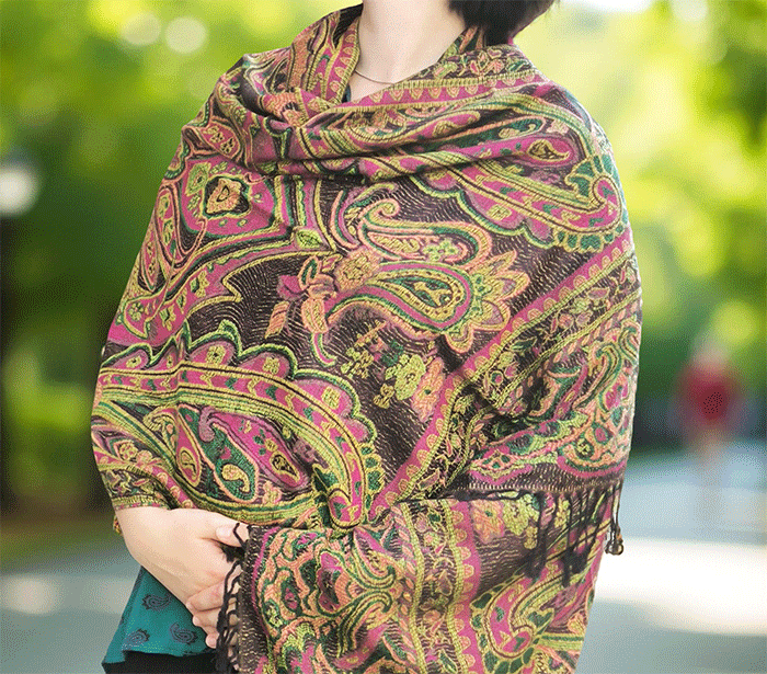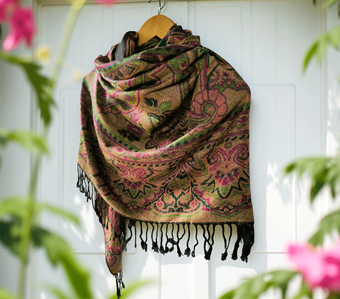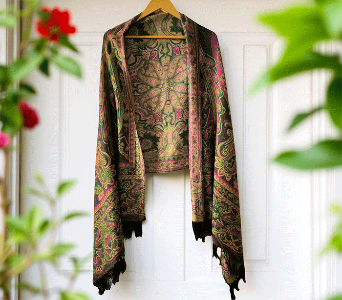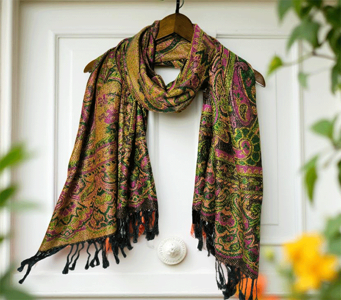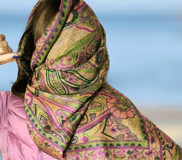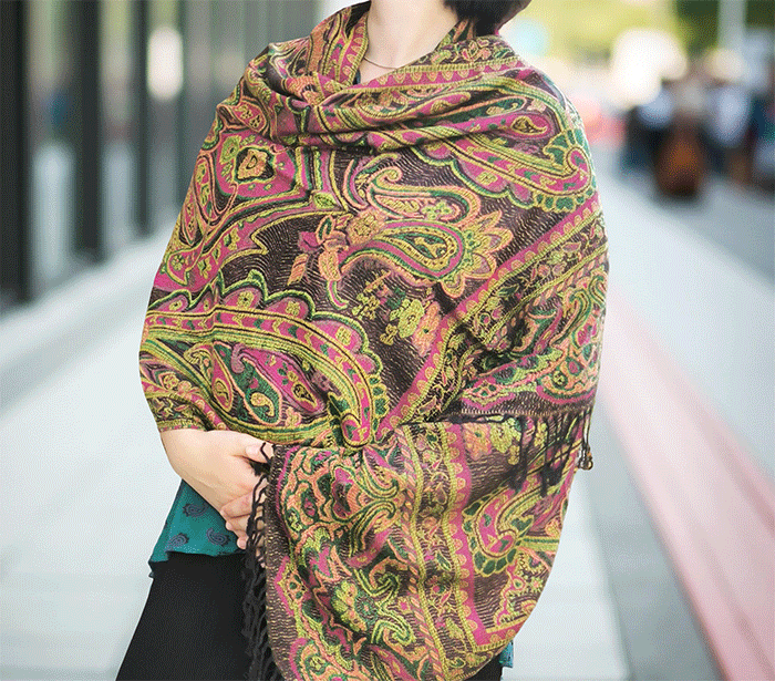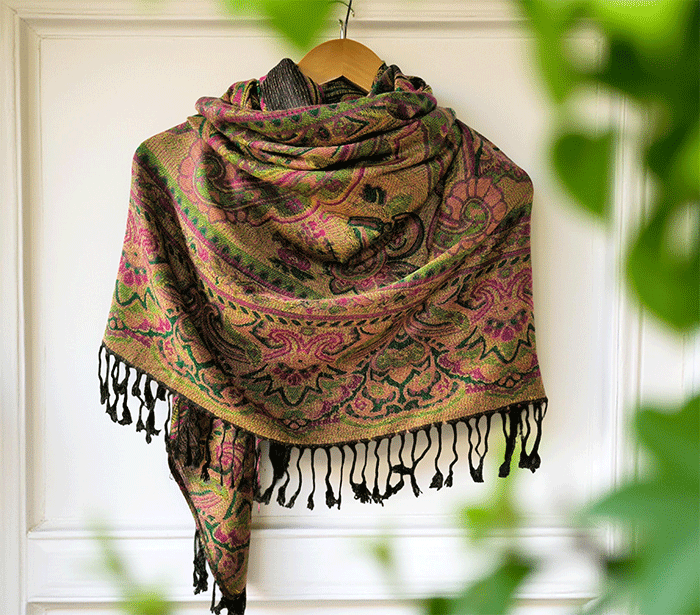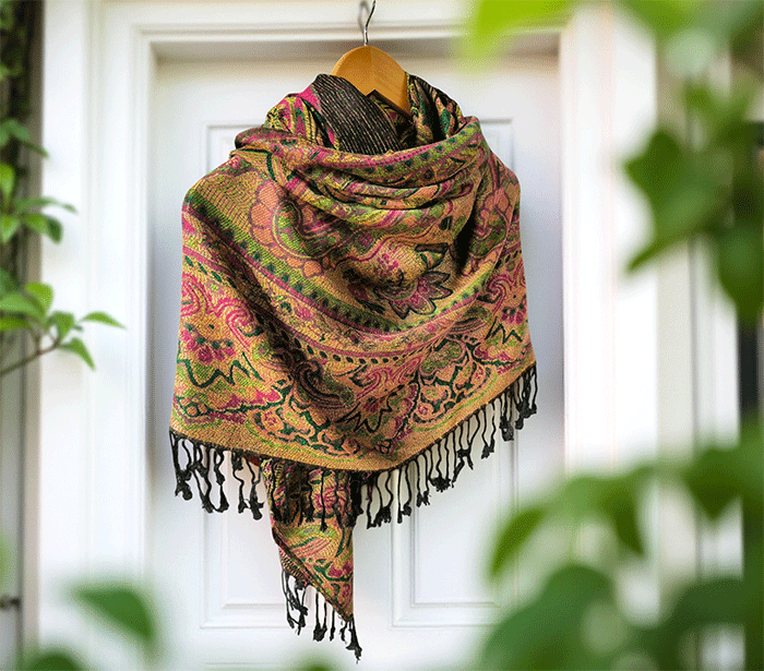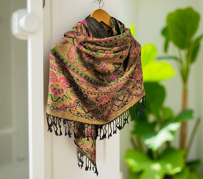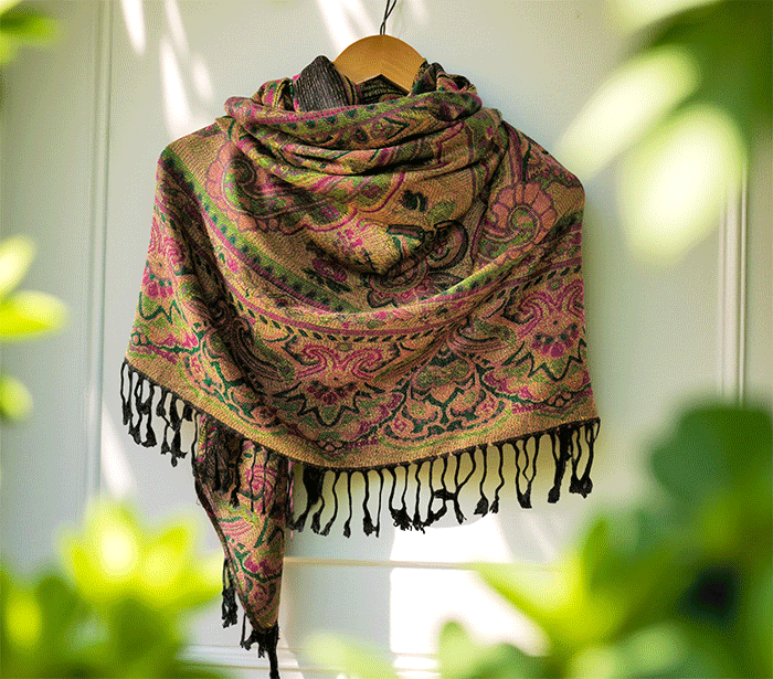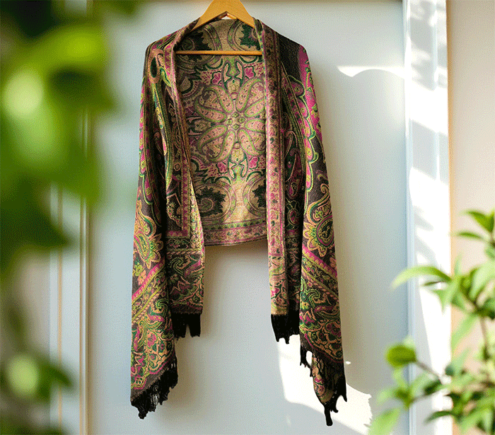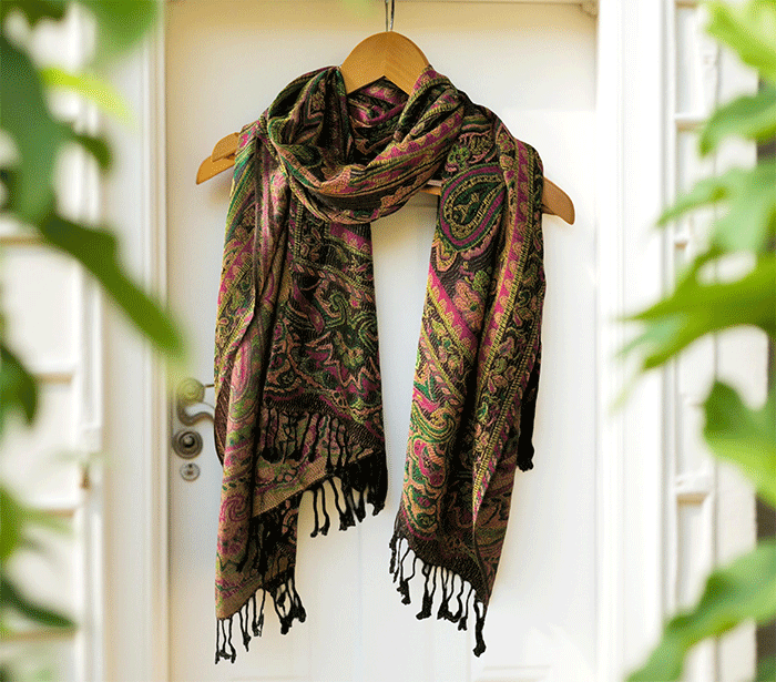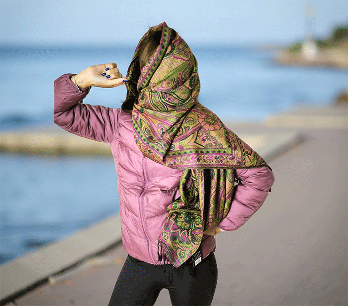 Šal Crazy v stilu pašmine, izdelan iz naravnih materialov, združuje živahno črno-zeleno barvno kombinacijo, ki prinaša energijo, življenje in sproščenost. Zeleno se povezuje z naravo, ravnovesjem in svežino, medtem ko črna dodaja eleganco in globino. Skupaj ustvarjata barvit in živahen dodatek, ki izboljša počutje in dviguje razpoloženje.