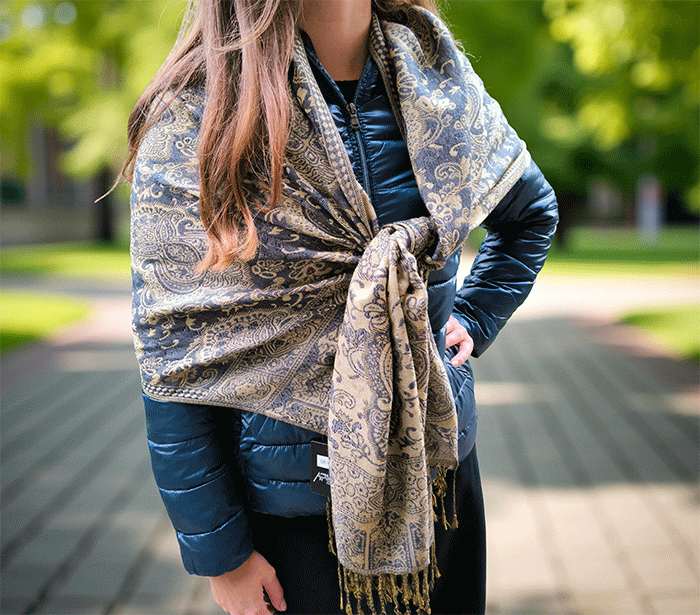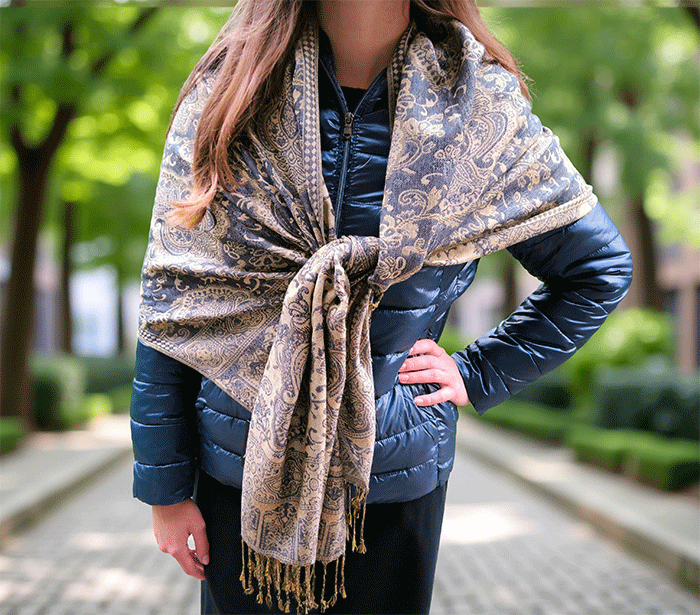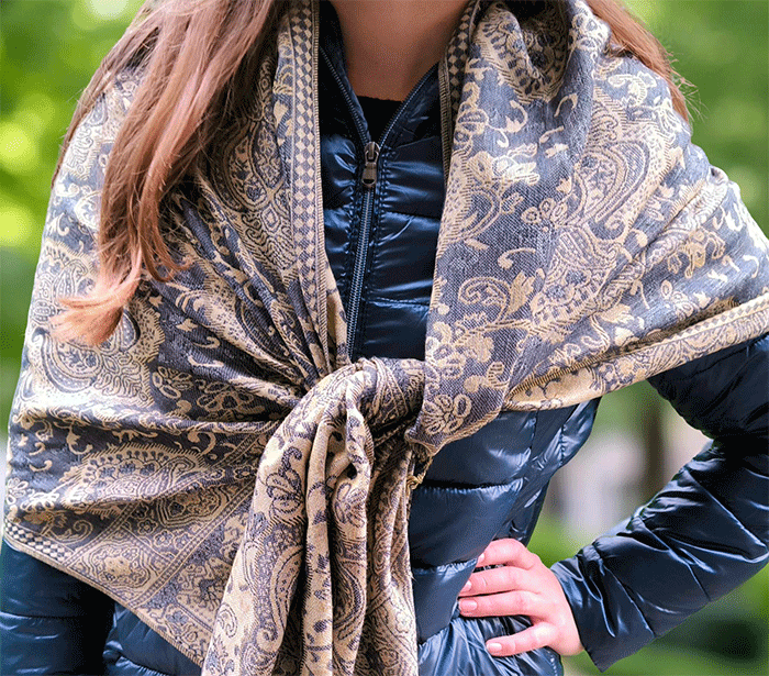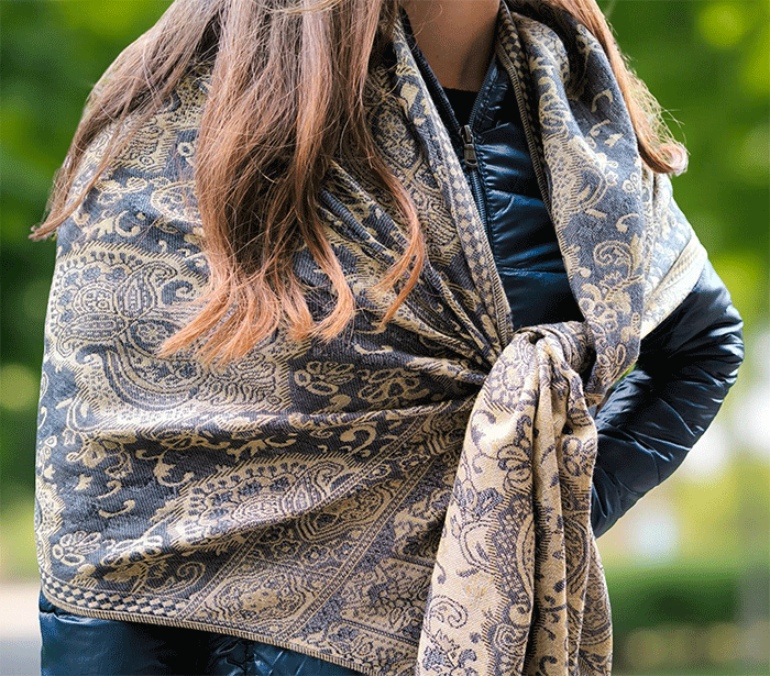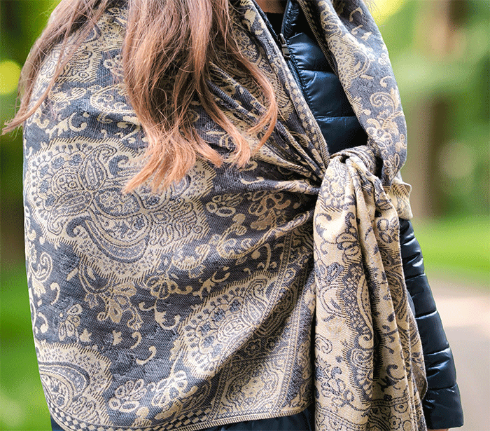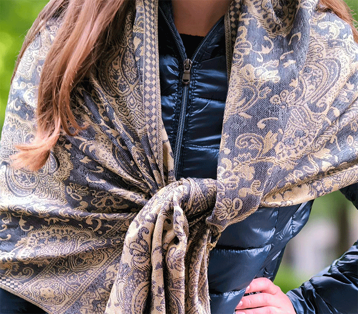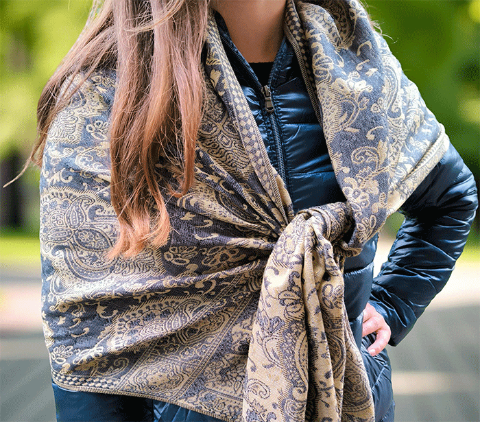 Siva in bež barvna kombinacija v šalu Cvetoč prinaša pomirjujoč in prizemljen učinek Siva barva pogosto predstavlja nevtralnost, ravnovesje in stabilnost, medtem ko bež dodaja toplino in mehkobo. Skupaj lahko vzbudita občutek miru in udobja, zaradi česar se nosilec šala počuti bolj sproščenega in v harmoniji. Šal je narajen v razgibanem stilu pašmina in ti nevtralni barvni toni šala simbolizirajo tudi prefinjenost in brezčasnost, kar se lepo poveže z igrivimi vzorci, ki dodajajo dinamičnost in živahnost celotnemu videzu. Ta kombinacija barv in vzorcev je odlična za spodbujanje občutka dobrega počutja, ravnovesja in pozitivne energije.