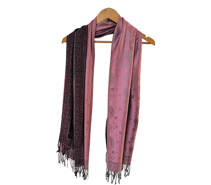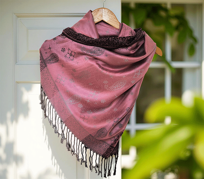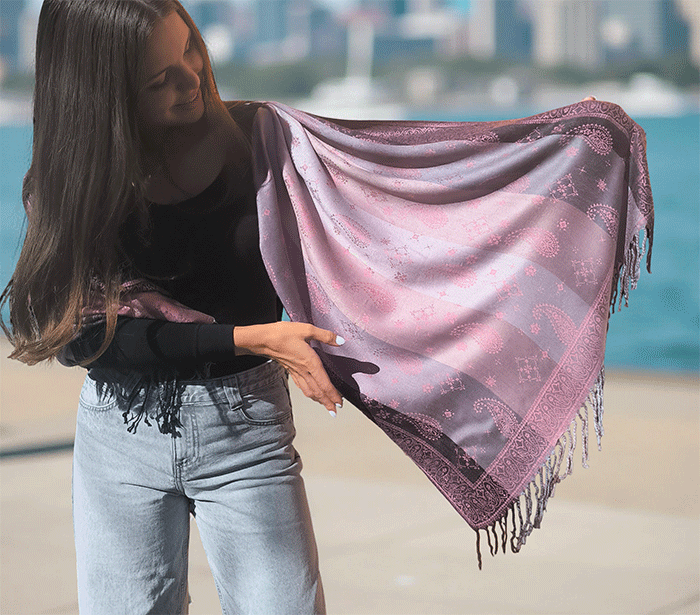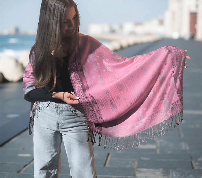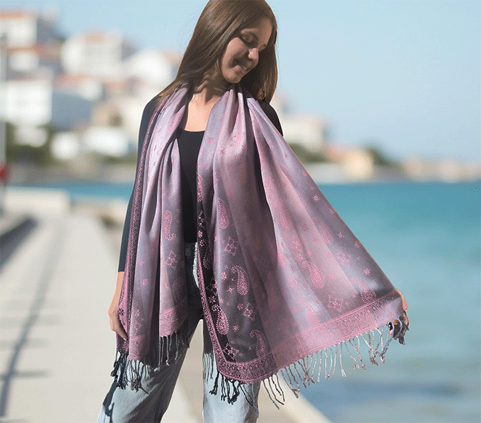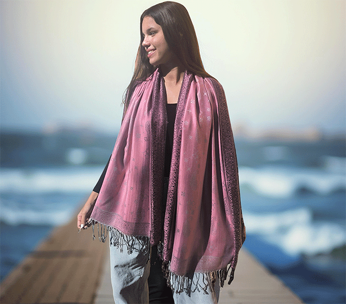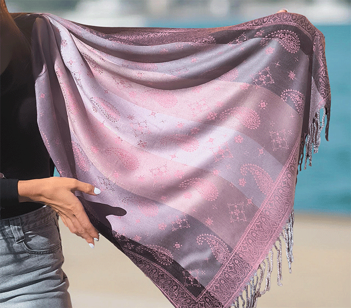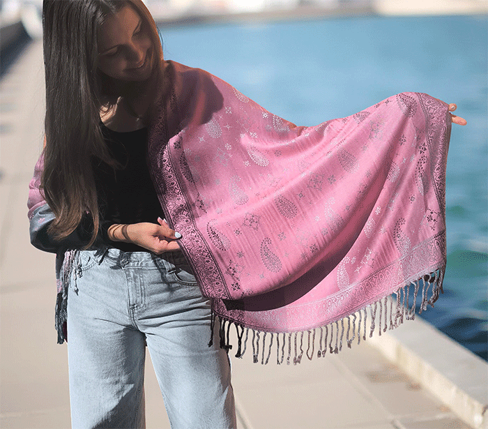 Odkrij čar elegance in udobja z našim čudovitim ženskim šalom v pašmina stilu, izdelanim iz naravnih, mehkih materialov, ki prijetno objamejo kožo in so primerni tudi za občutljivo kožo. Ta eleganten ženski šal združuje toplino, nežnost in prefinjen videz – popolna izbira za vsako priložnost.