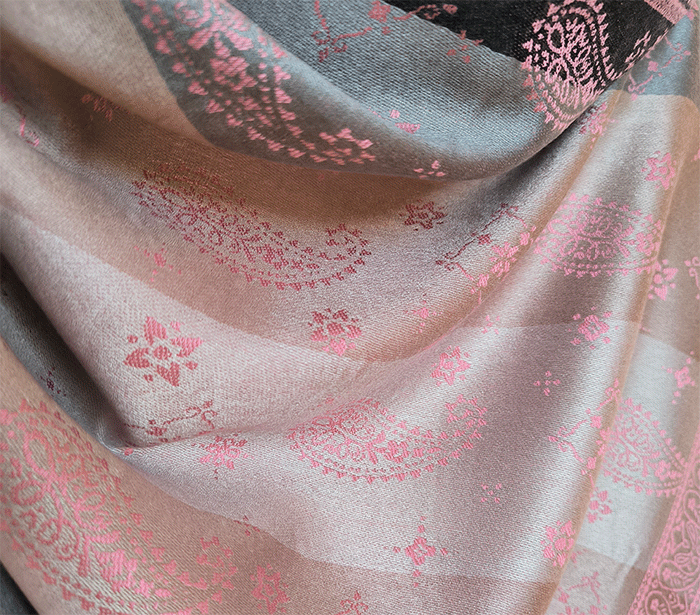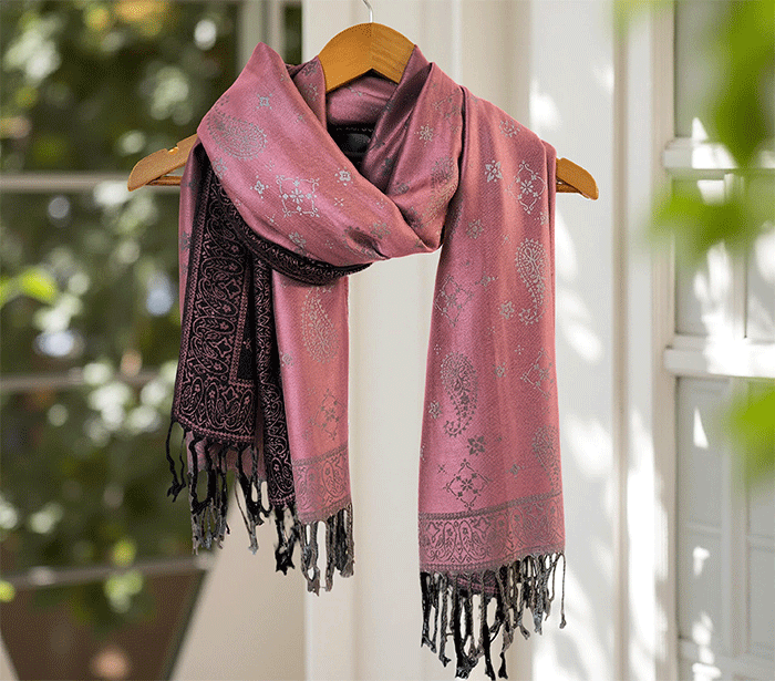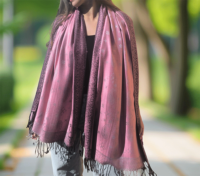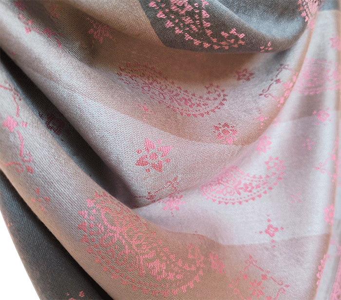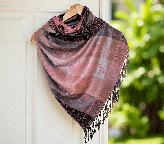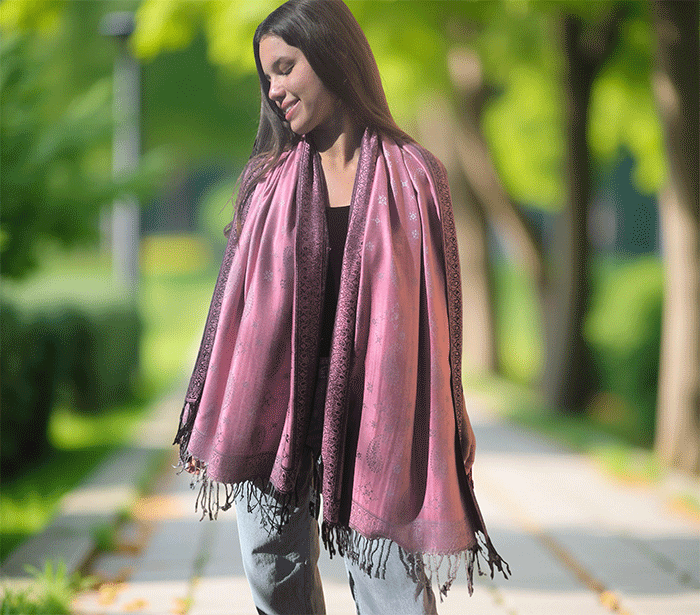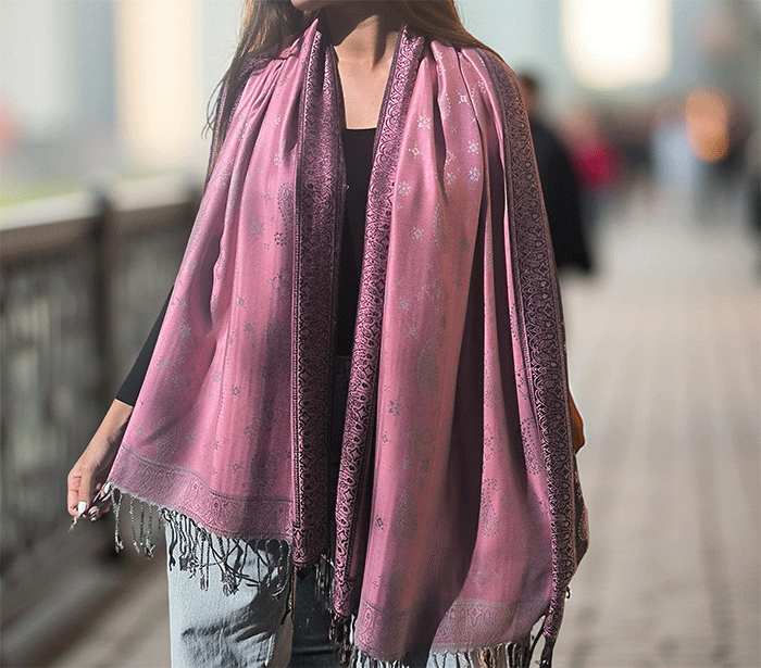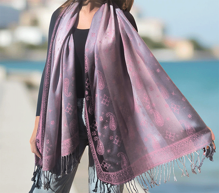 Odkrij čar elegance in udobja z našim čudovitim ženskim šalom v pašmina stilu, izdelanim iz naravnih, mehkih materialov, ki prijetno objamejo kožo in so primerni tudi za občutljivo kožo. Ta eleganten ženski šal združuje toplino, nežnost in prefinjen videz – popolna izbira za vsako priložnost.
