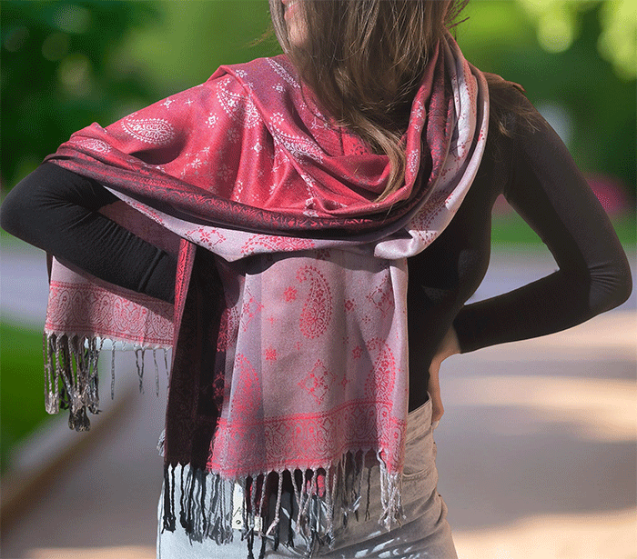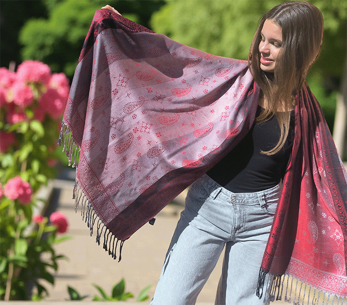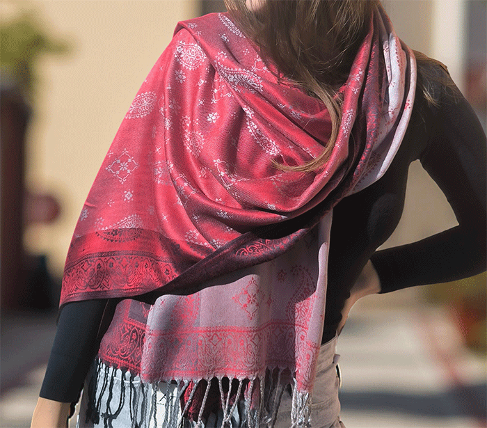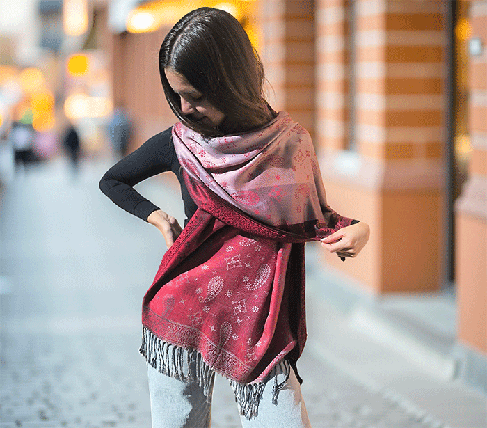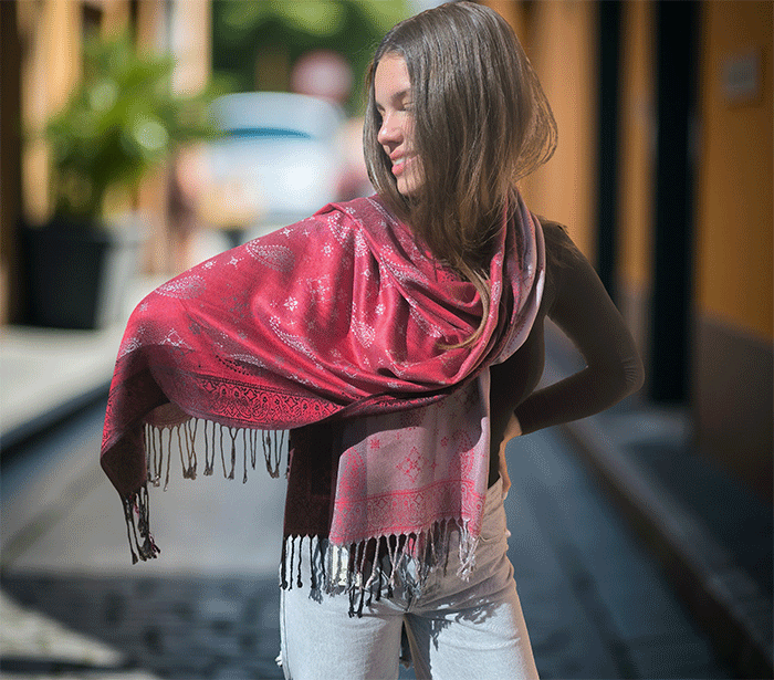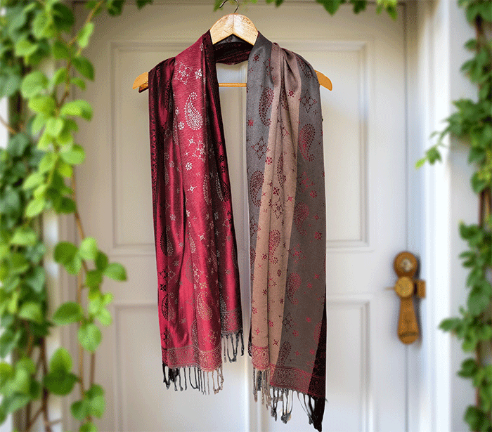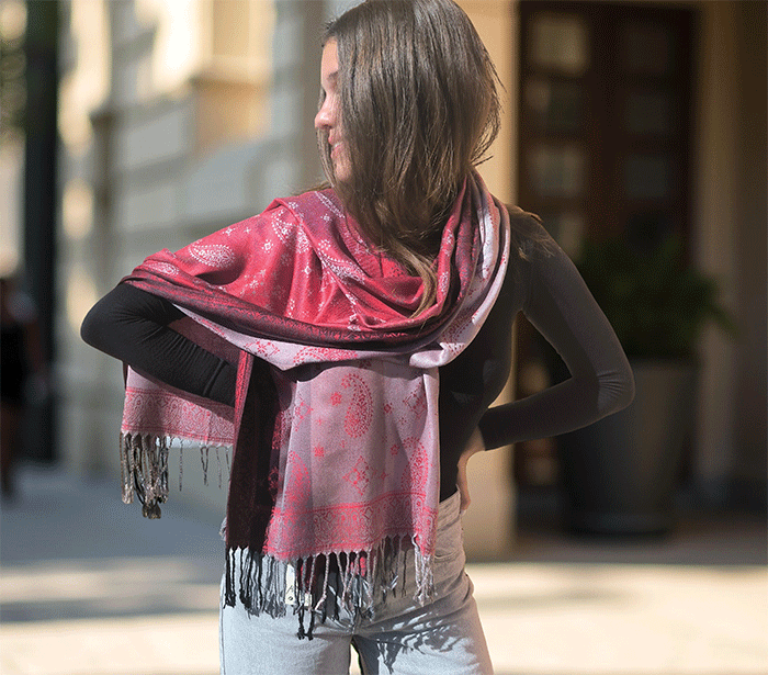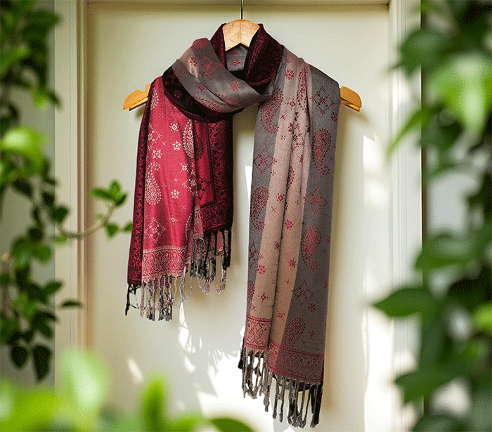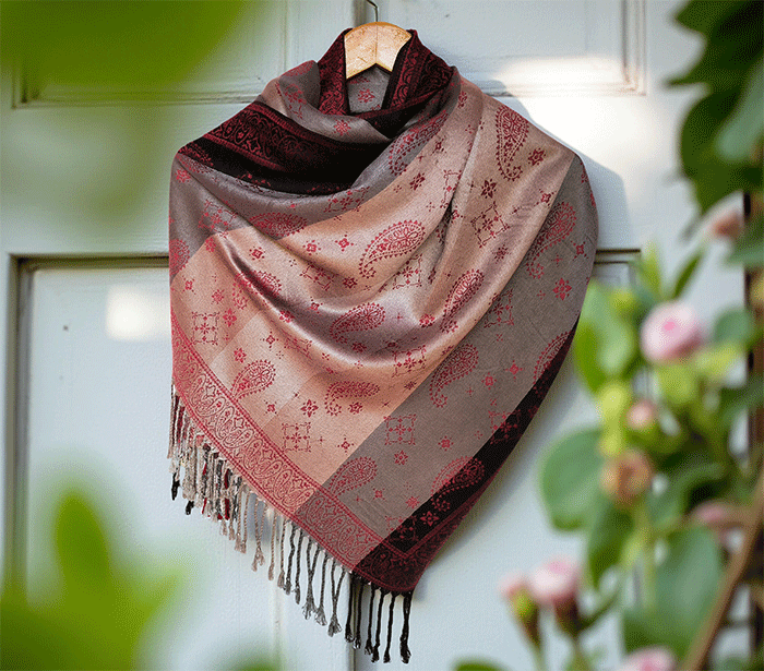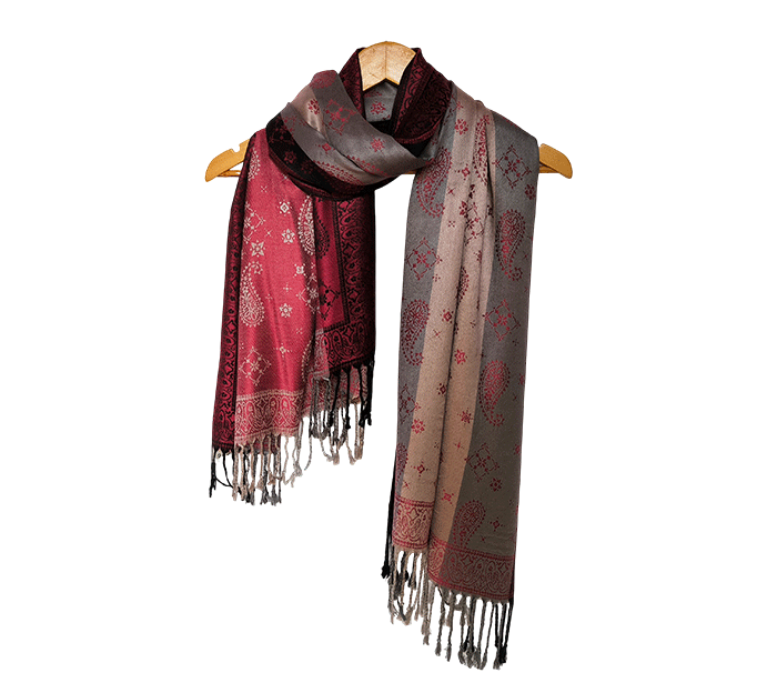 Odkrij čar elegance in udobja z našim čudovitim ženskim šalom v pašmina stilu, izdelanim iz naravnih, mehkih materialov, ki prijetno objamejo kožo in so primerni tudi za občutljivo kožo. Ta eleganten ženski šal združuje toplino, nežnost in prefinjen videz – popolna izbira za vsako priložnost.