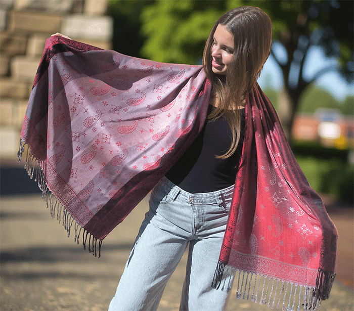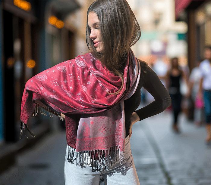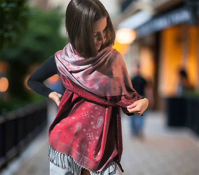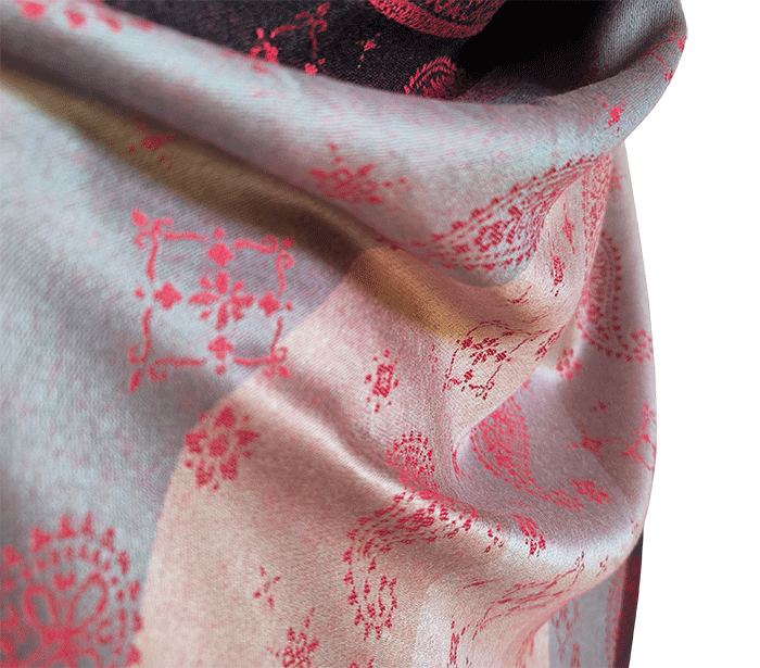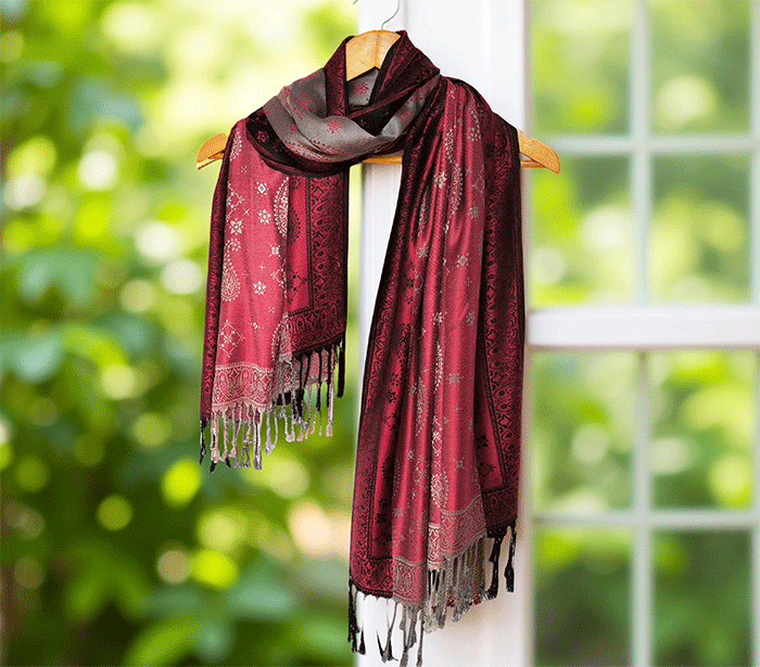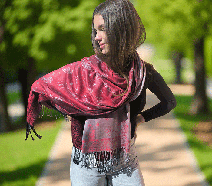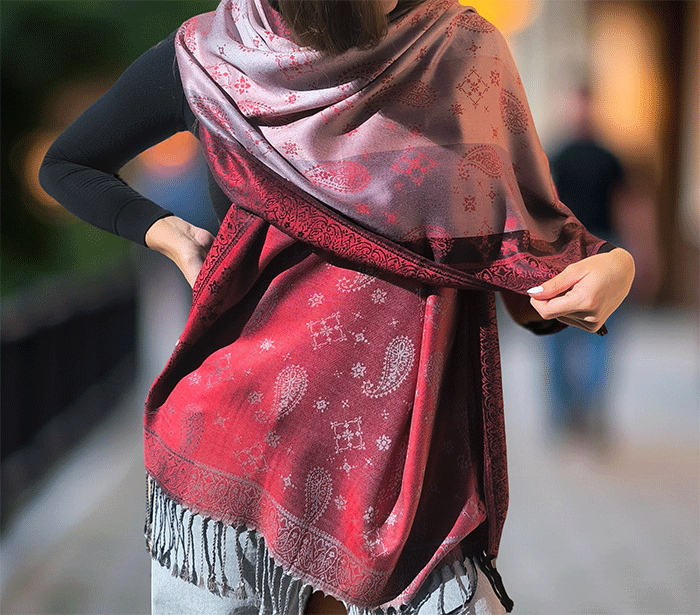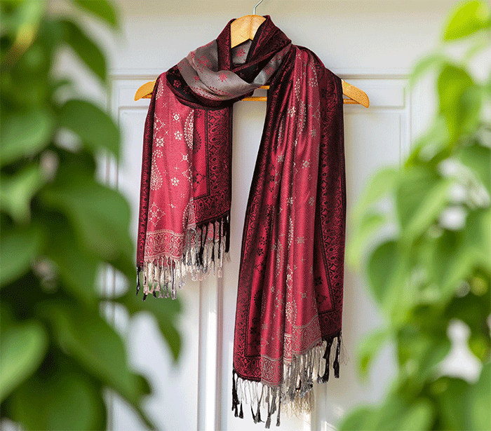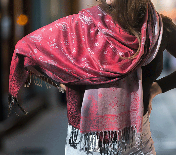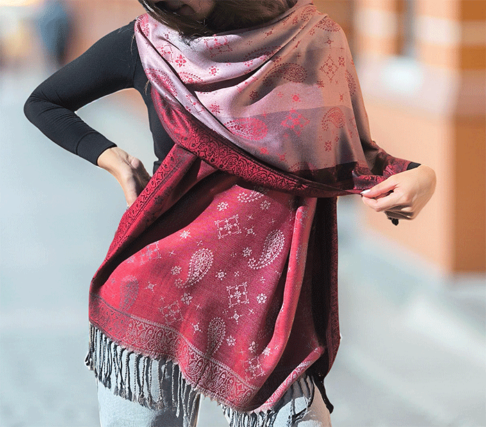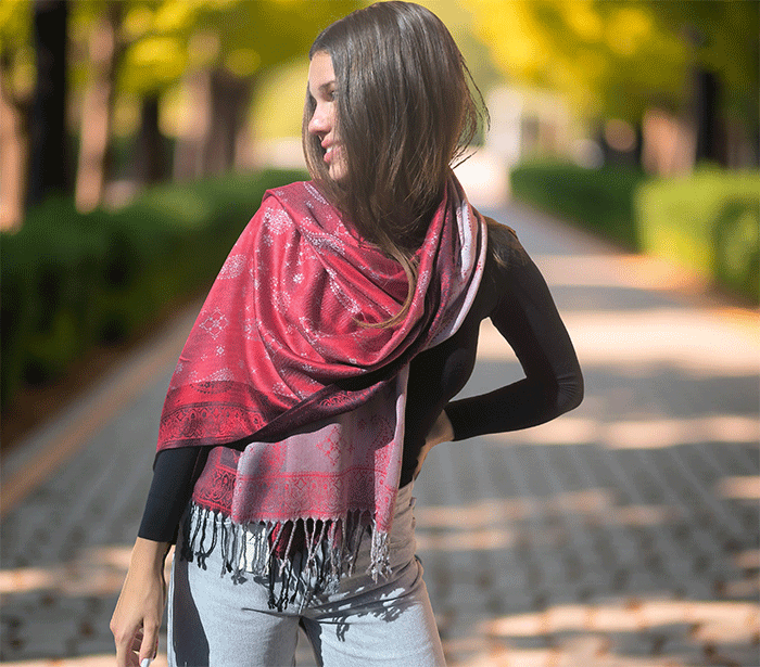 Odkrij čar elegance in udobja z našim čudovitim ženskim šalom v pašmina stilu, izdelanim iz naravnih, mehkih materialov, ki prijetno objamejo kožo in so primerni tudi za občutljivo kožo. Ta eleganten ženski šal združuje toplino, nežnost in prefinjen videz – popolna izbira za vsako priložnost.