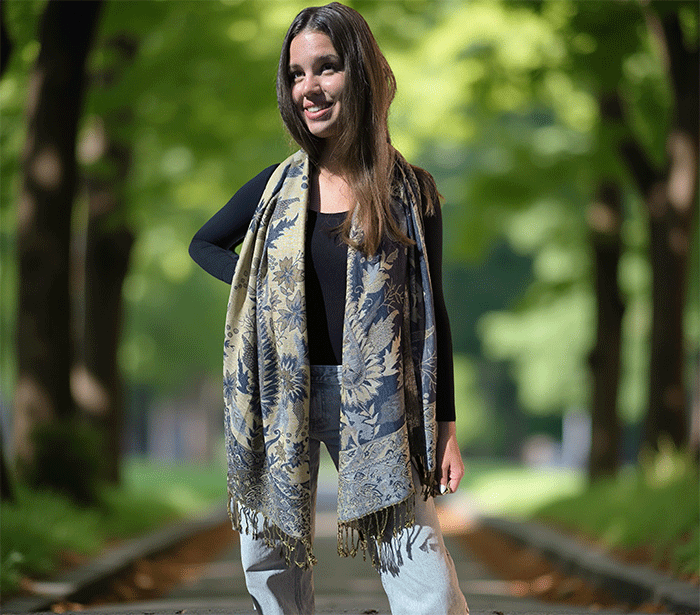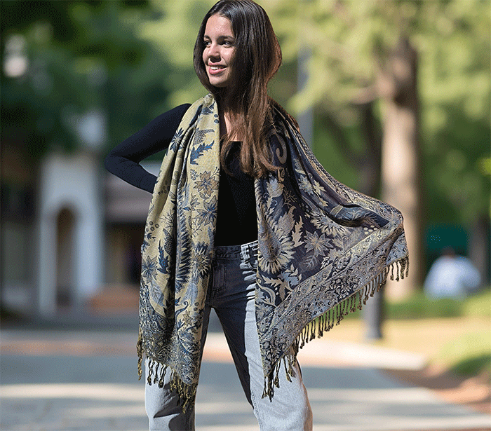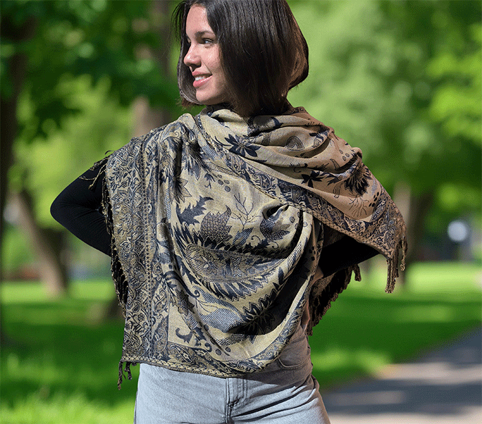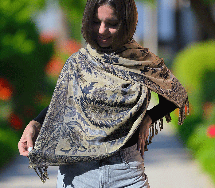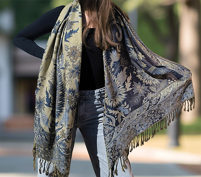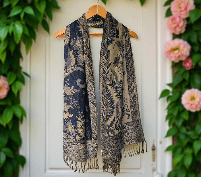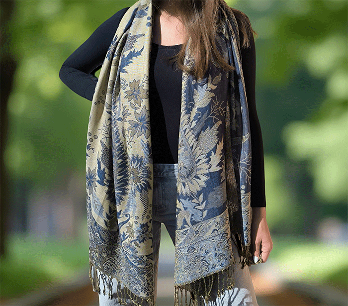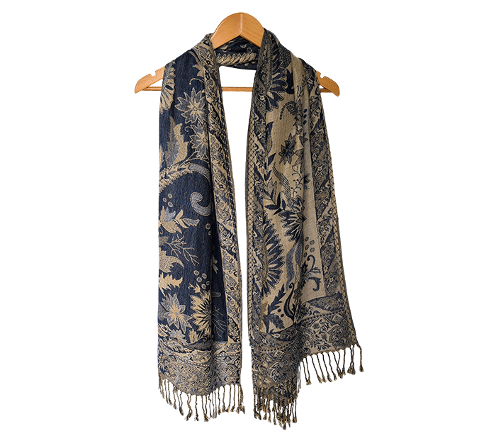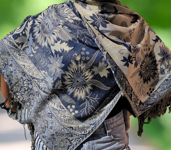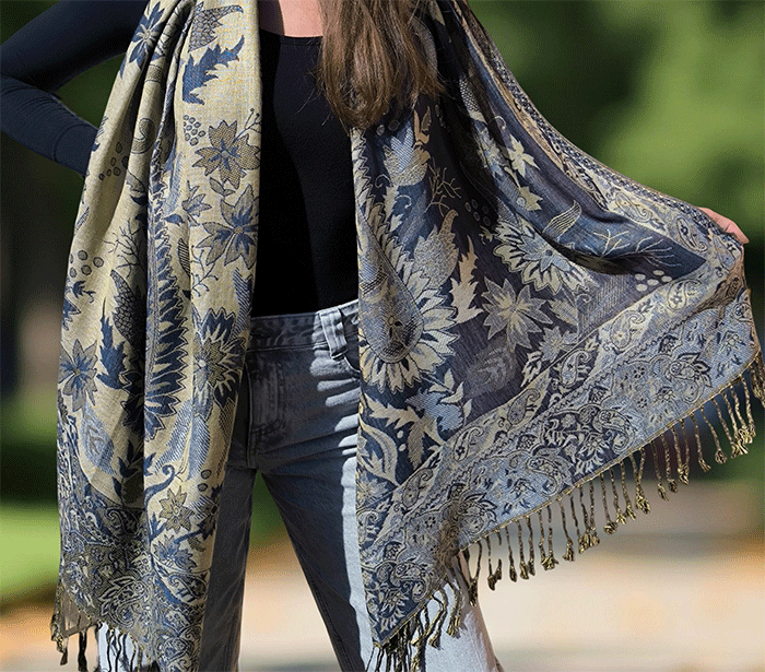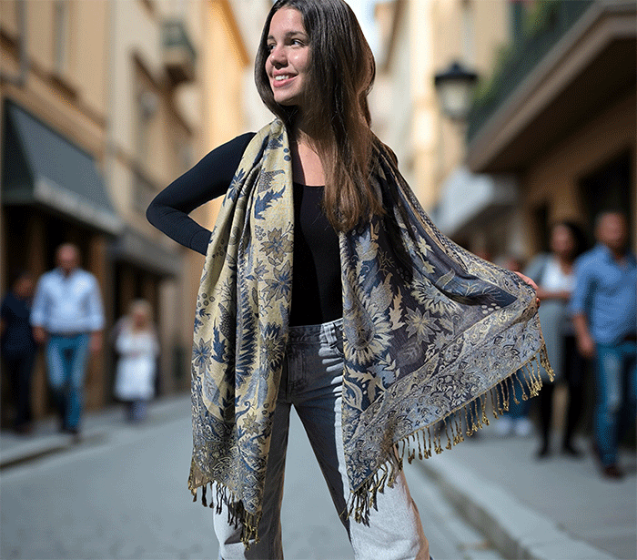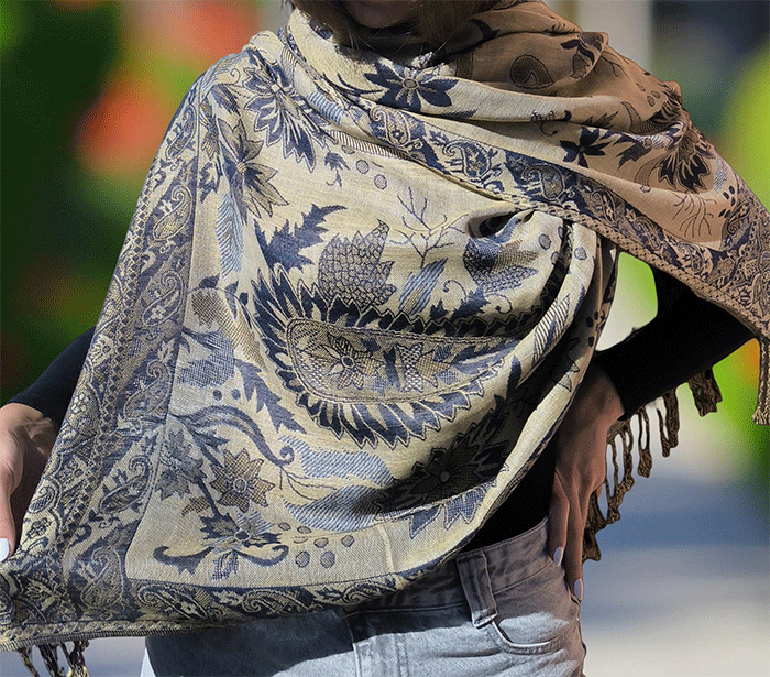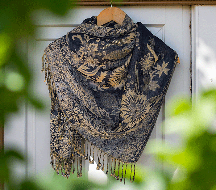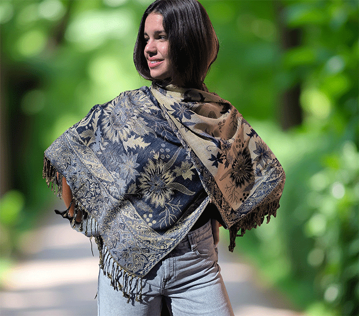 Ženski šal Igra v pašmina stilu, narejen iz naravnih materialov bombaža in viskoze ter prinaša številne prednosti za telo in dušo.  Njegova mehkoba in prijaznost do občutljive kože omogočata prijetno nošenje, kar še posebej cenijo ljudje, ki iščejo udobje in nežnost.