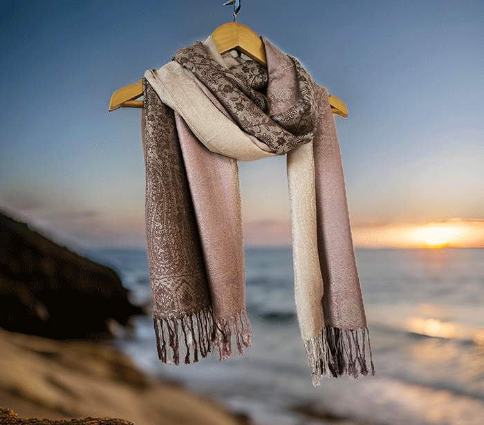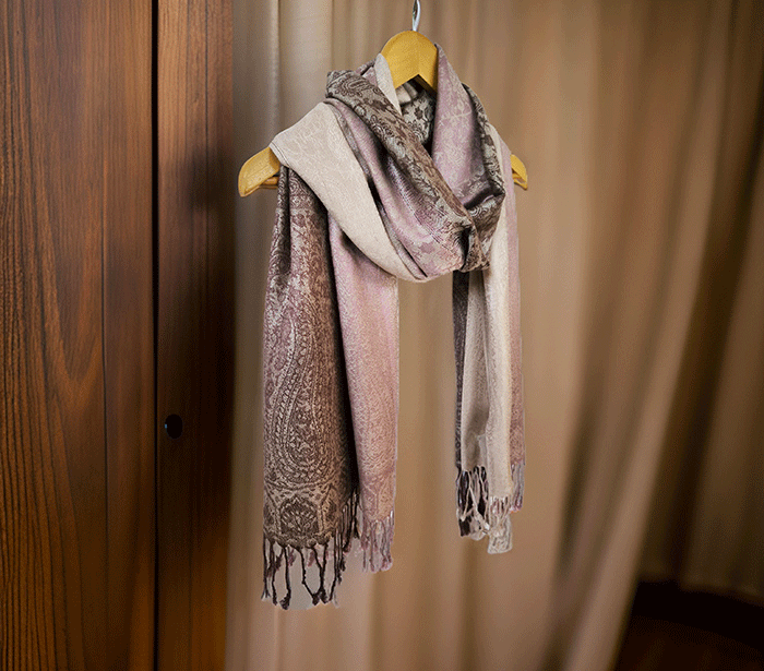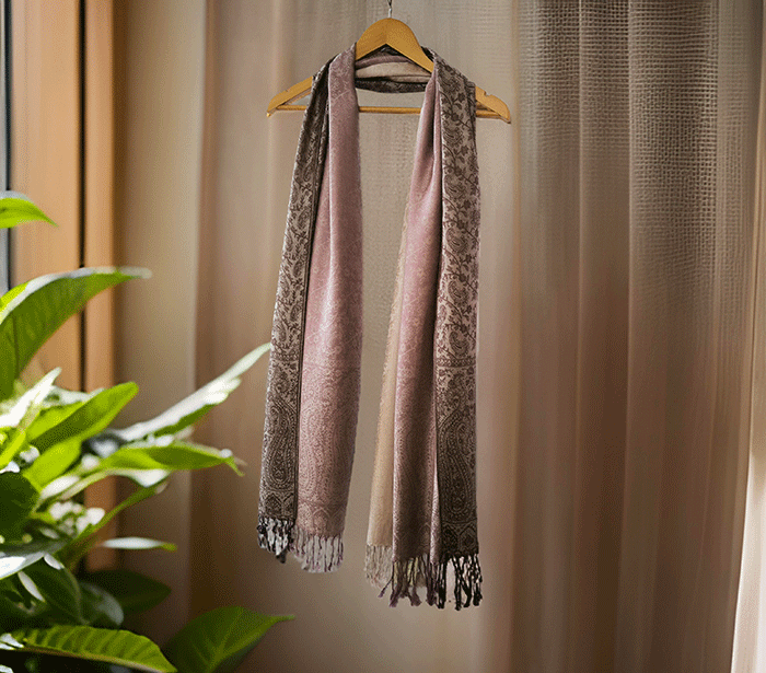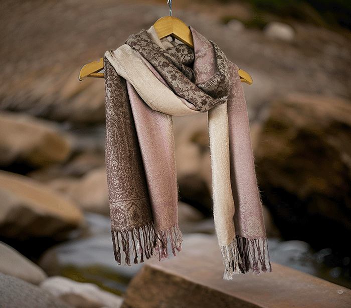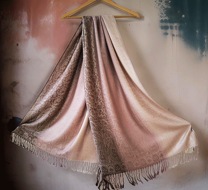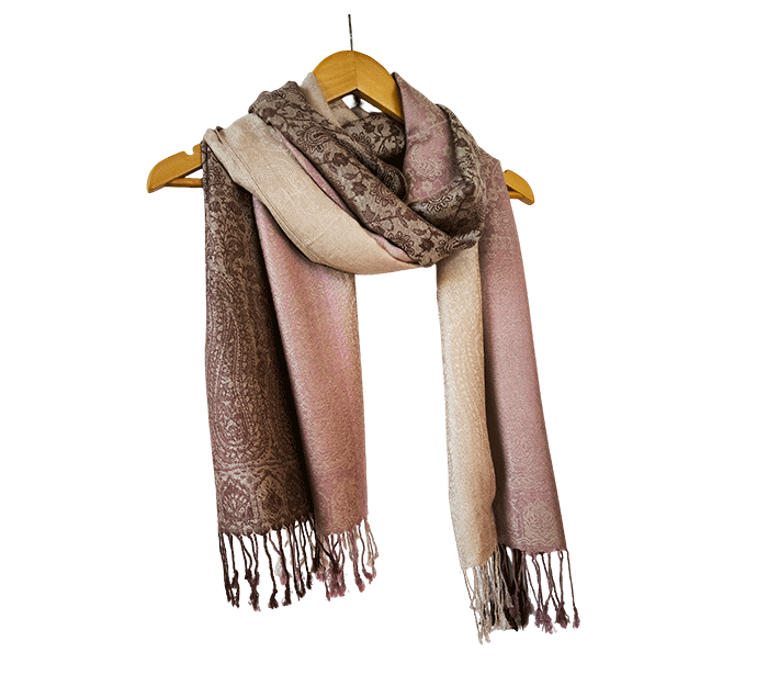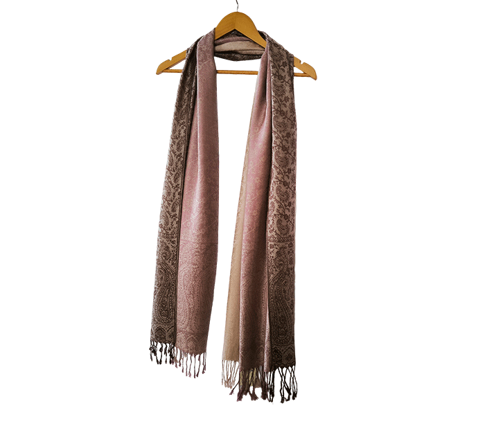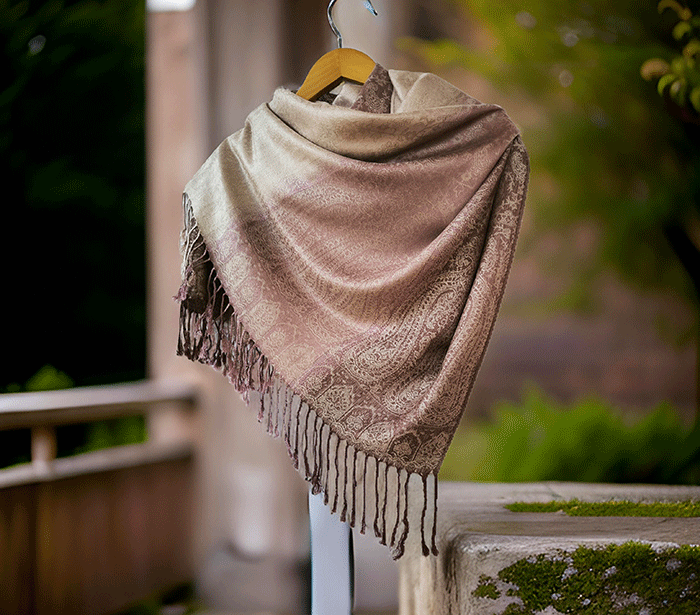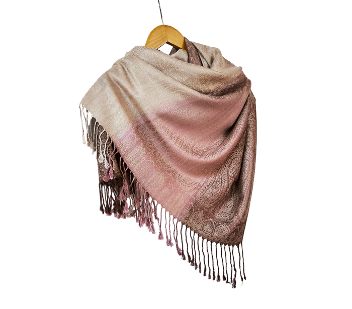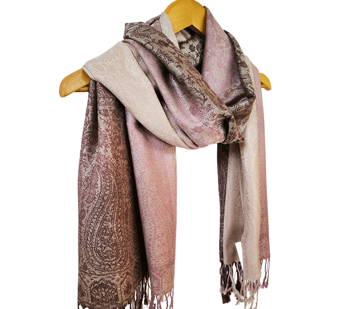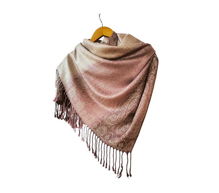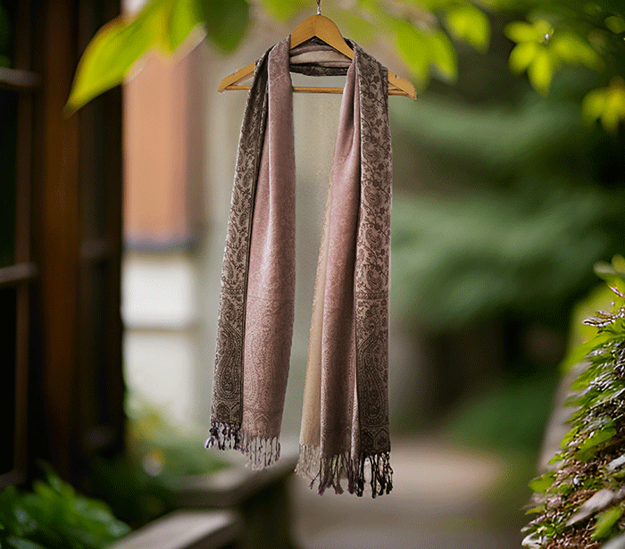 Šal v pašmina stilu iz naravnih materialov v rjavo-rožnato-bež odtenkih združuje eleganco, mehkobo in vsestranskost. Zaradi naravnih vlaken je izjemno mehak in prijeten na dotik, kar ga naredi popolnega za ljudi z občutljivo kožo. Je topel, a lahek, zato je primeren za nošenje okoli vratu v vseh mesecih, hkrati pa omogoča zračnost in udobje.
