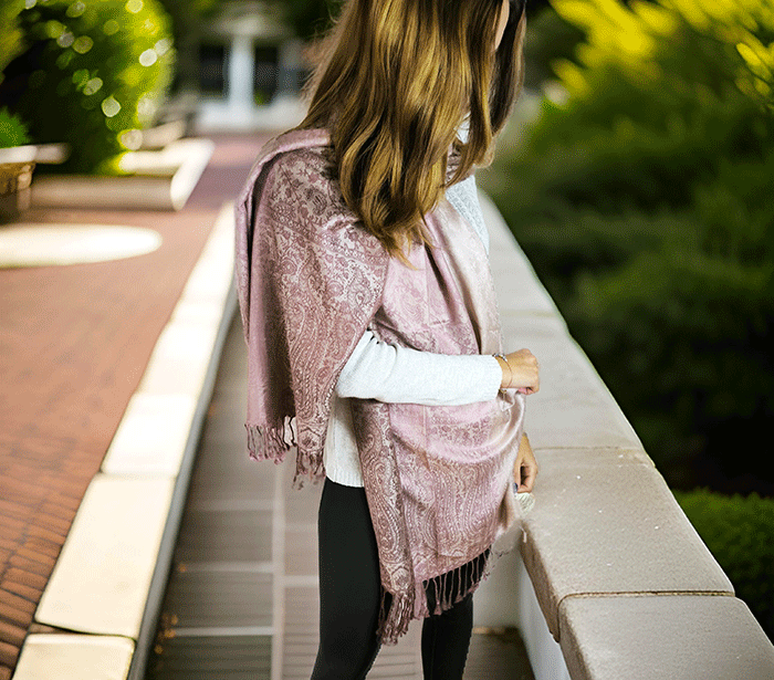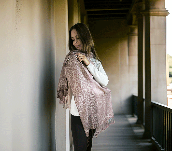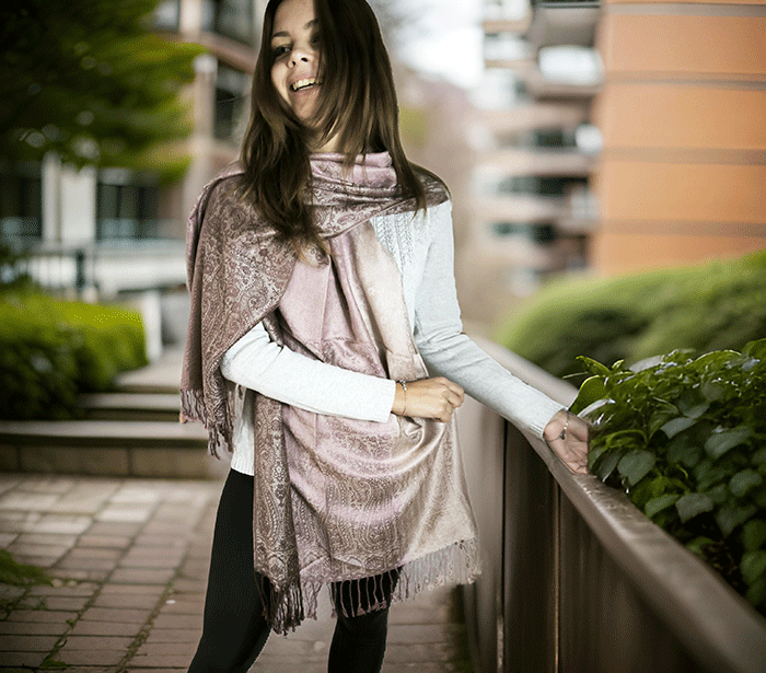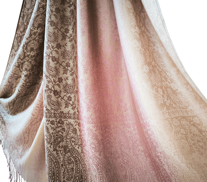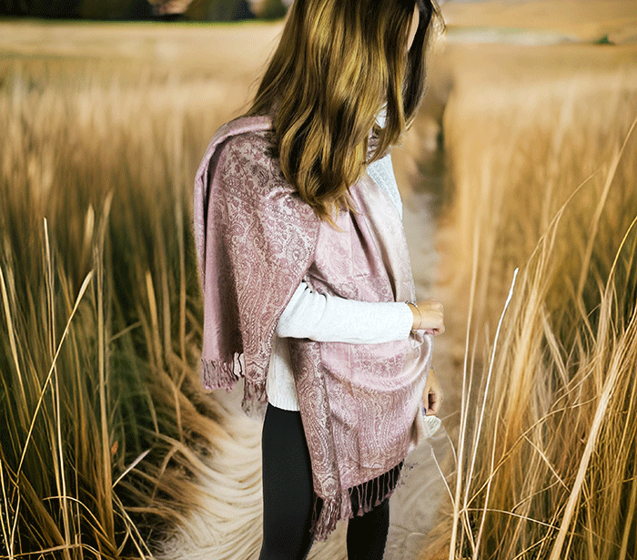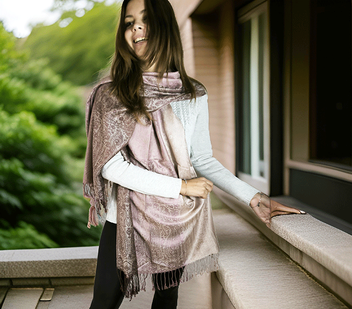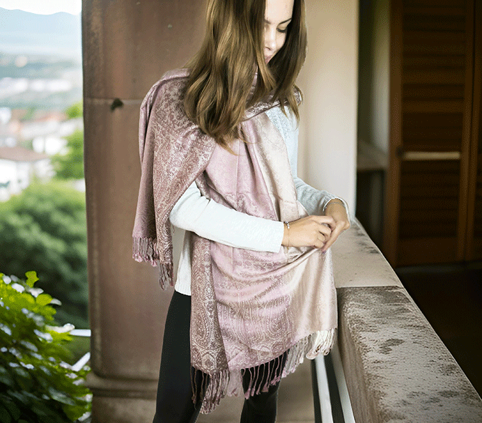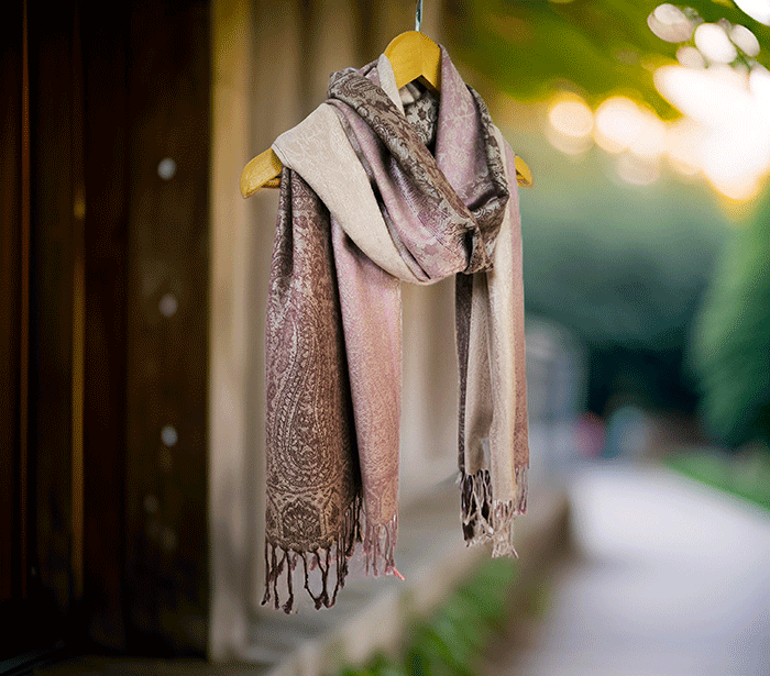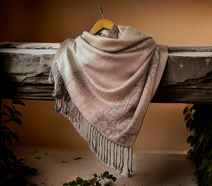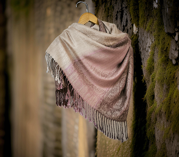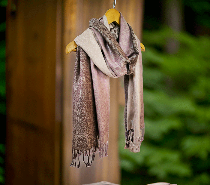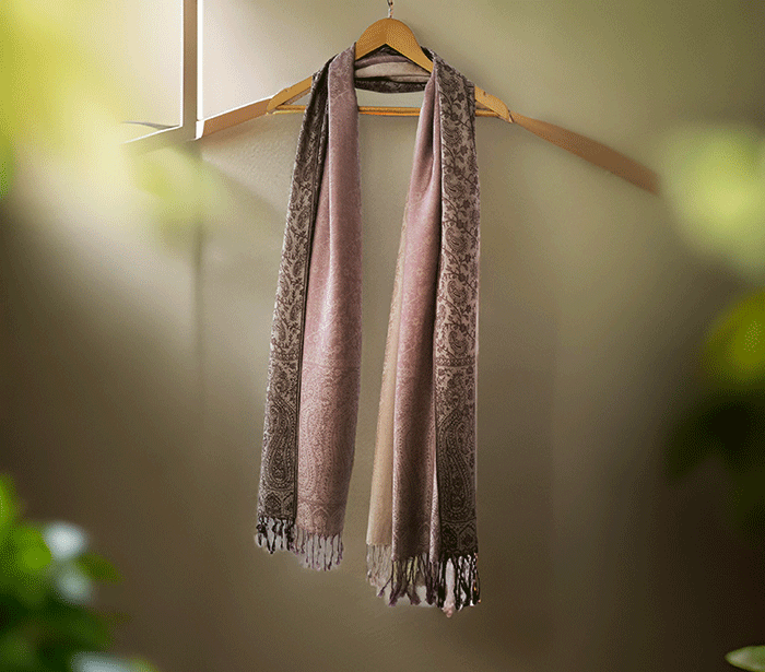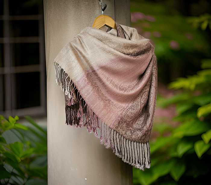 Šal v pašmina stilu iz naravnih materialov v rjavo-rožnato-bež odtenkih združuje eleganco, mehkobo in vsestranskost. Zaradi naravnih vlaken je izjemno mehak in prijeten na dotik, kar ga naredi popolnega za ljudi z občutljivo kožo. Je topel, a lahek, zato je primeren za nošenje okoli vratu v vseh mesecih, hkrati pa omogoča zračnost in udobje.