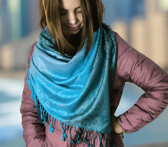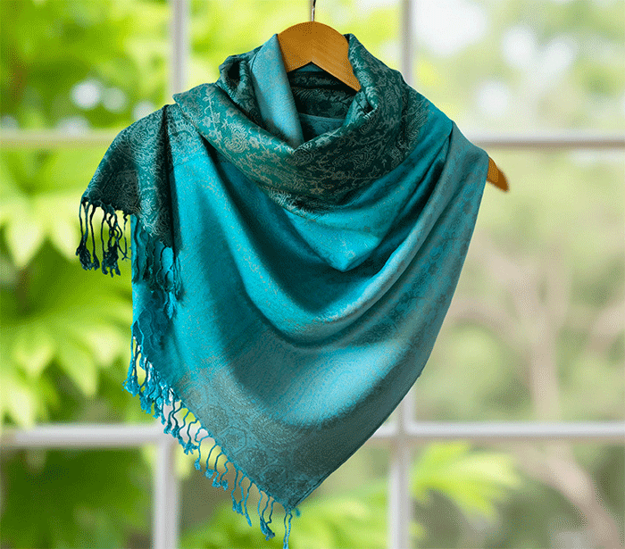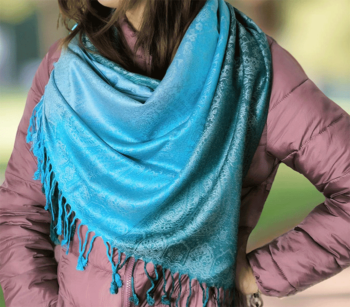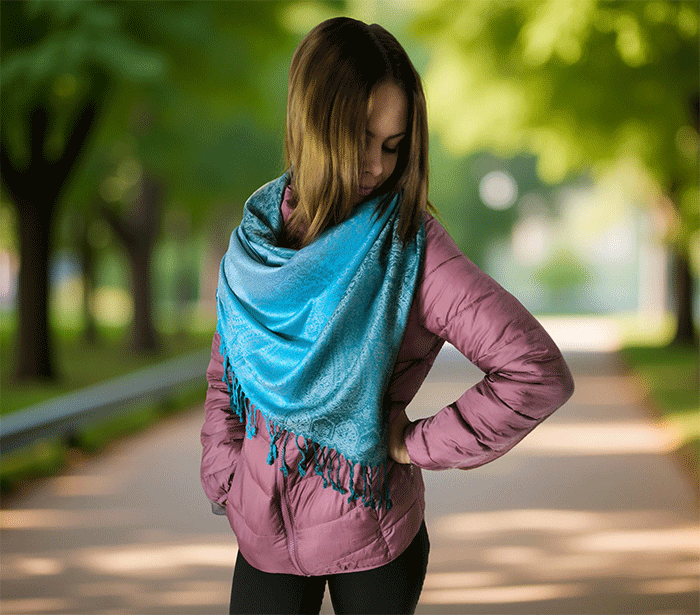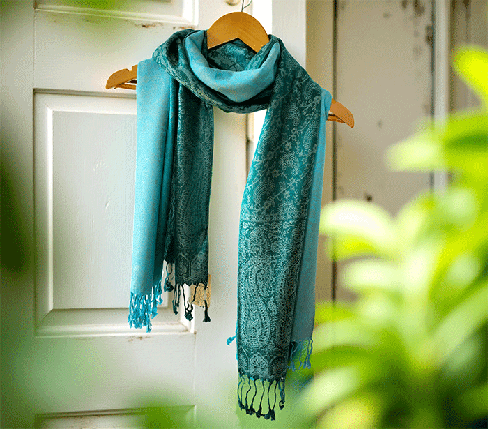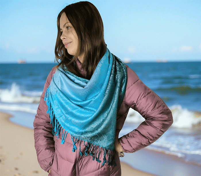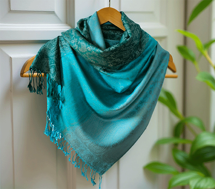 Šal mehkoba iz naravnih materialov v pašmina stilu ter turkizni barvi je eleganten in moderen dodatek, ki prinaša številne prednosti za počutje.