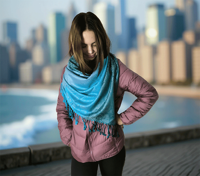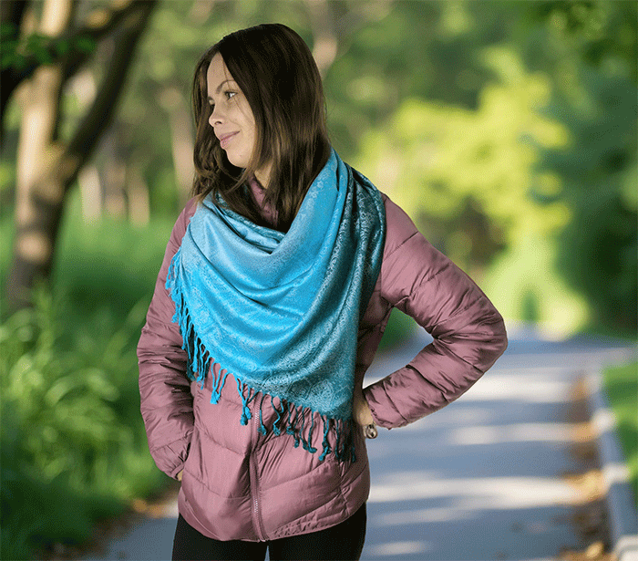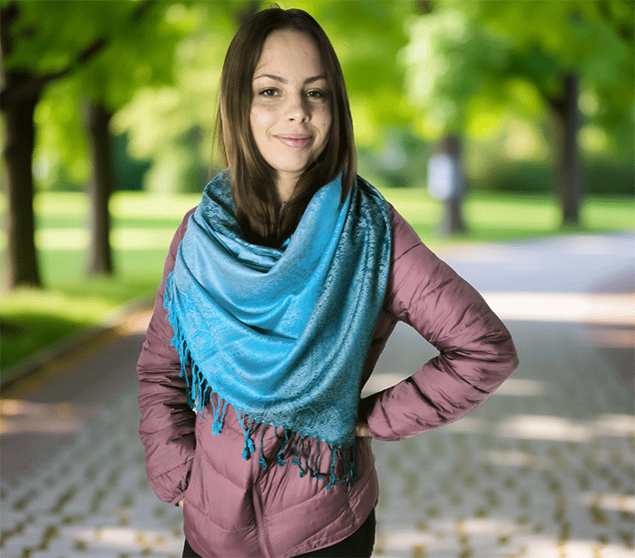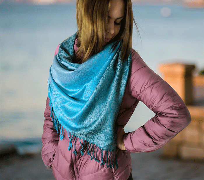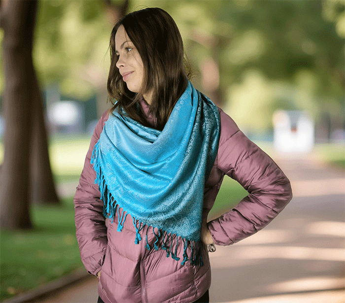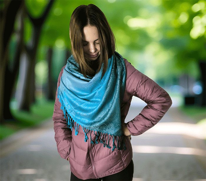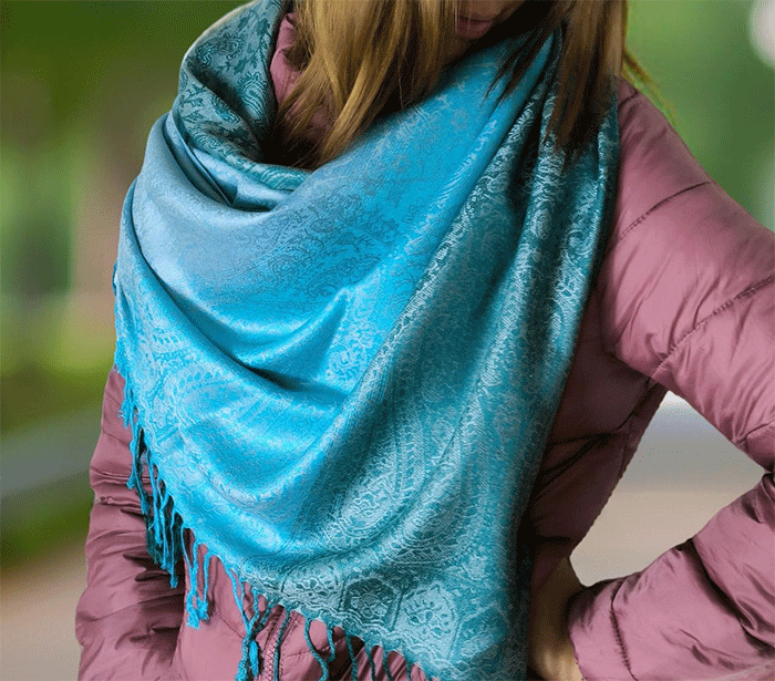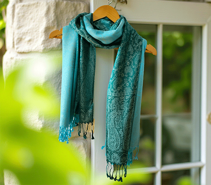 Šal mehkoba iz naravnih materialov v pašmina stilu ter turkizni barvi je eleganten in moderen dodatek, ki prinaša številne prednosti za počutje.
