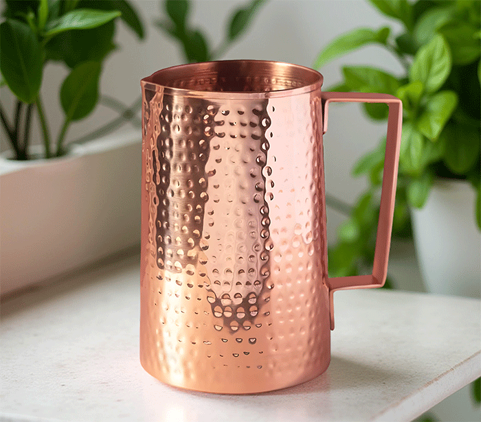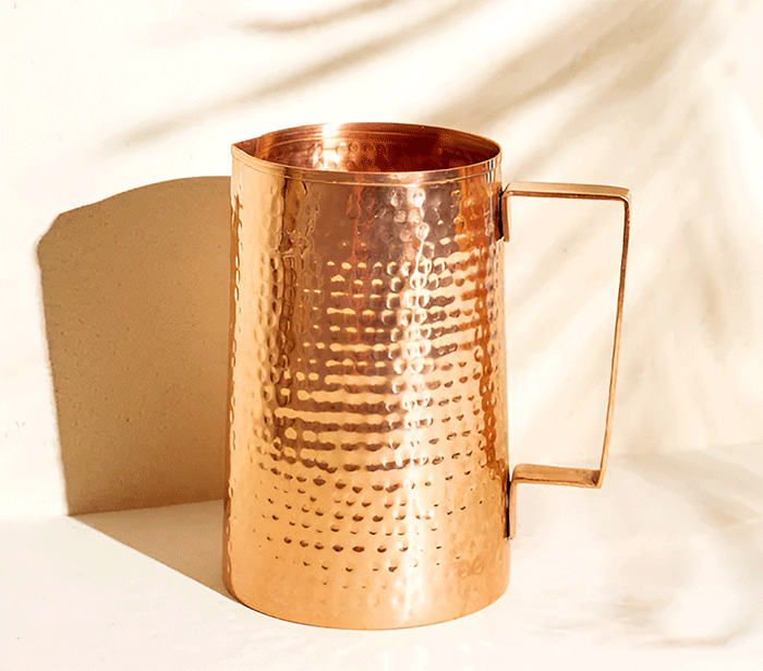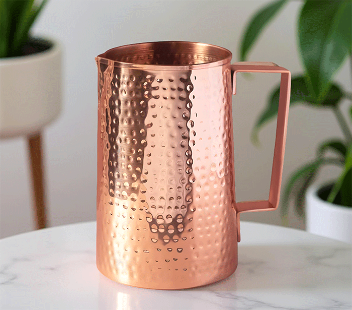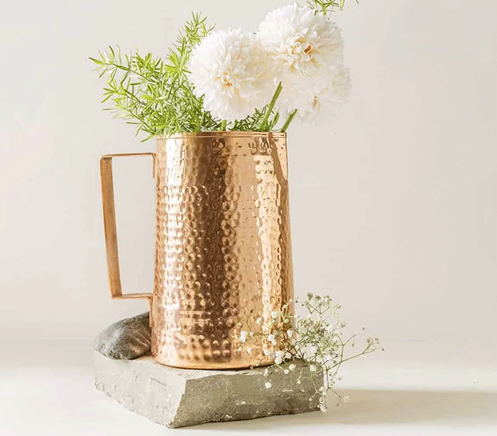 Uživajte v vsakem požirku vode iz 99,9 % čistega bakrenega vrča. Ta vrč ni le čudovit naravni izdelek, ampak tudi del tisočletne tradicije ajurvede, ki poudarja, kako pomembno je pitje vode iz bakra za ravnovesje v telesu.