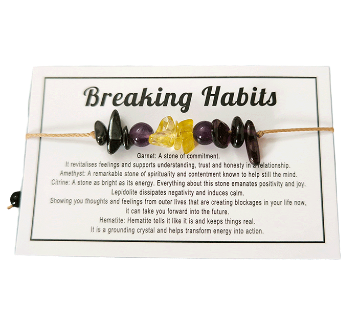 Zapestnica "Breaking Habits" ali opuščanje navad združuje kristale, ki podpirajo spremembe, notranjo moč in osebno rast. Pomaga pri opuščanju nekoristnih vzorcev ter odpiranju poti za nove, pozitivne navade.