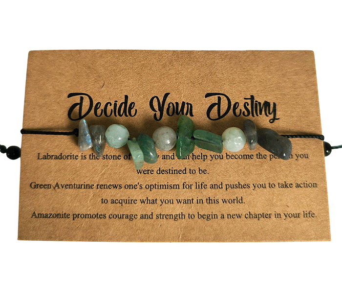 Zapestnica "Decide Your Destiny" je ustvarjena za tiste, ki želijo prevzeti nadzor nad svojim življenjem in soustvarjati svojo usodo. Združuje kristale, ki spodbujajo notranjo moč, jasnost in pogum za sprejemanje odločitev ter premagovanje življenjskih izzivov.