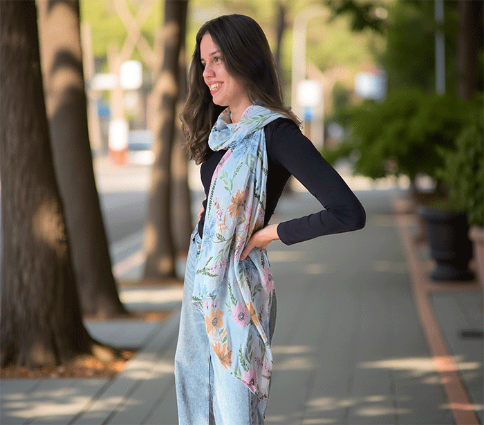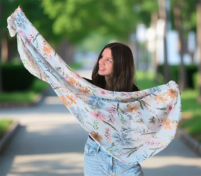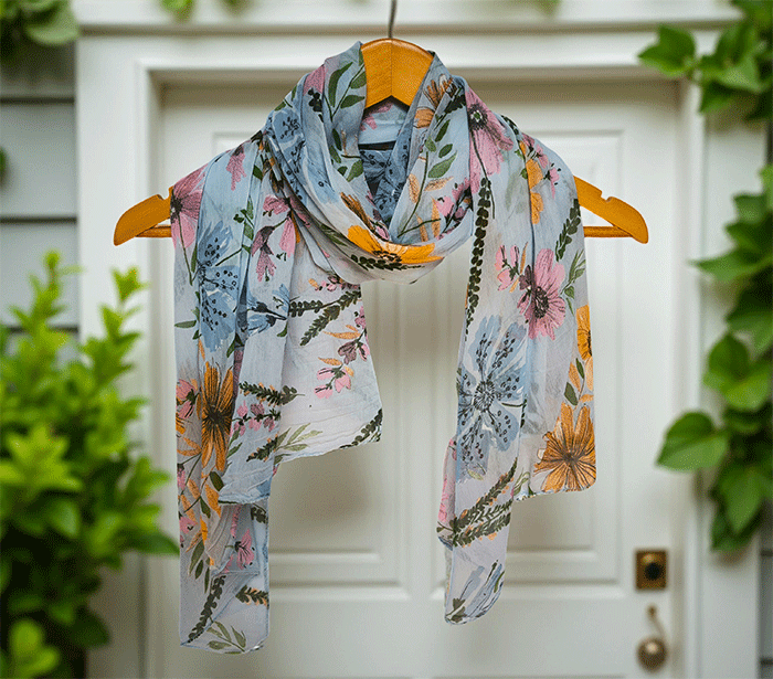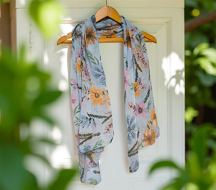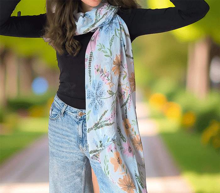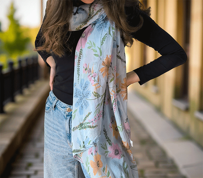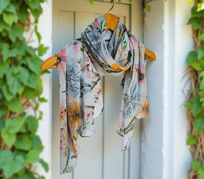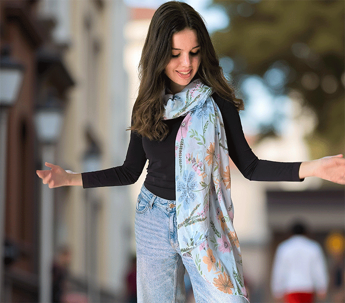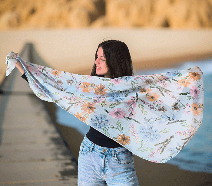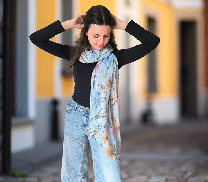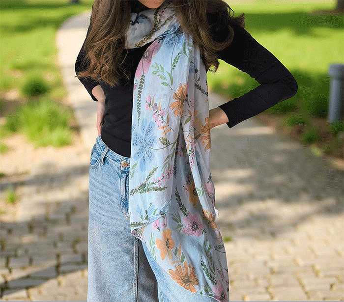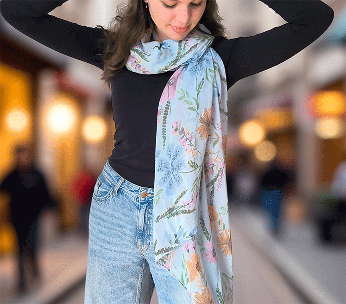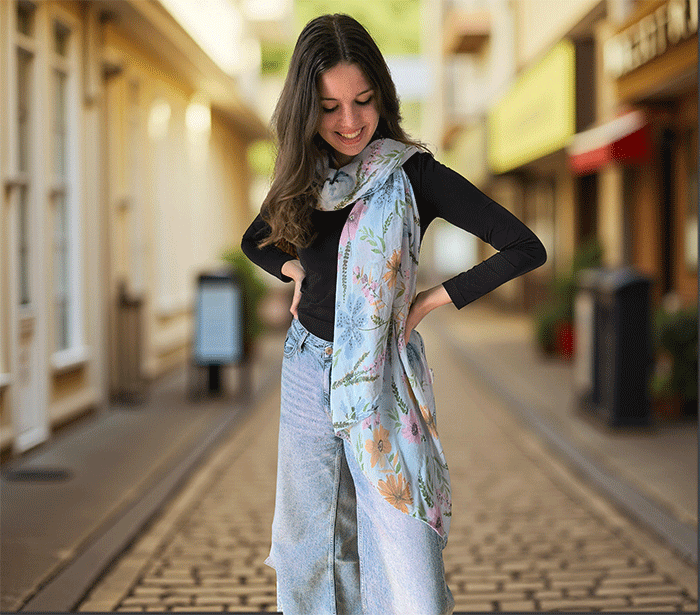 Odkrijte ženski šal s cvetovi, popoln modni šal za poletne in prehodne dni. Narejen iz nežne mešanice mehkega bombaža in svile, ta ženski šal vas bo očaral s svojo lahkotnostjo, prijetno teksturo in igrivim vzorcem cvetlic. Je izjemno nosljiv, koži prijazen in primeren tudi za občutljivo kožo, saj naravni materiali dihajo in zagotavljajo udobje skozi ves dan.