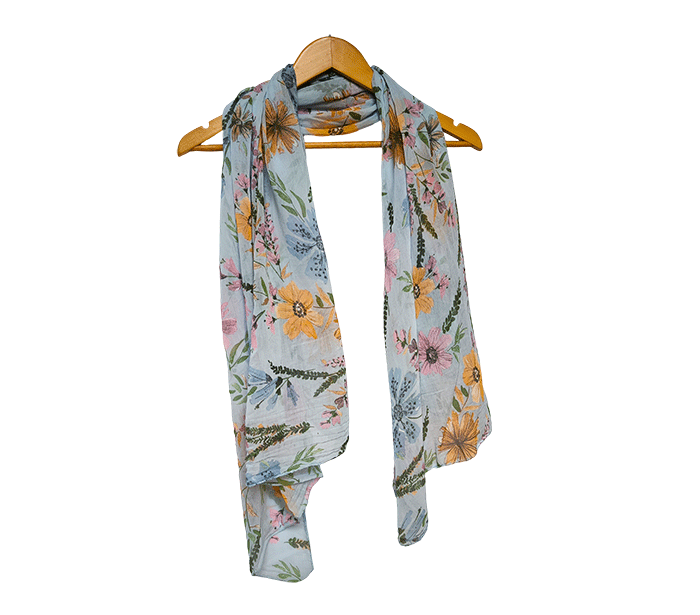Ženski šal Bliss svetlo moder s cvetovi - bombaž svila