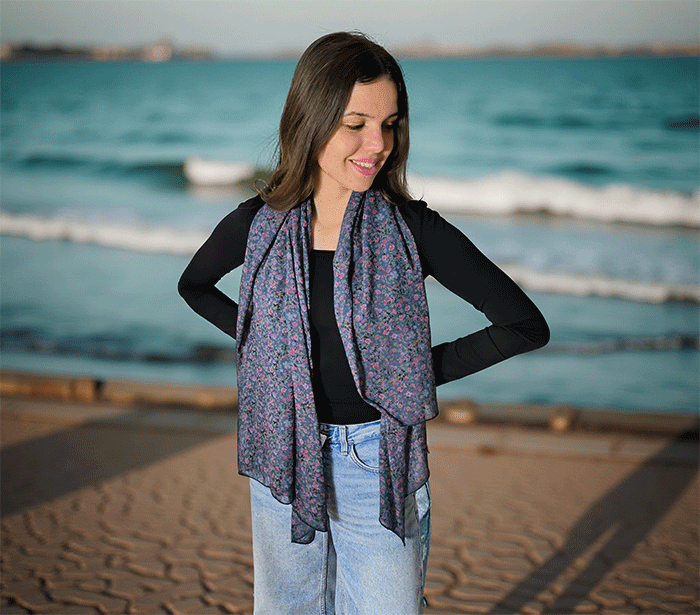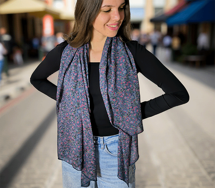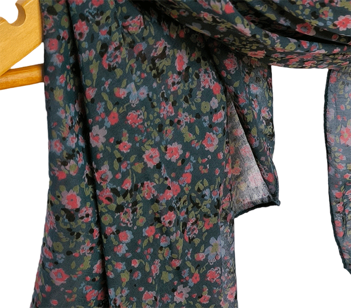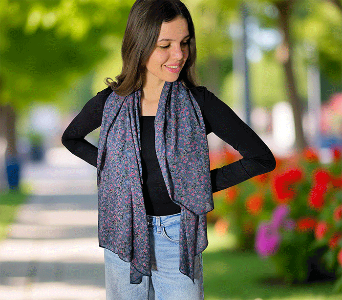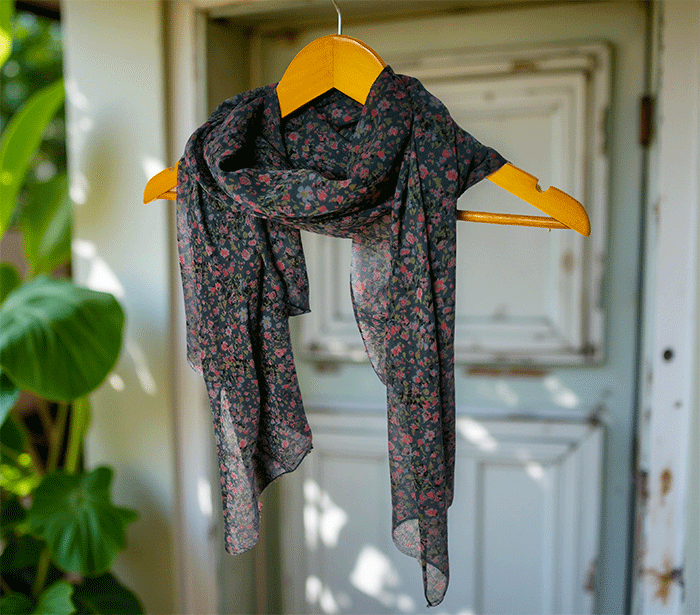 Ta modni ženski šal z rožicami ni le čudovit modni kos, ampak tudi vaš spremljevalec za dobro počutje. Mehka tkanina vas bo nežno ovila in ustvarila občutek topline in sproščenosti. Poletni ženski šal, ki hkrati deluje tudi kot lahek prehodni šal, je vsestranski dodatek k vsakemu izgledu – za sprehod po mestu, večerni izhod ali potovanje.