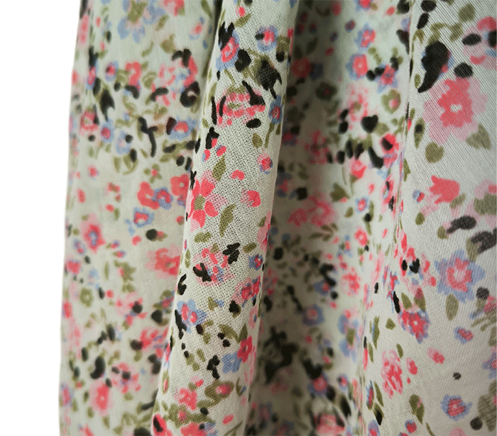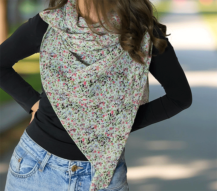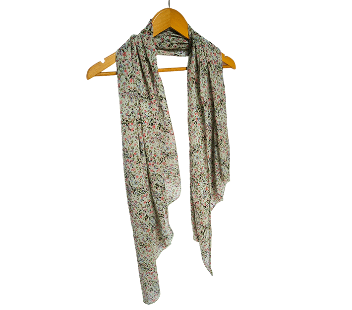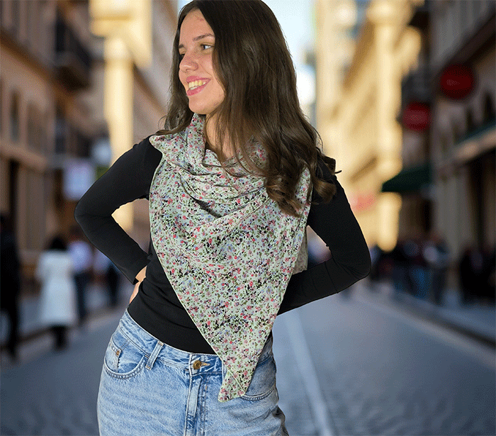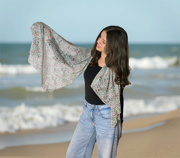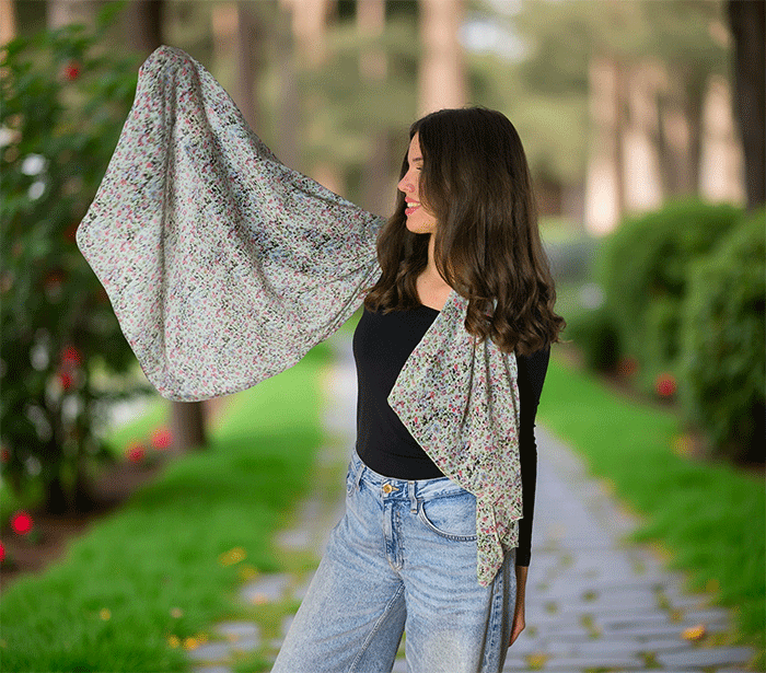 Ta modni ženski šal z rožicami ni le čudovit modni kos, ampak tudi vaš spremljevalec za dobro počutje. Mehka tkanina vas bo nežno ovila in ustvarila občutek topline in sproščenosti. Poletni ženski šal, ki hkrati deluje tudi kot lahek prehodni šal, je vsestranski dodatek k vsakemu izgledu – za sprehod po mestu, večerni izhod ali potovanje.