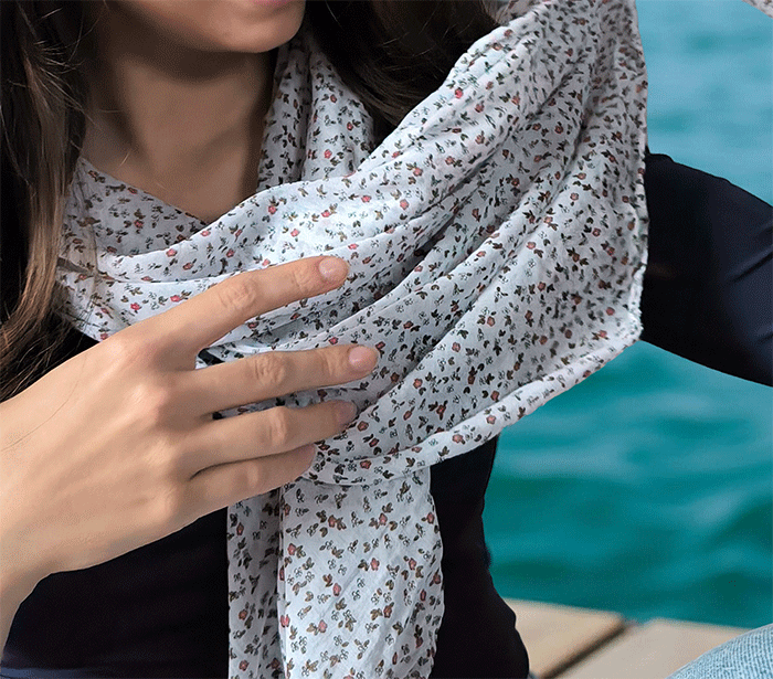 Ta modni ženski šal z rožicami ni le čudovit modni kos, ampak tudi vaš spremljevalec za dobro počutje. Mehka tkanina vas bo nežno ovila in ustvarila občutek topline in sproščenosti. Poletni ženski šal, ki hkrati deluje tudi kot lahek prehodni šal, je vsestranski dodatek k vsakemu izgledu – za sprehod po mestu, večerni izhod ali potovanje.