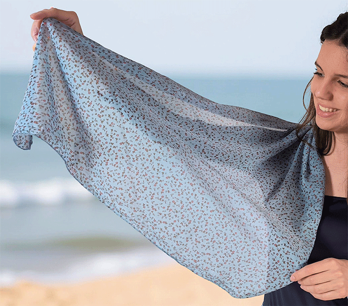 Ta modni ženski šal z rožicami ni le čudovit modni kos, ampak tudi vaš spremljevalec za dobro počutje. Mehka tkanina vas bo nežno ovila in ustvarila občutek topline in sproščenosti. Poletni ženski šal, ki hkrati deluje tudi kot lahek prehodni šal, je vsestranski dodatek k vsakemu izgledu – za sprehod po mestu, večerni izhod ali potovanje.